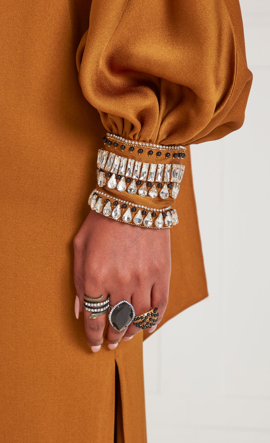 Made using burnished crepe back satin, sourced from trustworthy and long-standing suppliers, chosen for its superior textures and as a fitting base for the exquisite embroidered beadwork.