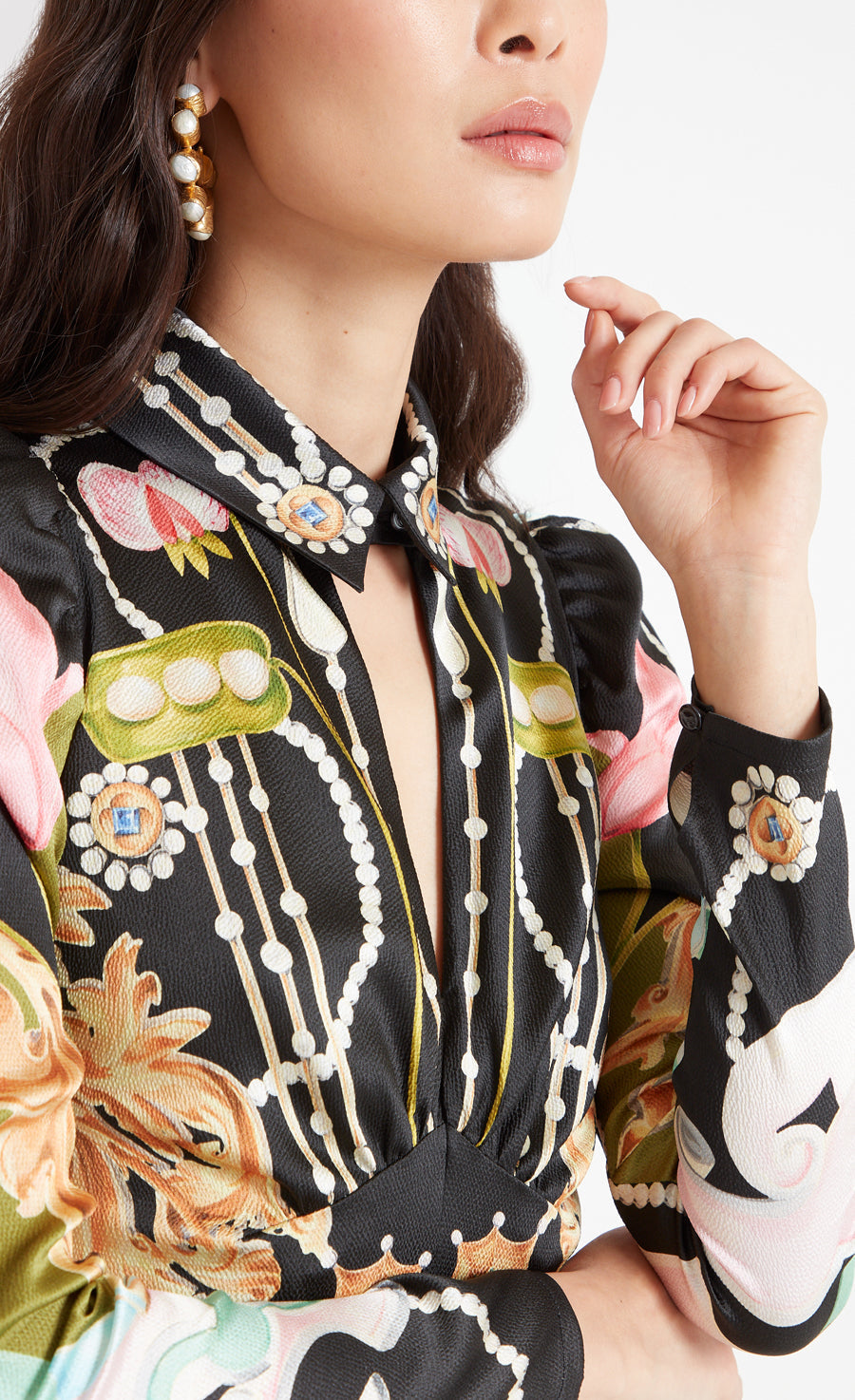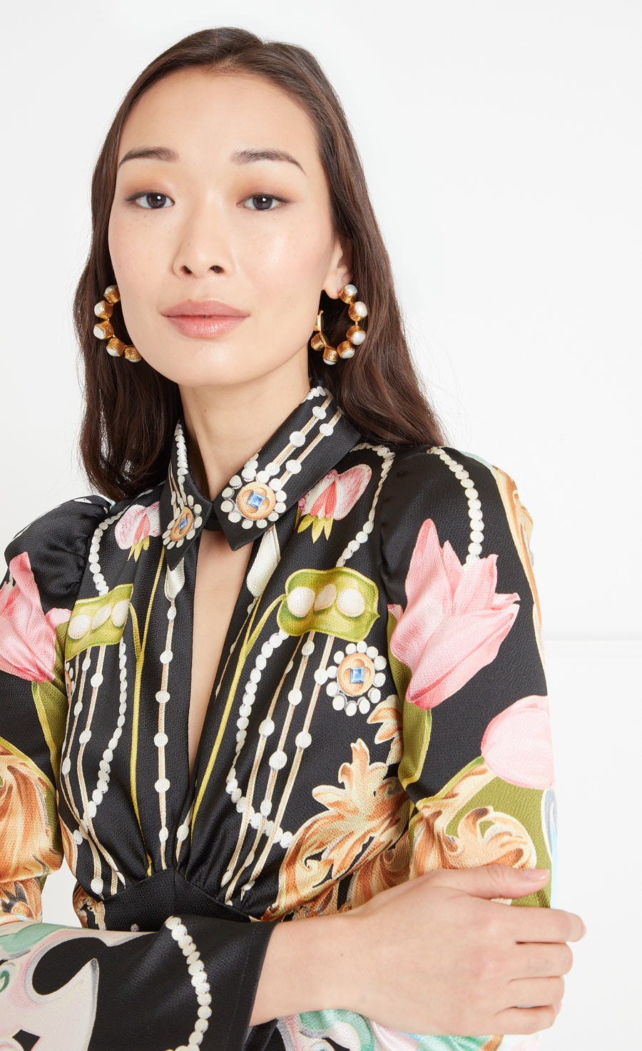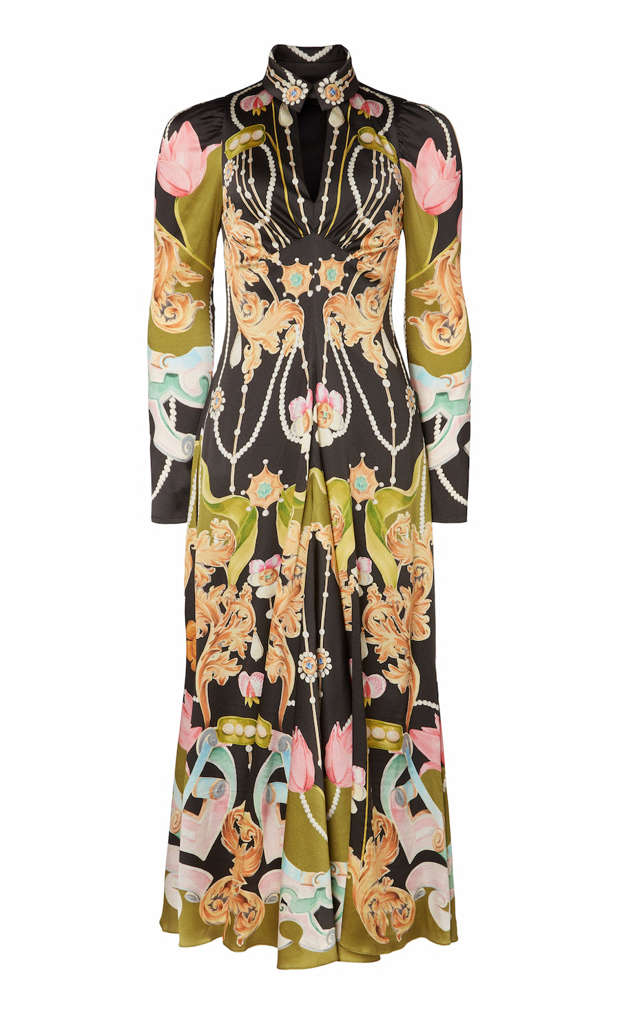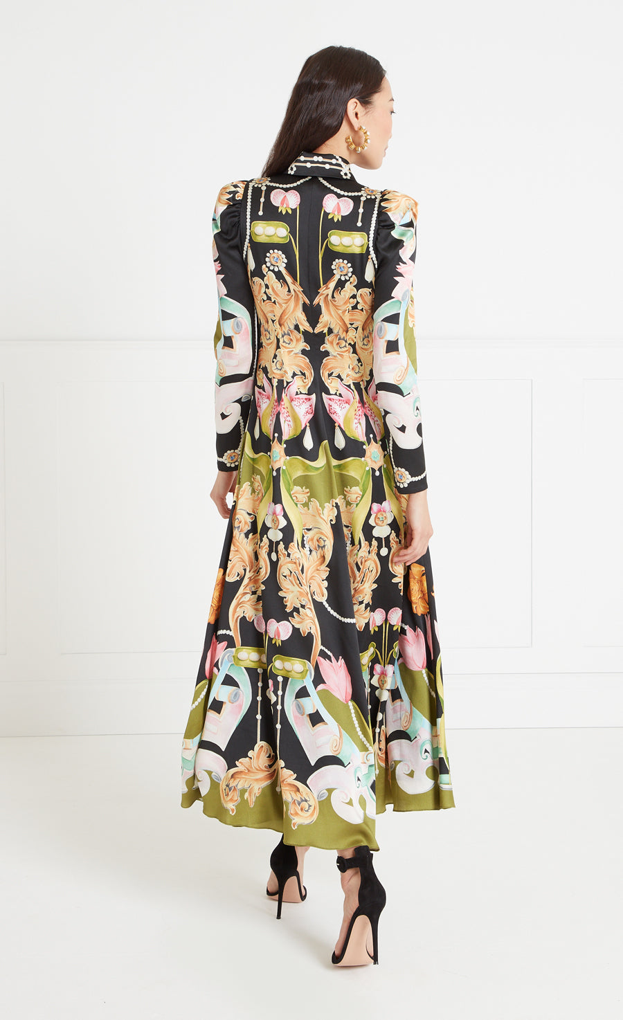 Exuding a majestic air, the Akira eveningwear story is made from a luxurious hammered silk satin, with a patina texture, sumptuous drape and burnished fluidity of movement. Painstakingly hand-painted, composed into a surreal fresco-style artwork, featuring block colour segments and bold borders that bring a modernity to the regal smattering of jewels and pearls, filigree motifs and heraldic scrolls.?