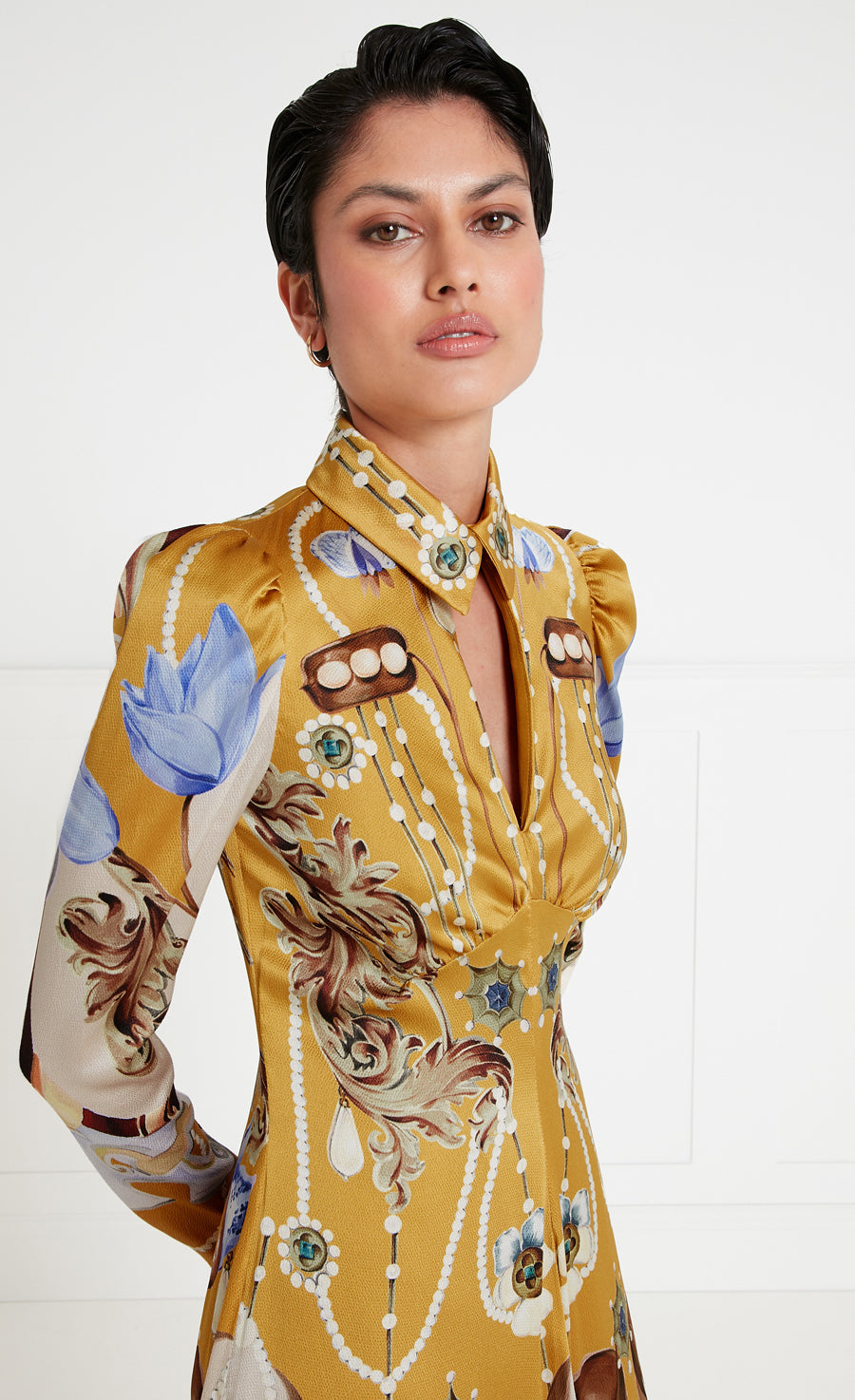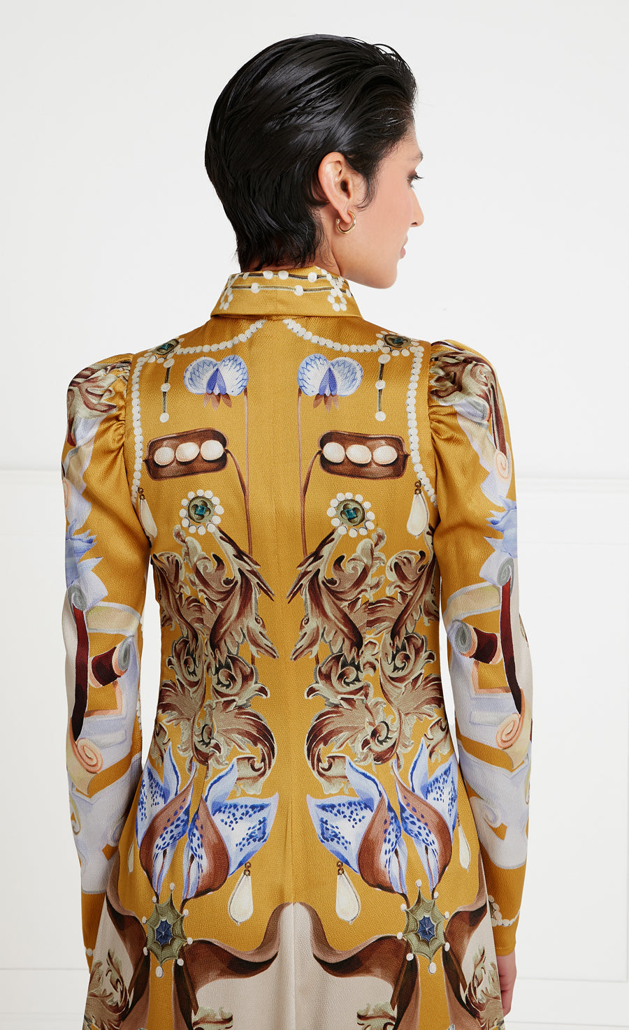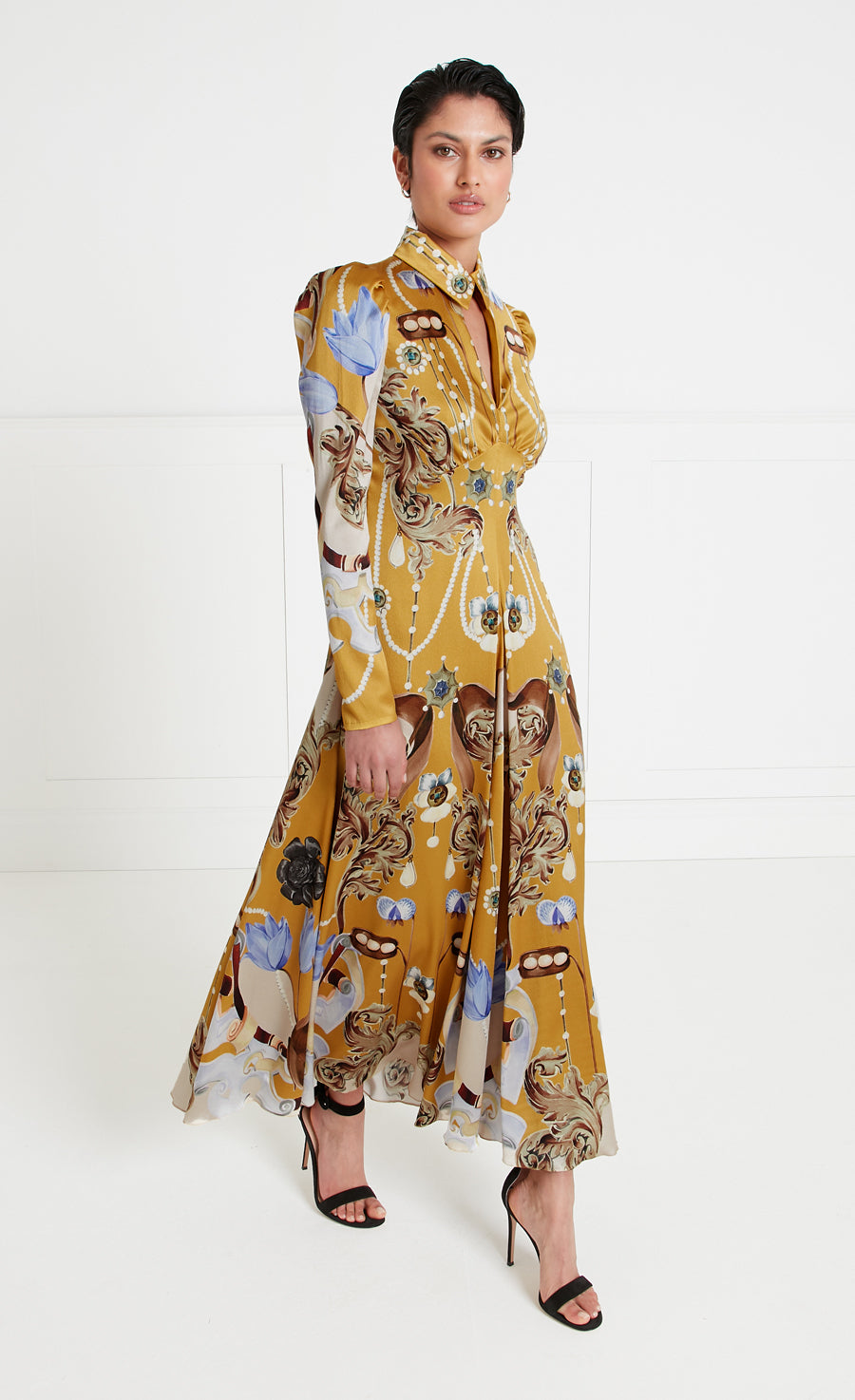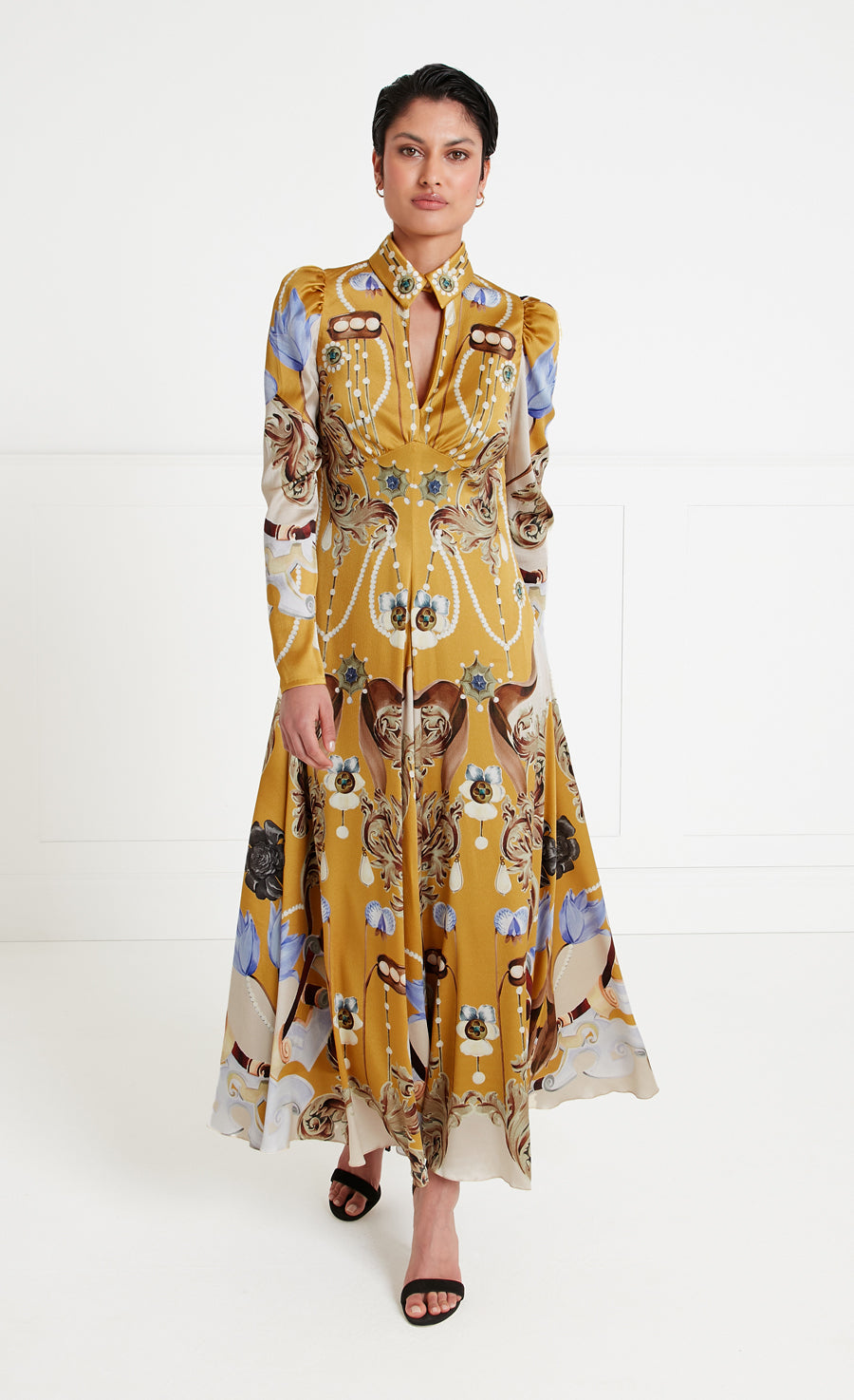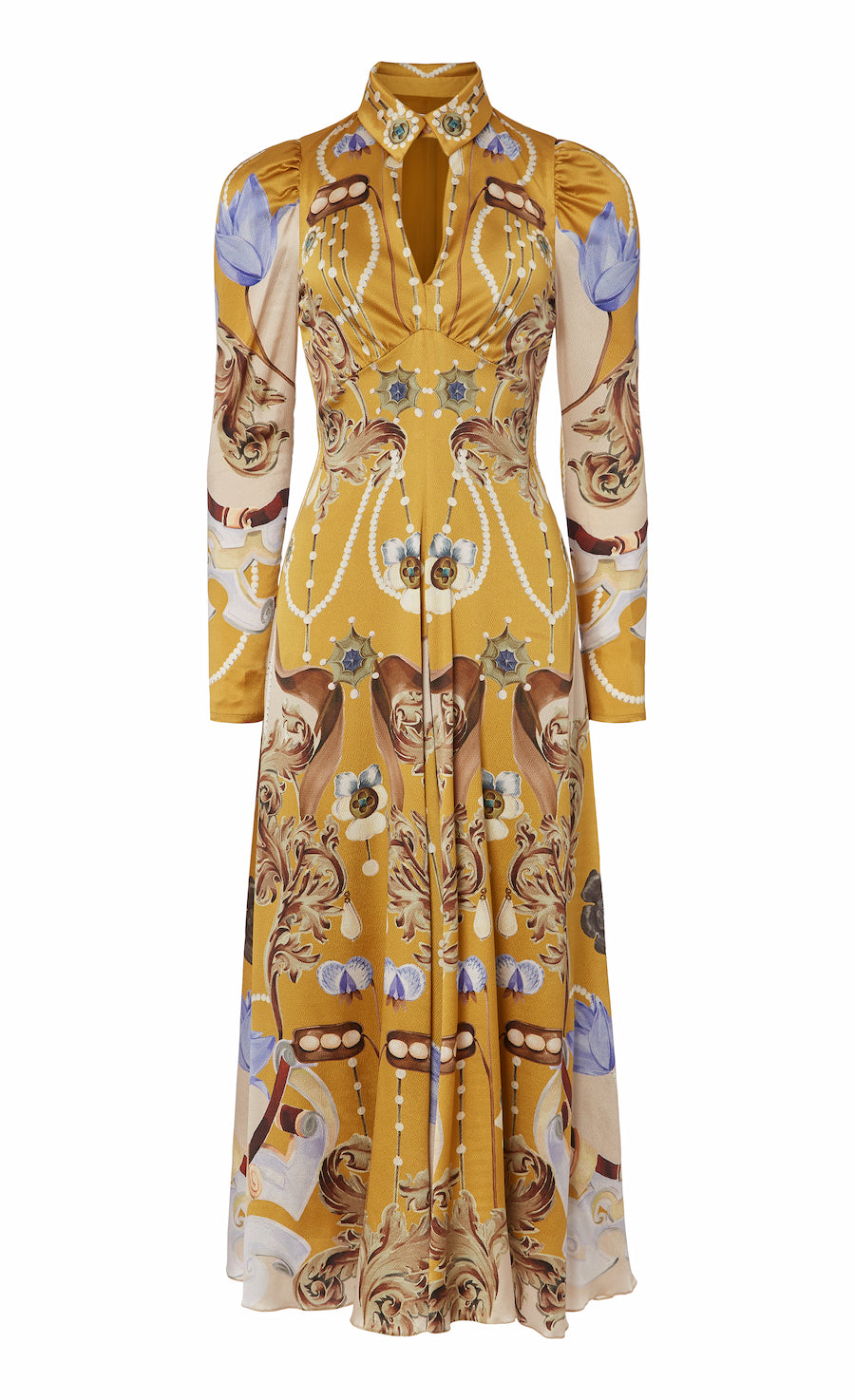 Exuding a majestic air, the Akira eveningwear story is made from a luxurious hammered silk satin, with a patina texture, sumptuous drape and burnished fluidity of movement. Painstakingly hand-painted, composed into a surreal fresco-style artwork, featuring block colour segments and bold borders that bring a modernity to the regal smattering of jewels and pearls, filigree motifs and heraldic scrolls.?
