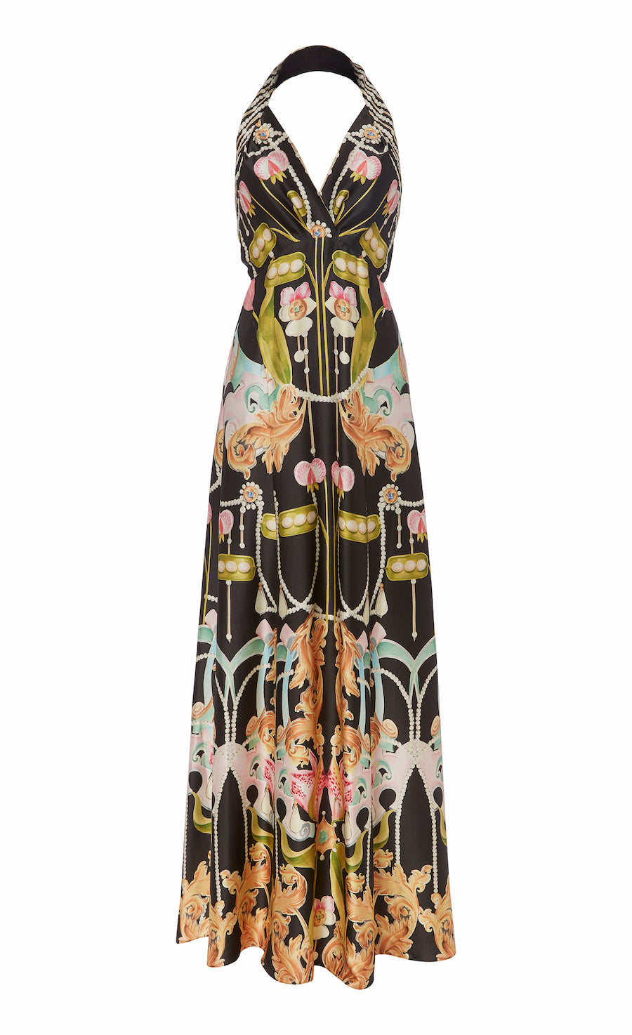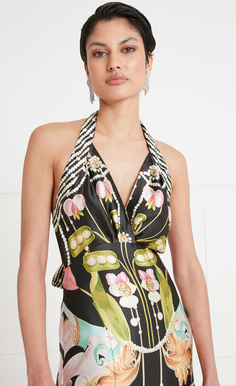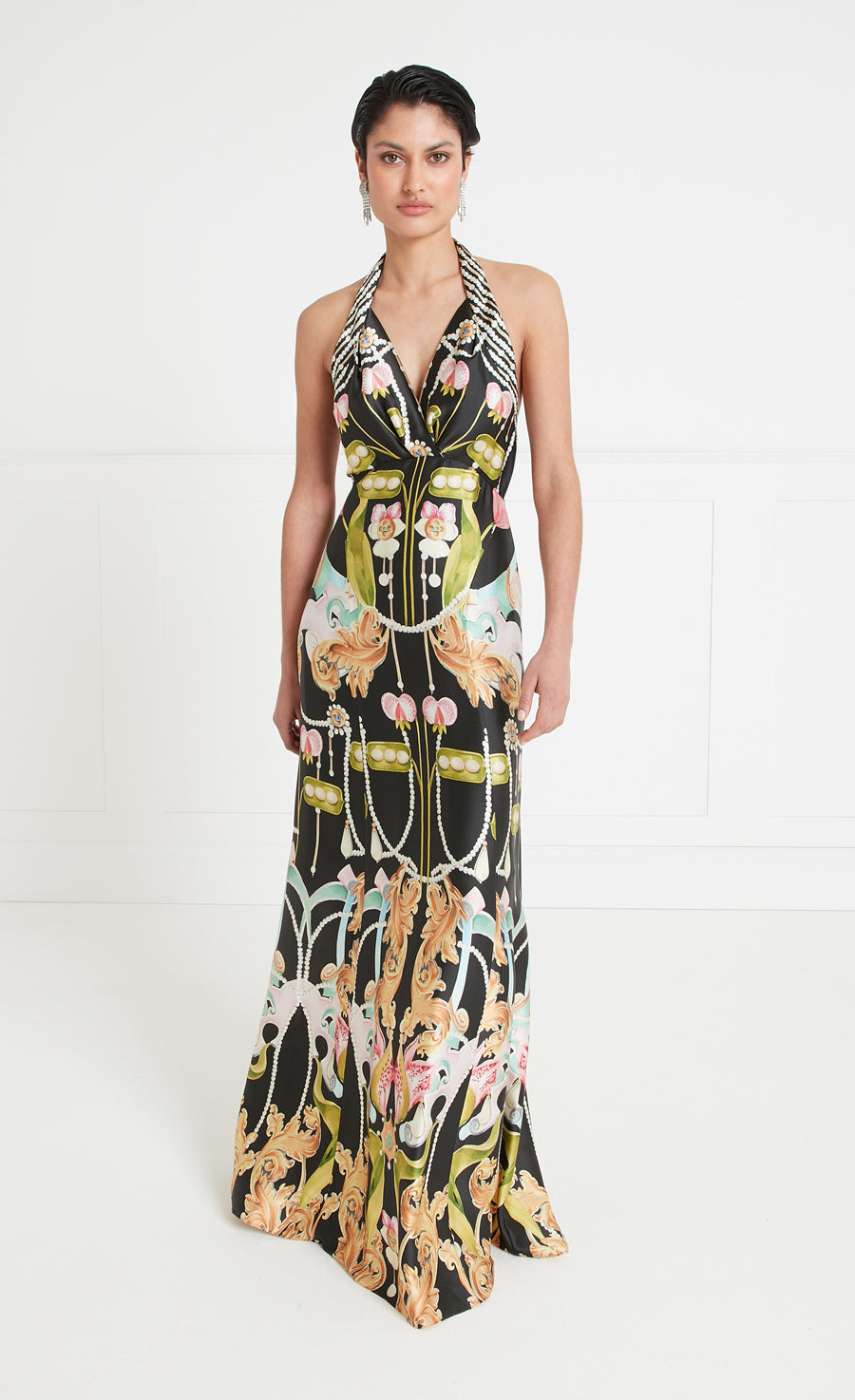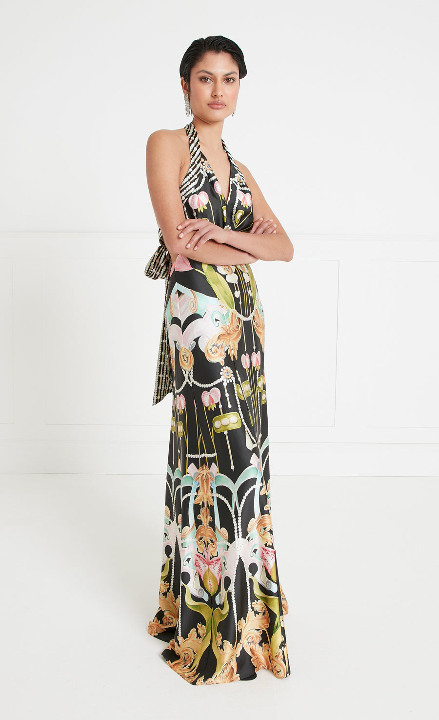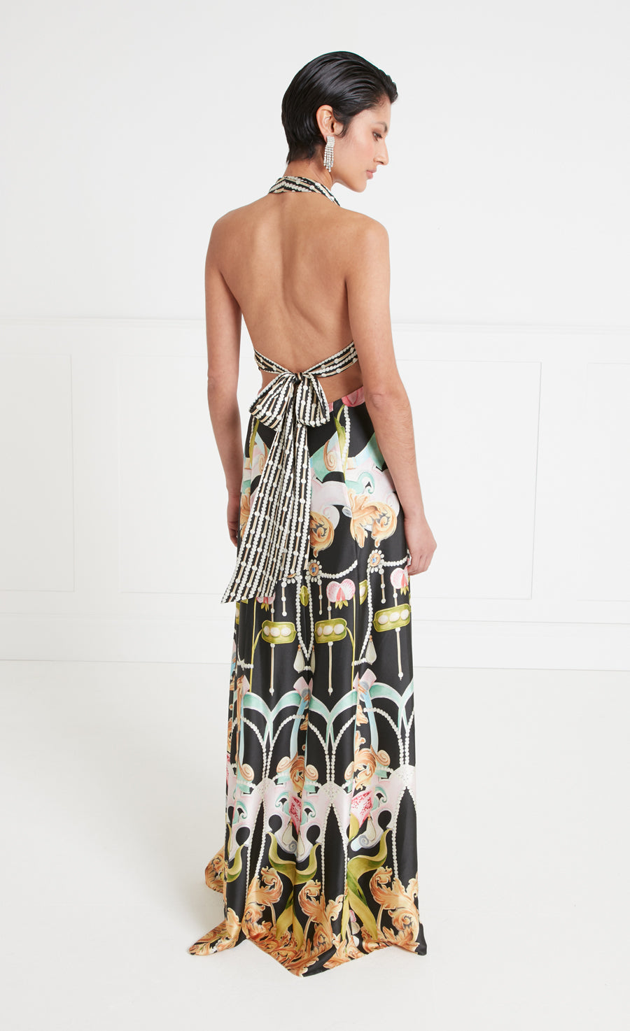 Impeccably cut, the Akira halterneck dress combines classical elegance and understated femininity, with a halter neckline framing the gathered chest panels and fastening in a bow, the curved waistline flowing to a low back, the floor-length skirt draping to fluid tailored perfection.