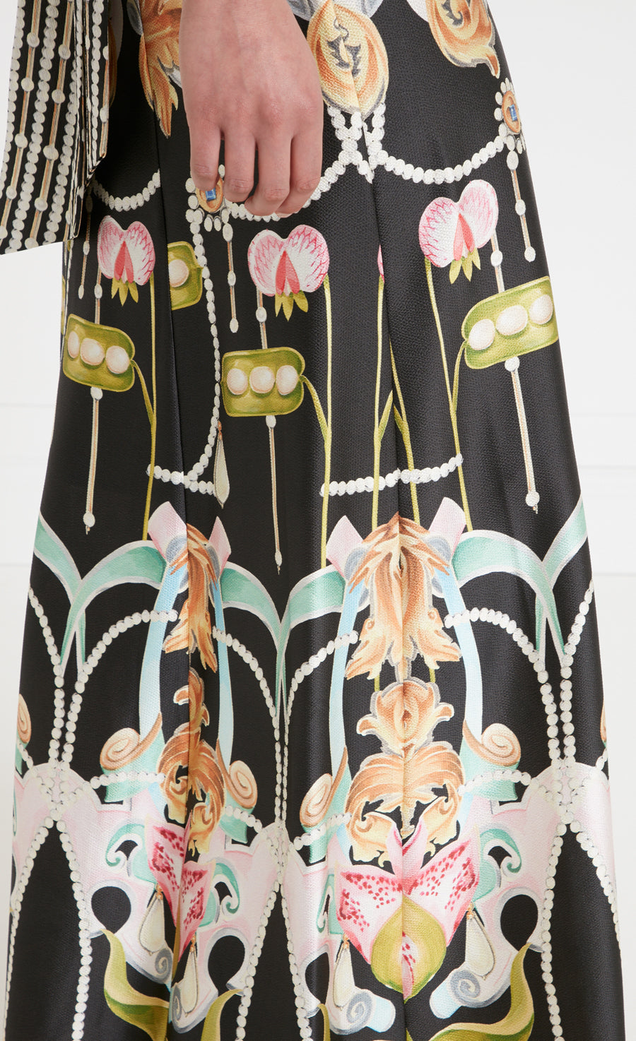 Exuding a majestic air, the Akira eveningwear story is made from a luxurious hammered silk satin, with a patina texture, sumptuous drape and burnished fluidity of movement. Painstakingly hand-painted, composed into a surreal fresco-style artwork, featuring block colour segments and bold borders that bring a modernity to the regal smattering of jewels and pearls, filigree motifs and heraldic scrolls.