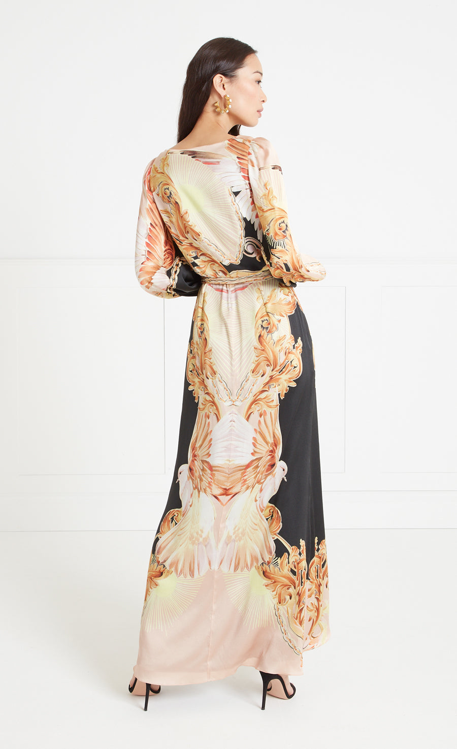 Exuding a majestic air, the Akira eveningwear story is made from a luxurious hammered silk satin, with a patina texture, sumptuous drape and burnished fluidity of movement. Painstakingly hand-painted, composed into a surreal fresco-style artwork, featuring block colour segments and bold borders that bring a modernity to the regal smattering of jewels and pearls, filigree motifs and heraldic scrolls.