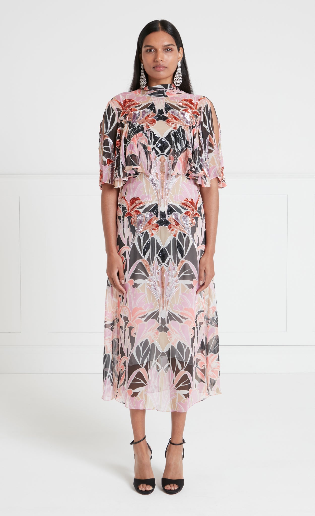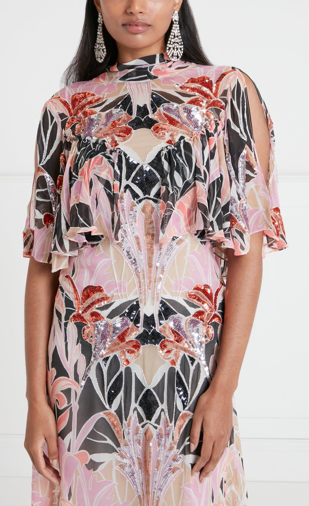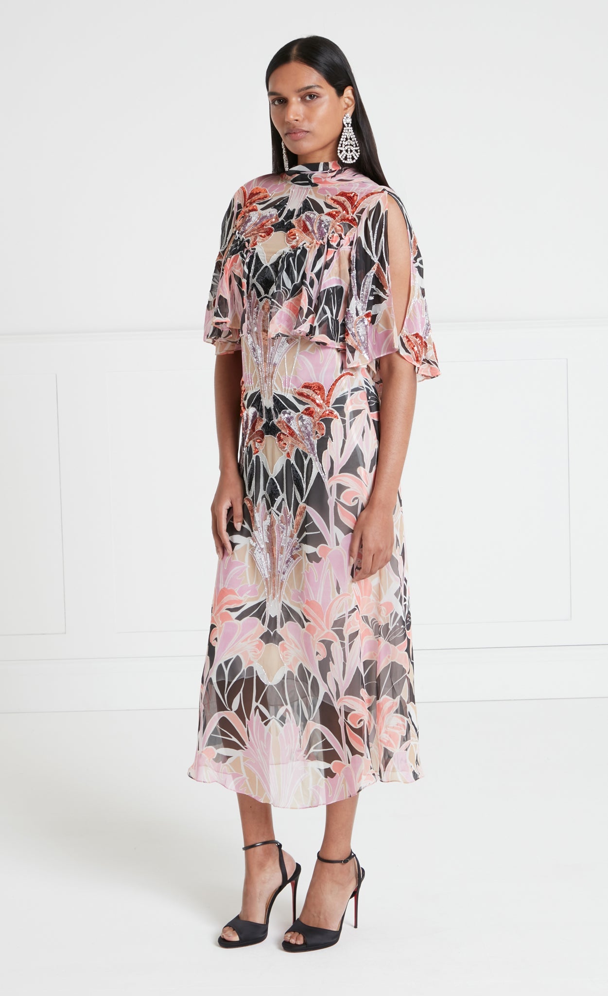 Blending artistic influences with contemporary design, the Alani Dress is both sophisticated and unmistakably Temperley London. Featuring open slit sleeves, a cascading frill cape, and delicate frill detailing at the bust, creates a fluid, full-length silhouette. The asymmetric ruffle skirt adds movement and dynamism, making this a captivating choice for any eveningwear occasion.