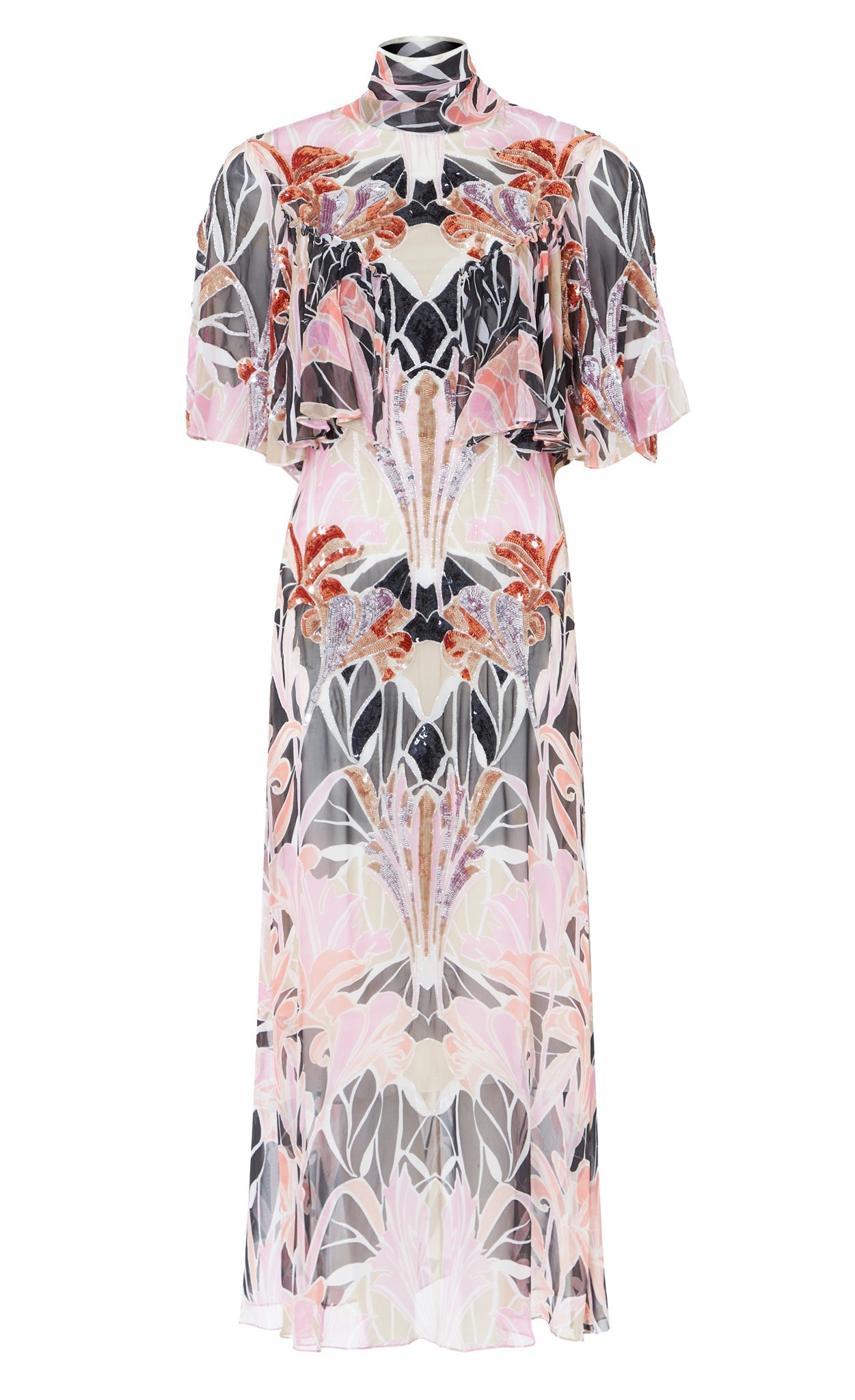The semi-sheer printed georgette features an original artwork, hand-painted in-house. Meticulously engineered for composition and seamless flow, it is draped onto toile and placed on full-scale garment patterns. The sequins are hand-embroidered by artisans.