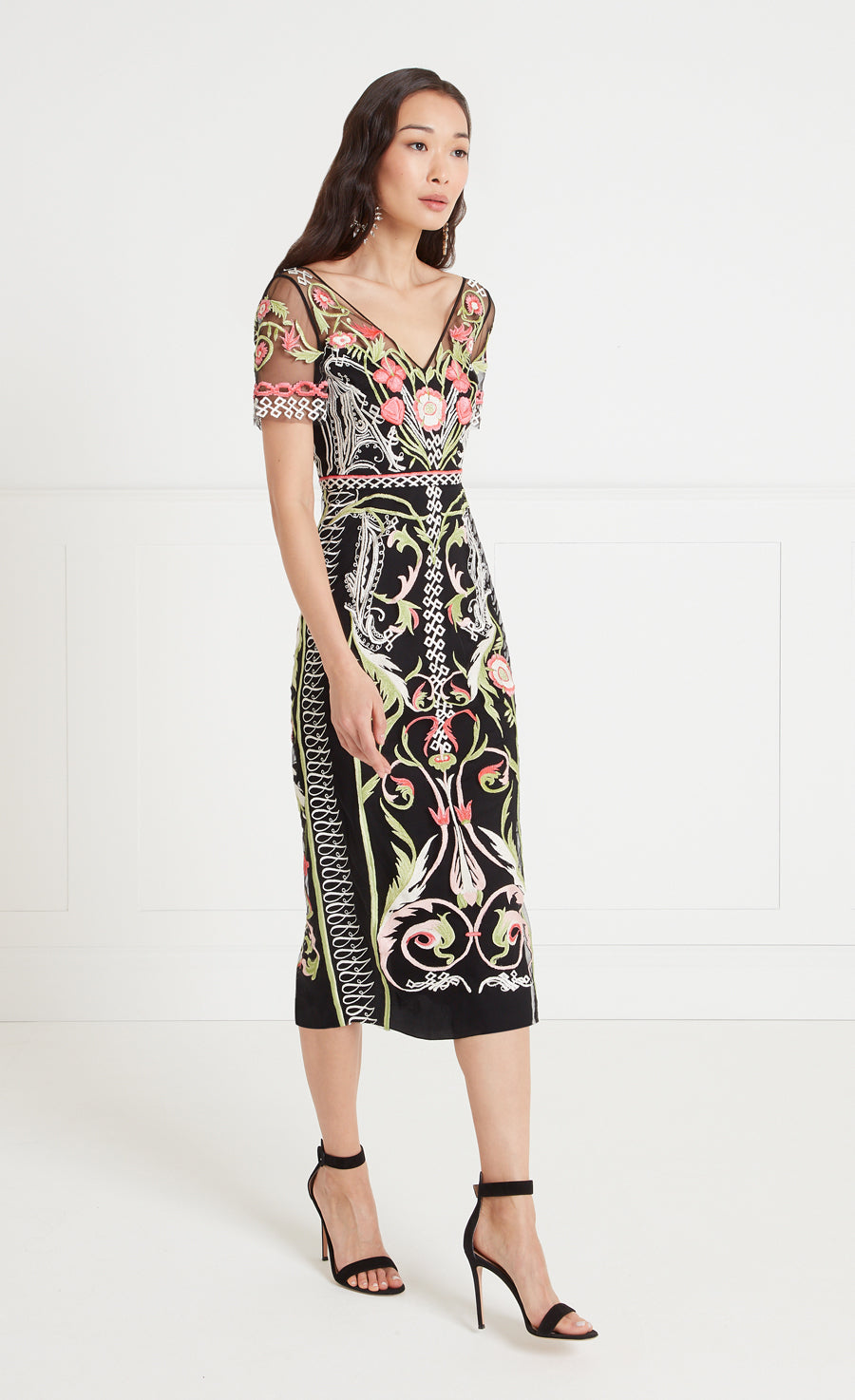 With a sharp, classical shape, the Alessia midi dress cuts a strikingly elegant figure, with a neat V-neckline, cinched waist and form-framing mid-length skirt. Made from soft Italian tulle, decorated with fine hand-embroidered detailing, designed meticulously for the perfect fit, it exudes a clean modernity.