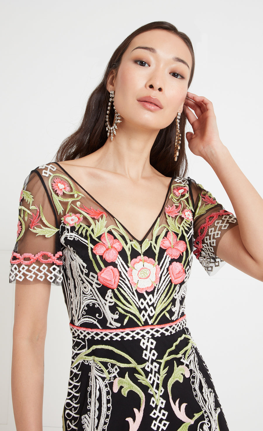 Offbeat yet regal, the Alessia story offers a stunning range of eveningwear pieces. Strong, timeless silhouettes provide a base for hand-guided sequin and stitchwork: Tudor rosebuds interweave harmoniously with calligraphic flourishes and Italian fresco-inspired filigree motifs, with elements reminiscent of Jacobean blackwork, reimagined in bold contrasting shades.