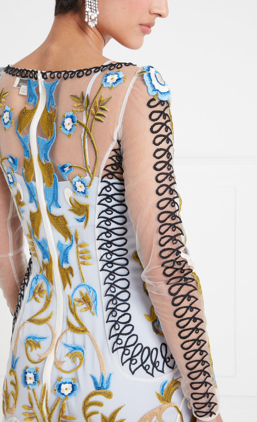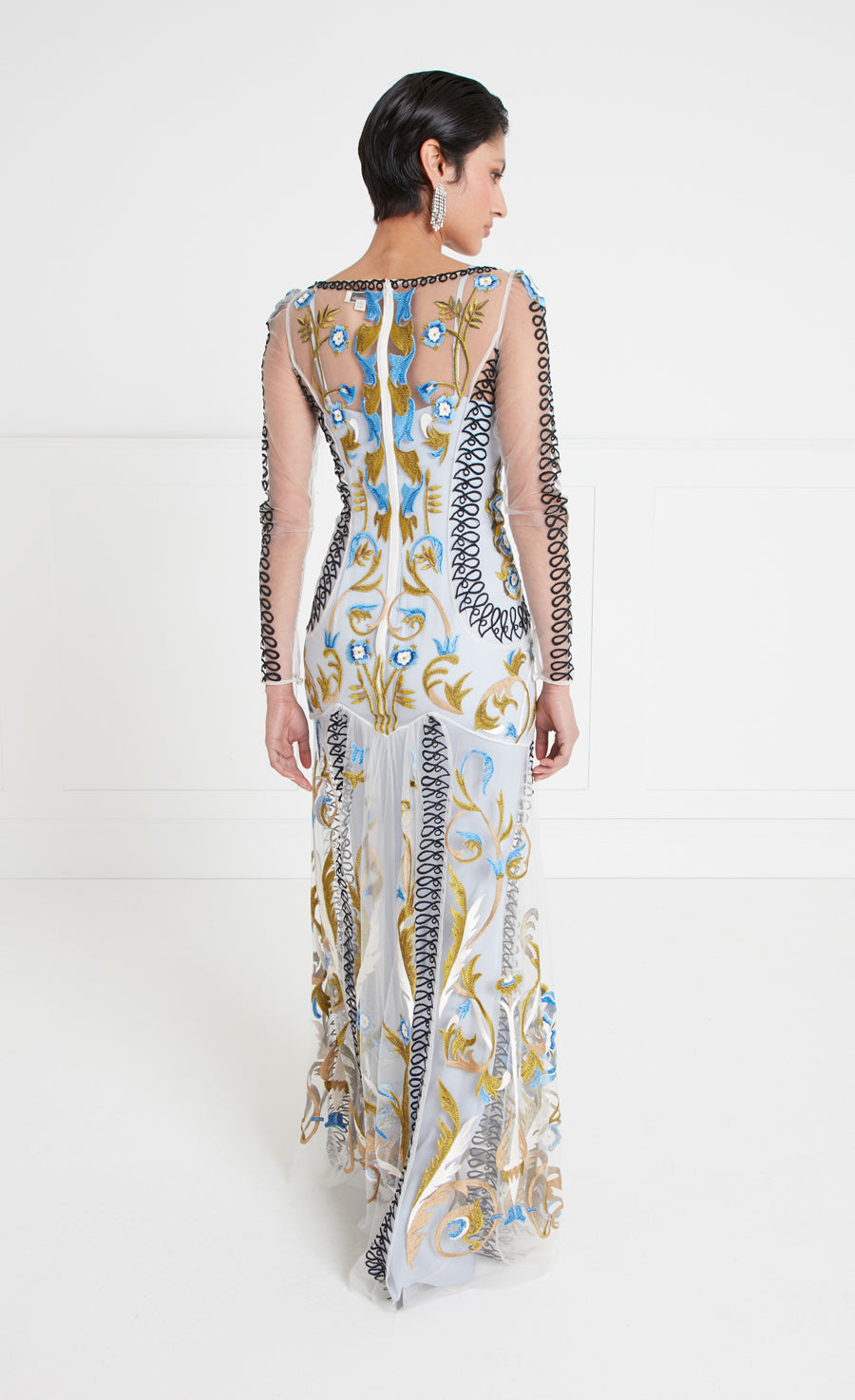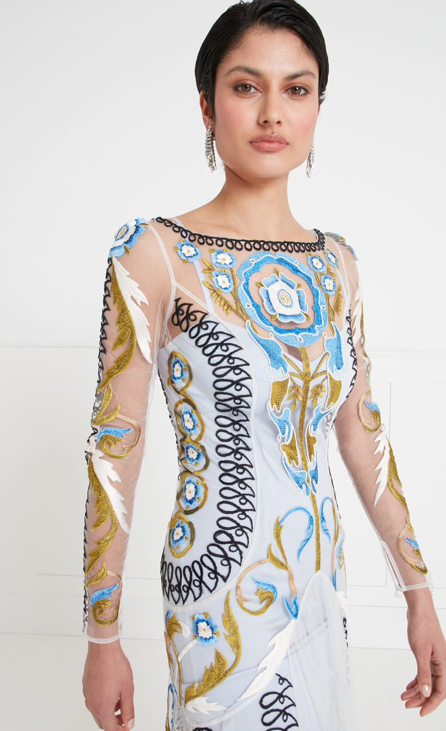 Honed to perfection, the Alessia sleeved dress is an effortlessly elegant yet statement style. Framing the contours of the body with soft Italian tulle, it flows fluidly from boatneck through the body panelling ¡ª showcasing the fine hand-embroidered detailing ¡ª into a ruched, floor-length skirt.