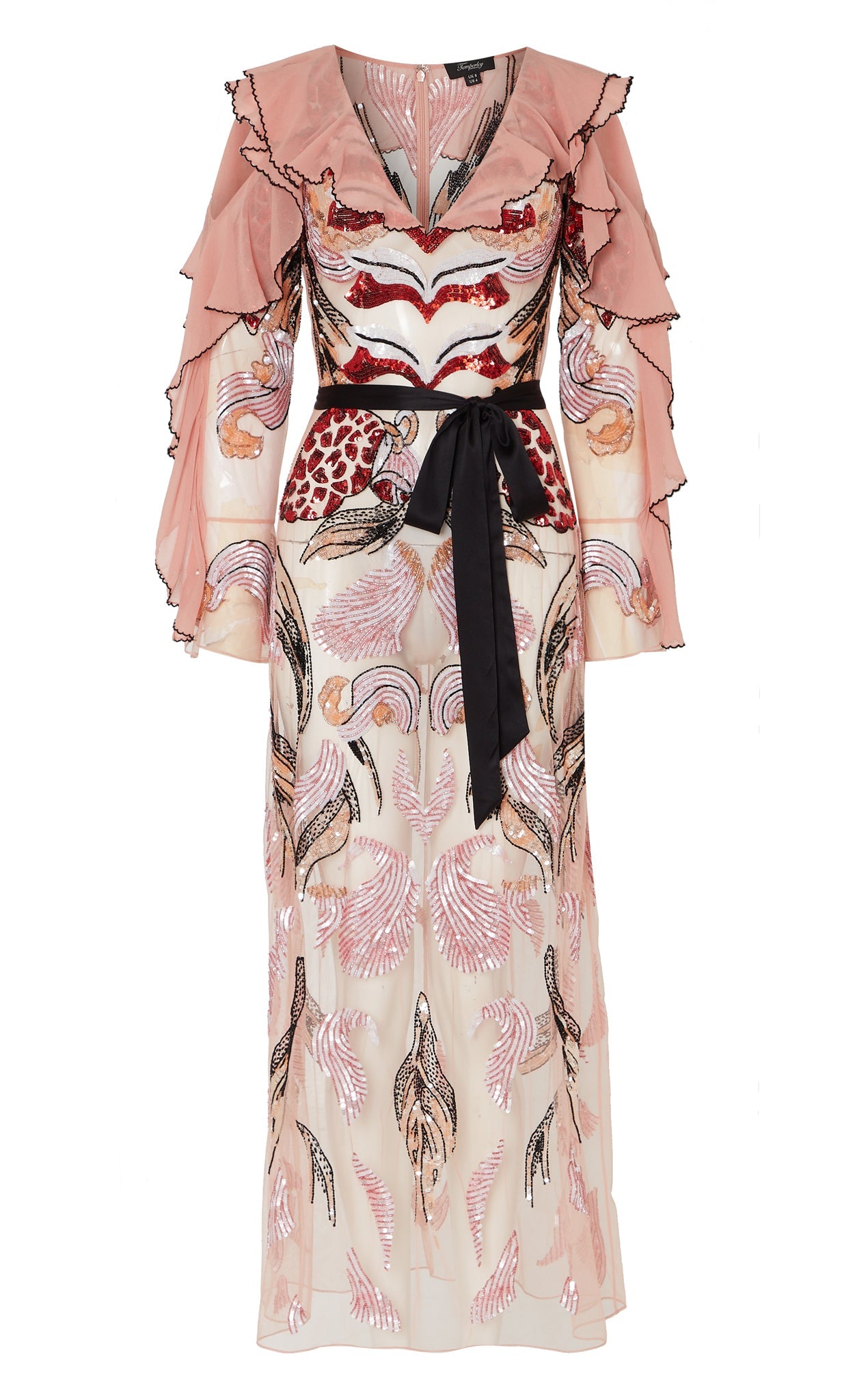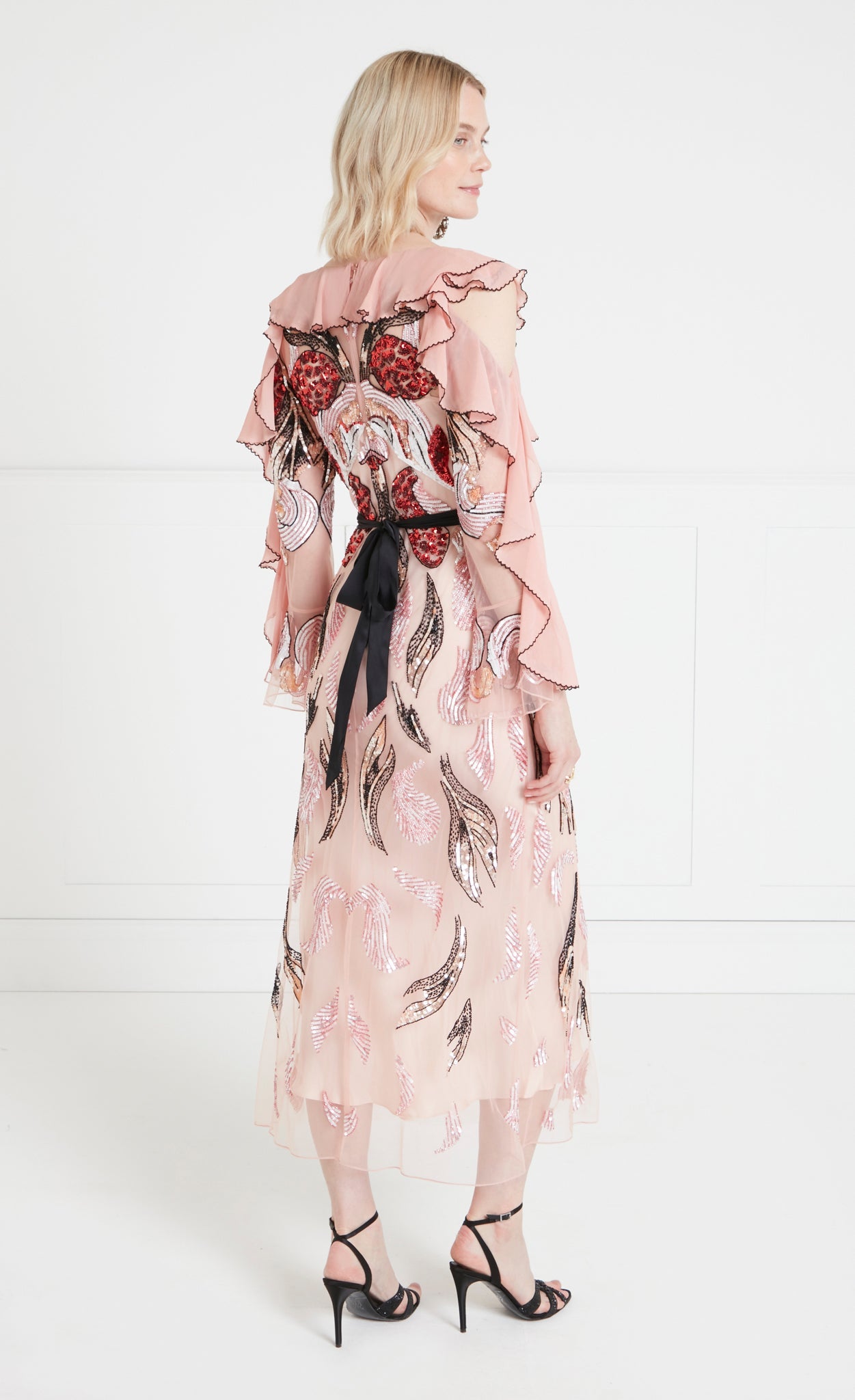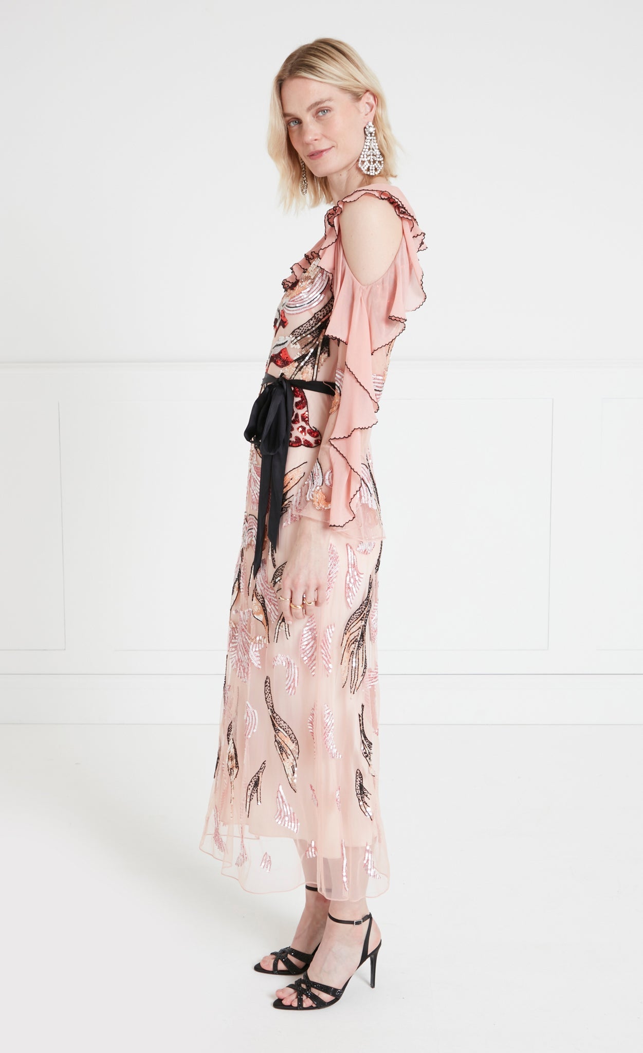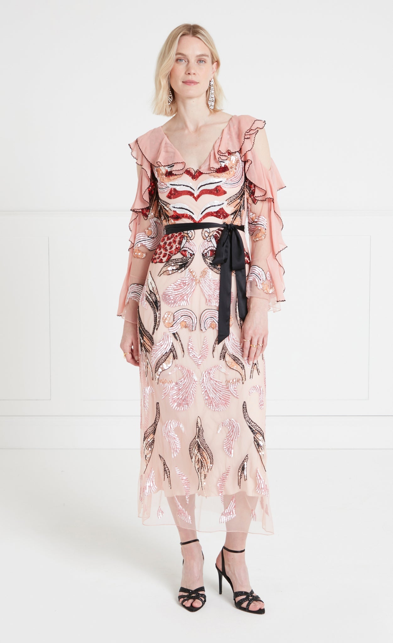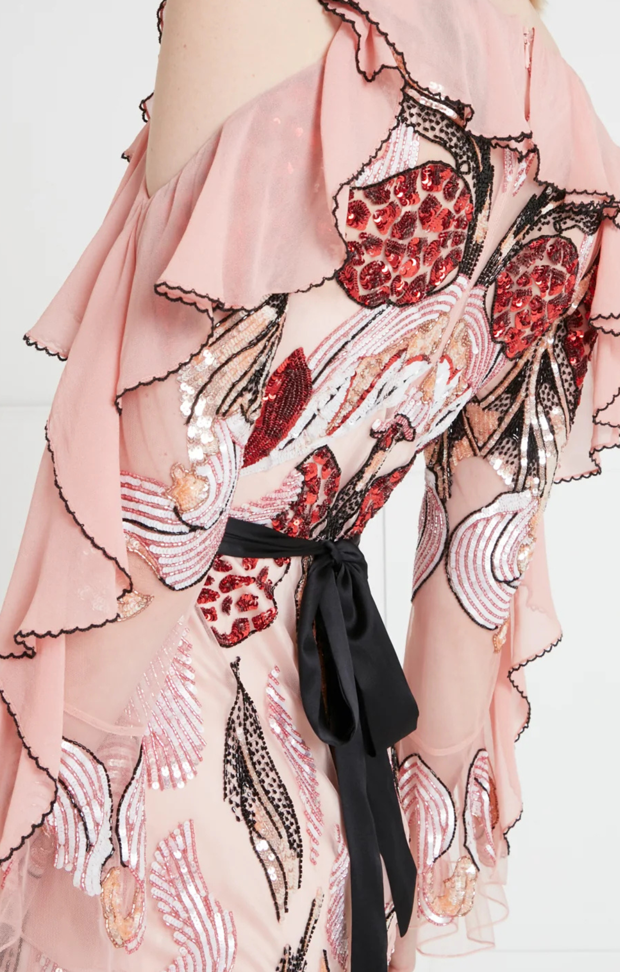 Inspired by the vibrancy of traditional flamenco dresses, the Amaya Dress is a delicate cold-shoulder design with a dramatic ruffle that cascades around the neckline and sleeves. The ruffle is beautifully accented with a black scallop trim and finished with a black satin tie belt at the waist.