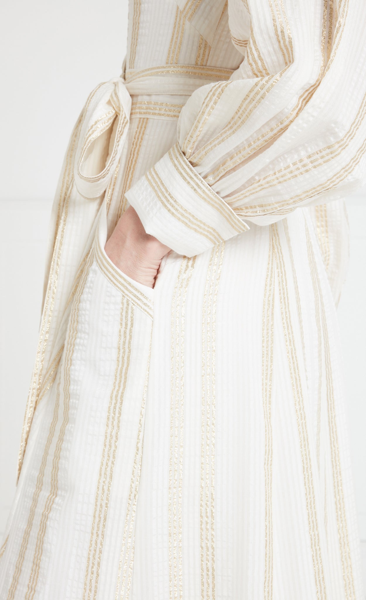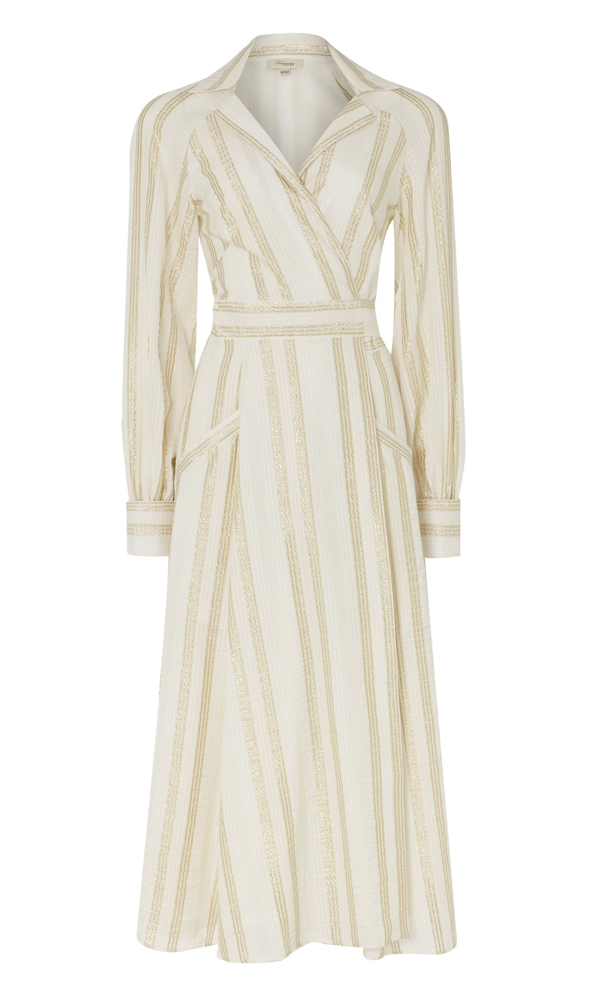 The material is a lightweight Italian cotton, weaved in a process known as fil coup¨¦, and enhanced with gold metallic stripes to compliment the silhouette.