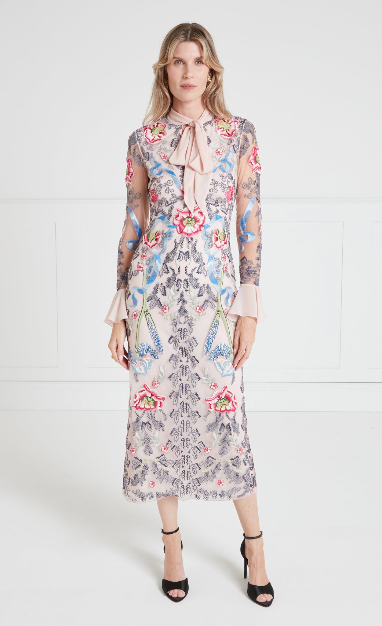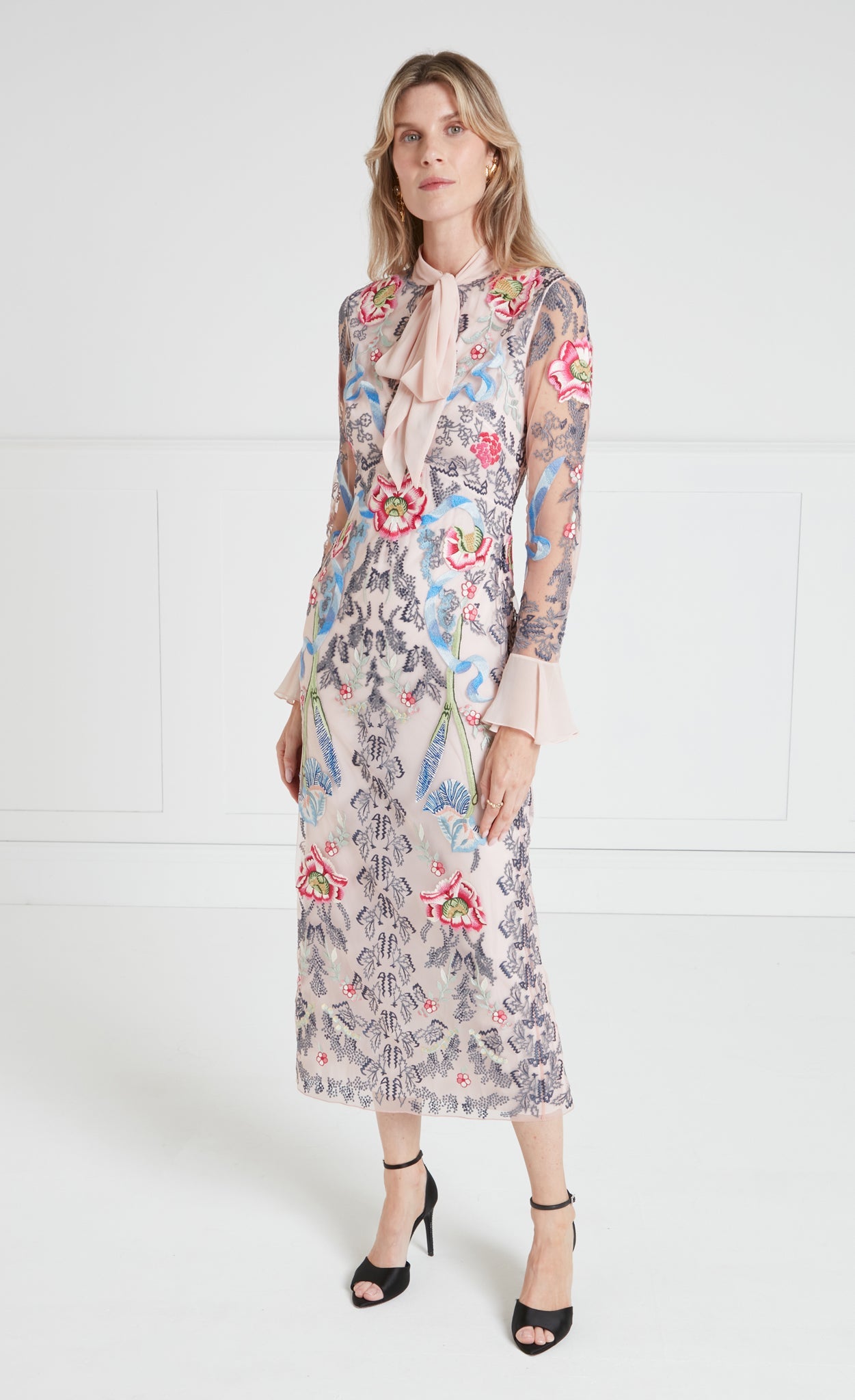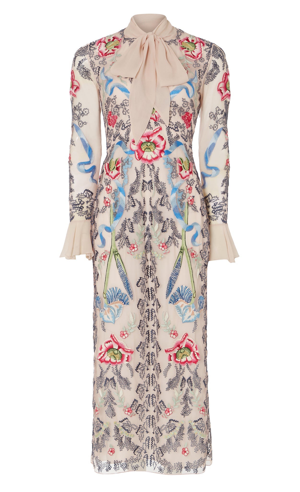 The statement-making, cocktail-length Bilbao tie dress features all-over floral embroidery. It is designed with a feminine bow tie neck and softly flared cuffs, creating elegant volume and movement. The silhouette is versatile for special occasions and distinctive enough to stand out.