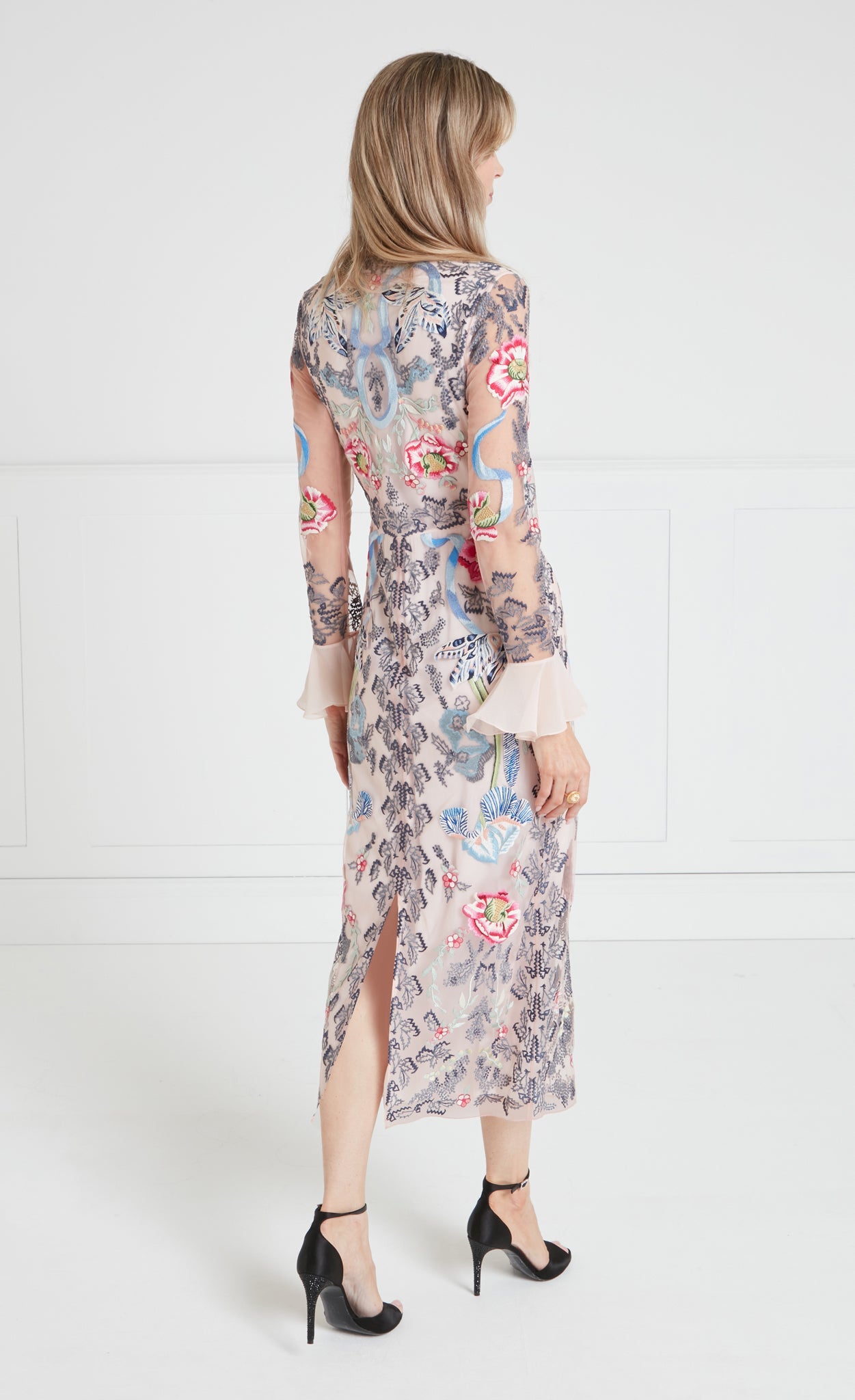 Exquisite full-stitch embroidery, engineered across the tulle overlay, embodies the essence of Temperley's DNA: timeless design, refined craftsmanship, and a distinctive, feminine flair. The dress is constructed from double georgette and layered tulle, creating a beautiful contrast in texture, with the stretch double georgette providing a flattering fit.