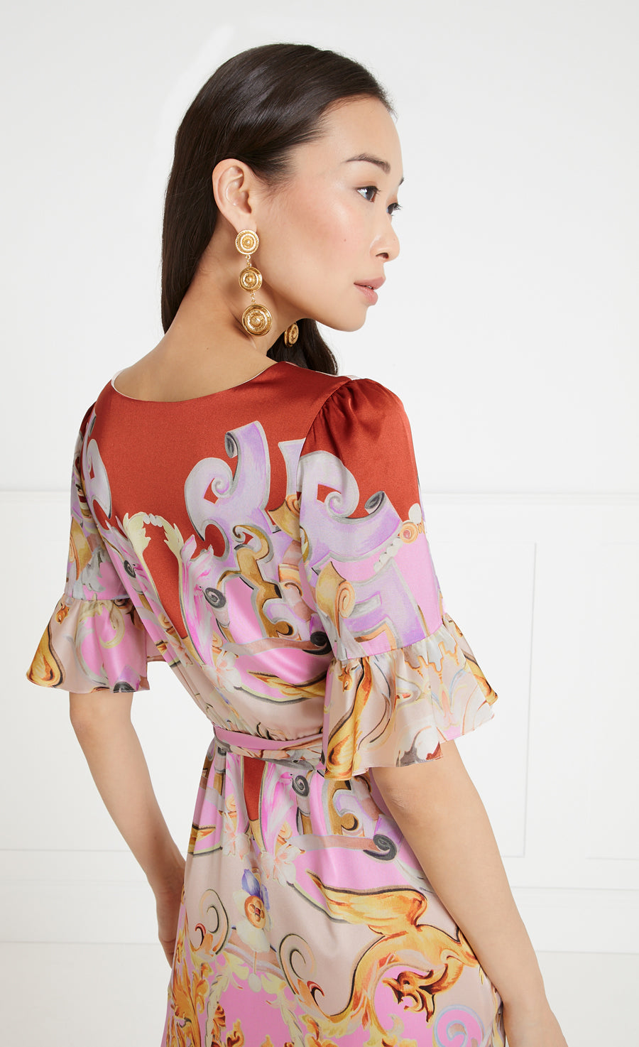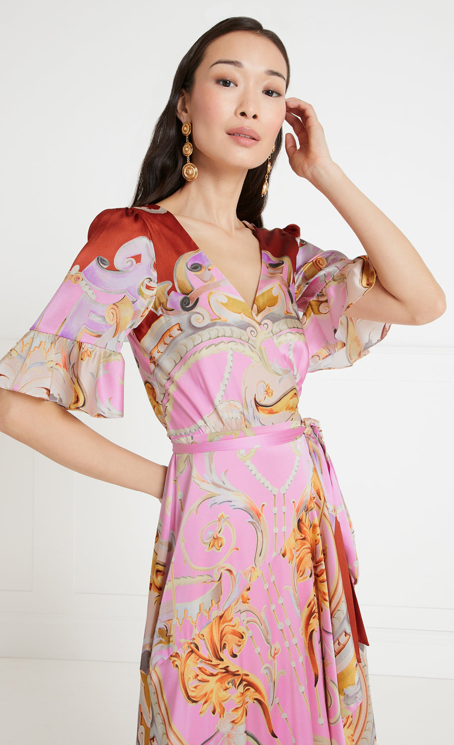 A picture of wearable opulence, our Carline story offers a lighter and looser evening print option. Made from fluid stretch satin silk, the hand-painted artwork depicts muted fresco-style motifs, composed in-house then printed in Italy, combining hazy pastels with a stronger hue at the hem. Featuring three dresses, a coat and two headscarves, united by contemporary silhouettes that can be co-ordinated or worn alone.