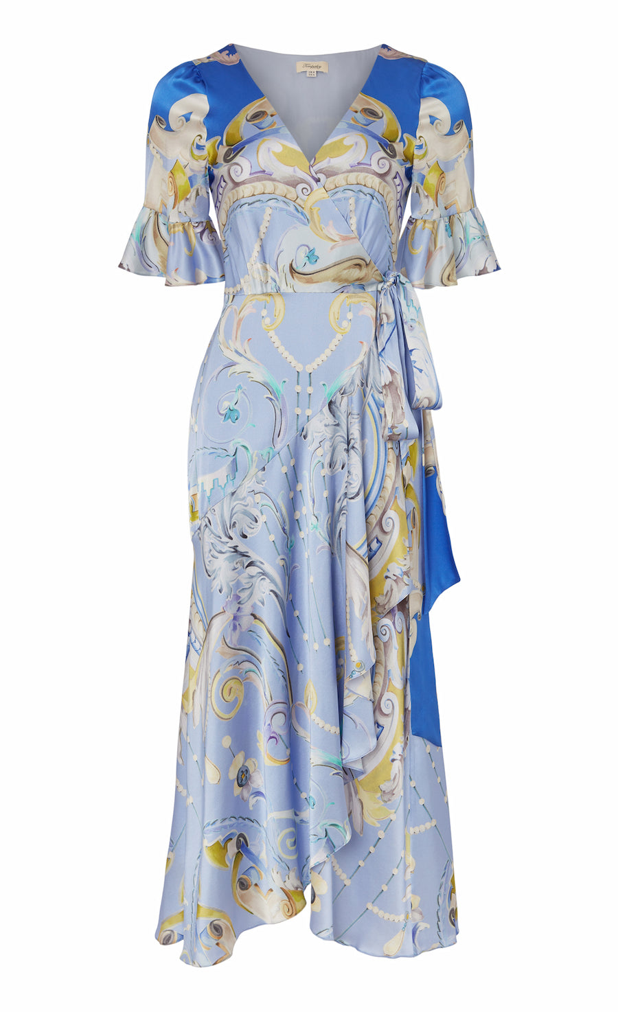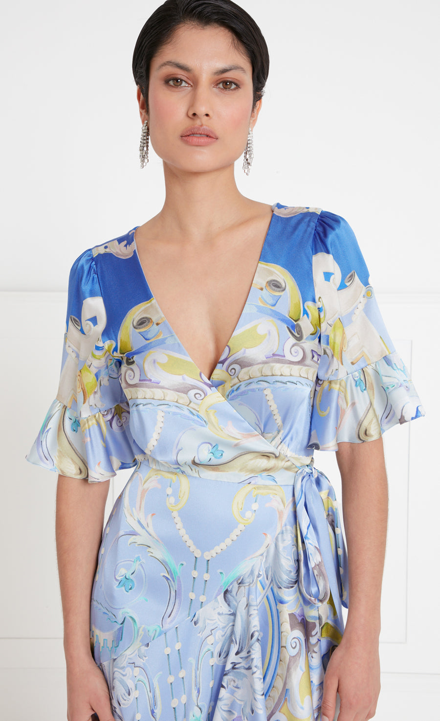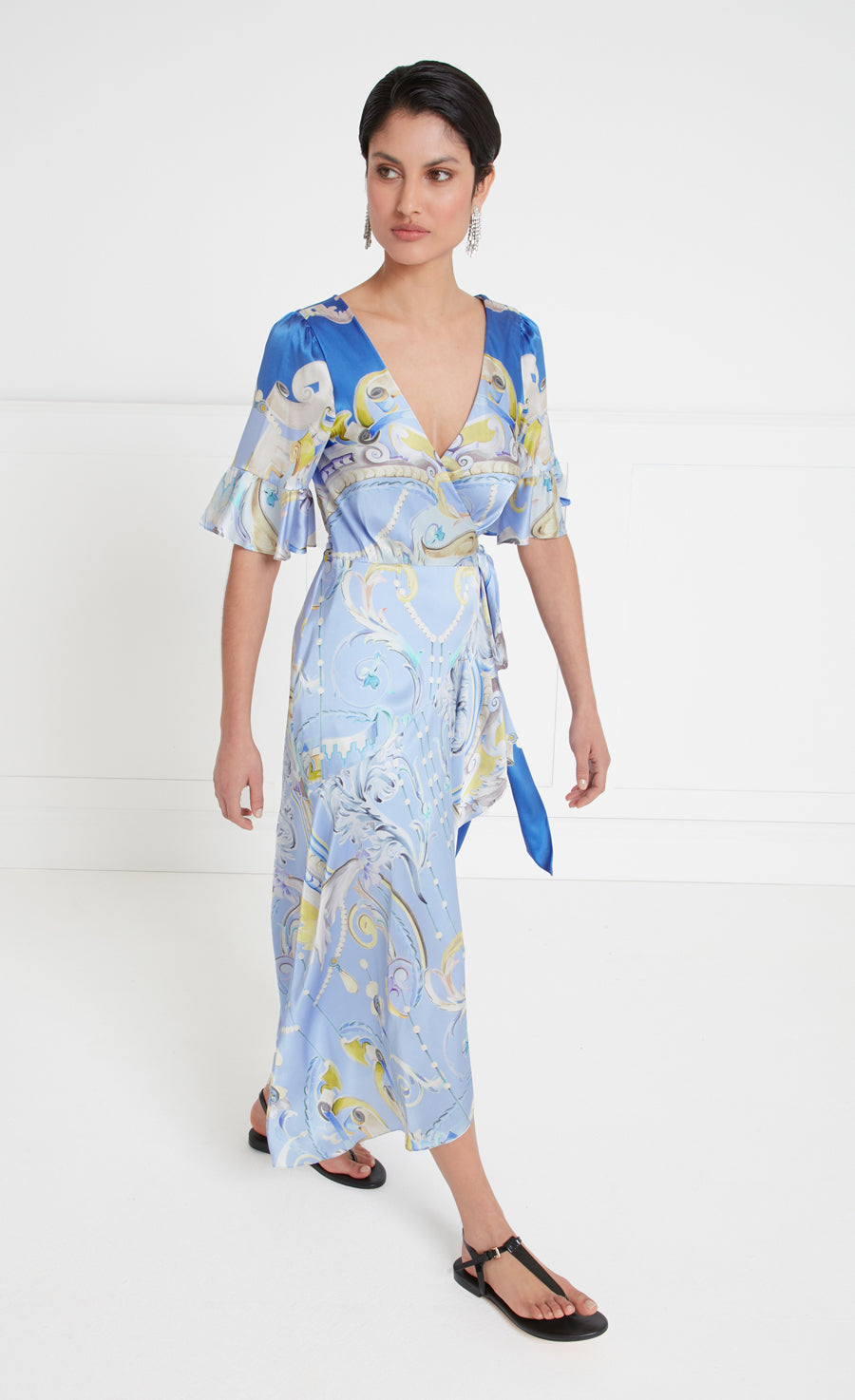 Impeccably cut and truly timeless, the Carline print wrap dress is understatedly elegant ¡ª the classic silhouette elevated with subtly fluted sleeves and bow waist tie, flowing into a full skirt for fluid movement.