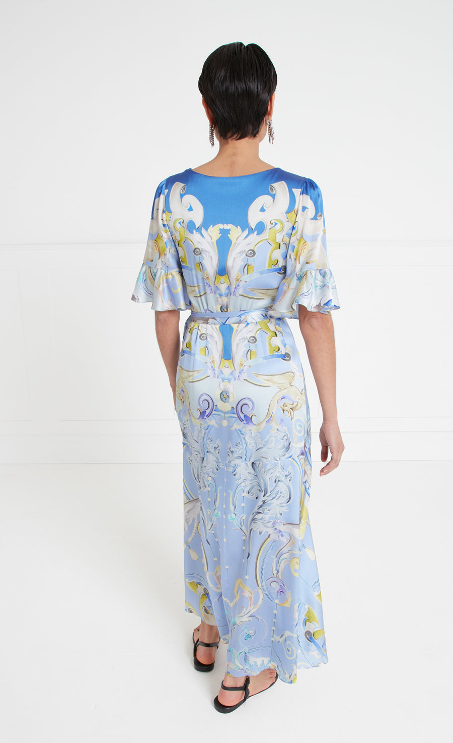 A picture of wearable opulence, our Carline story offers a lighter and looser evening print option. Made from fluid stretch satin silk, the hand-painted artwork depicts muted fresco-style motifs, composed in-house then printed in Italy, combining hazy pastels with a stronger hue at the hem. Featuring three dresses, a coat and two headscarves, united by contemporary silhouettes that can be co-ordinated or worn alone.