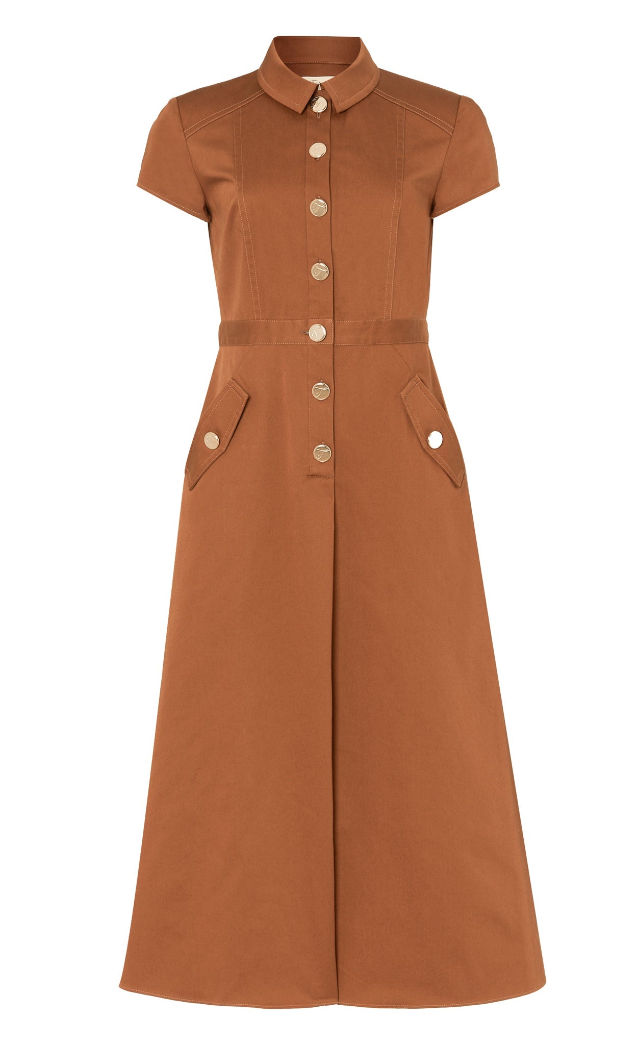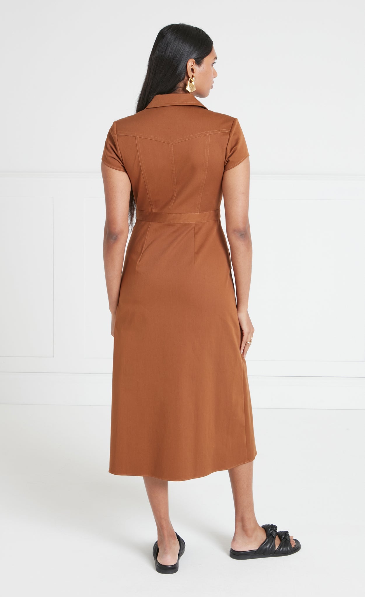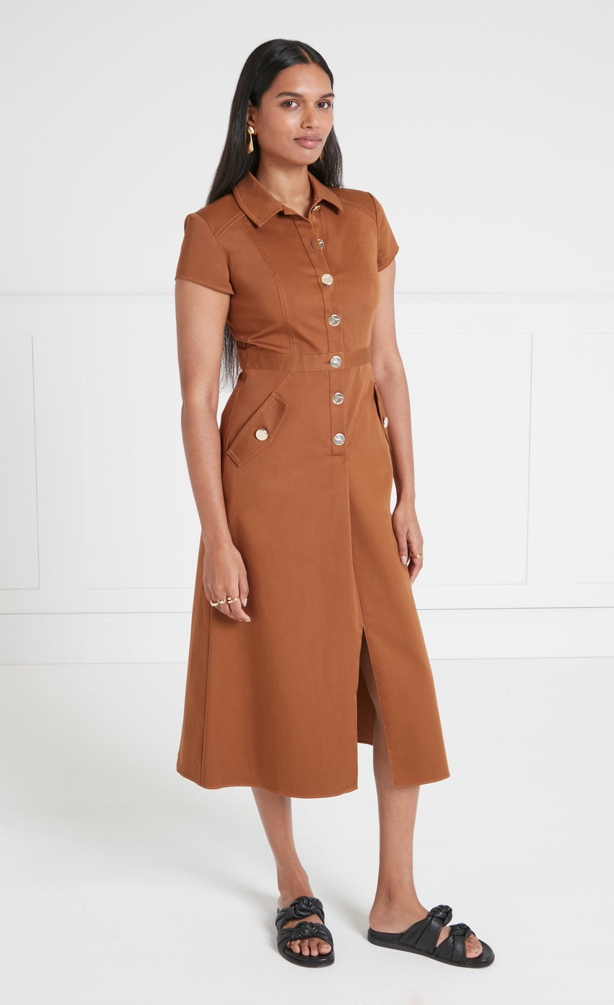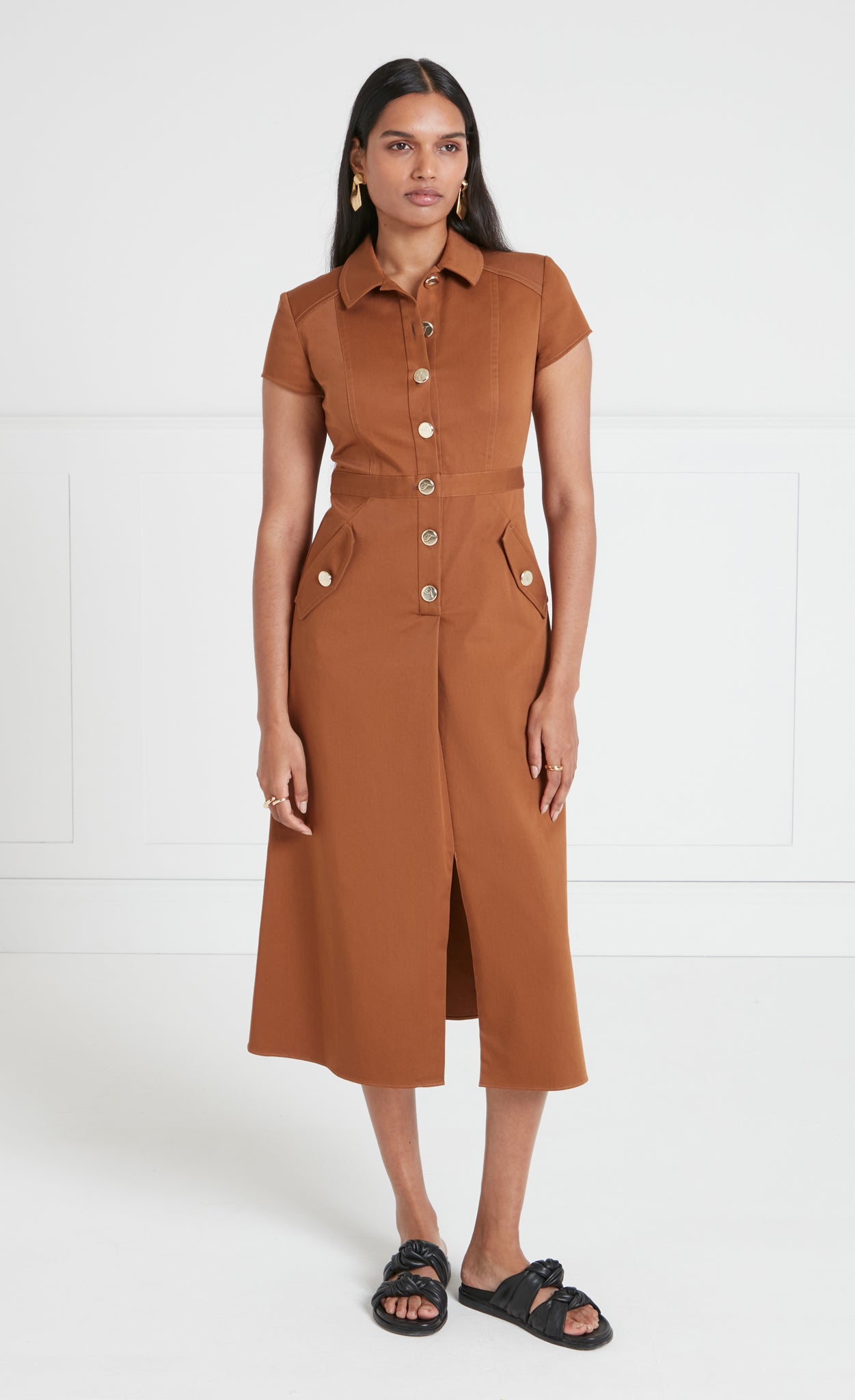 The Castell dress is an elevated workwear option inspired by classic military design. Fully topstitched for maximum durability, it features functional side pockets, short sleeves, a pointed collar, and gold-tone buttons for a refined finish, making it ideal for semi-casual occasions.