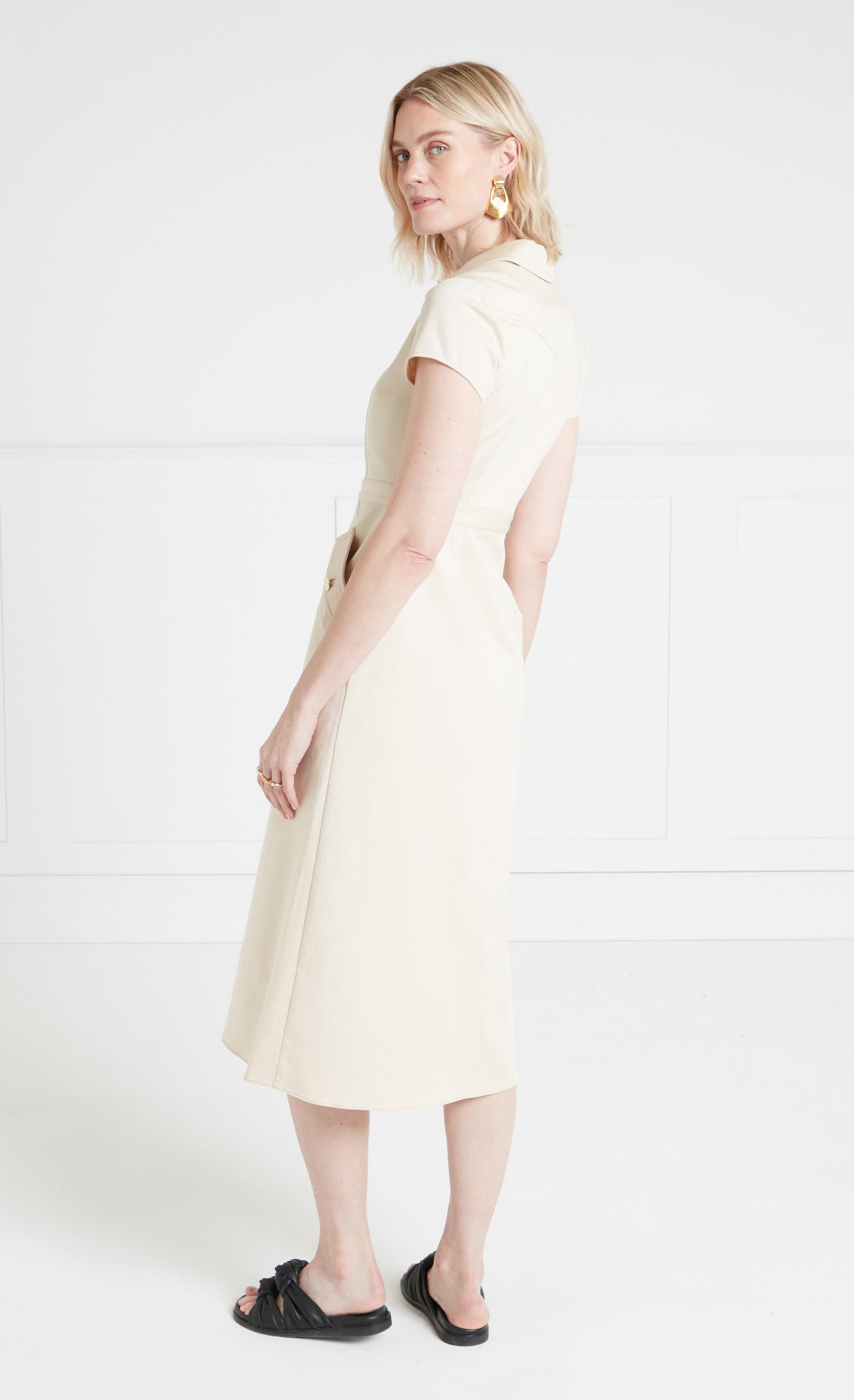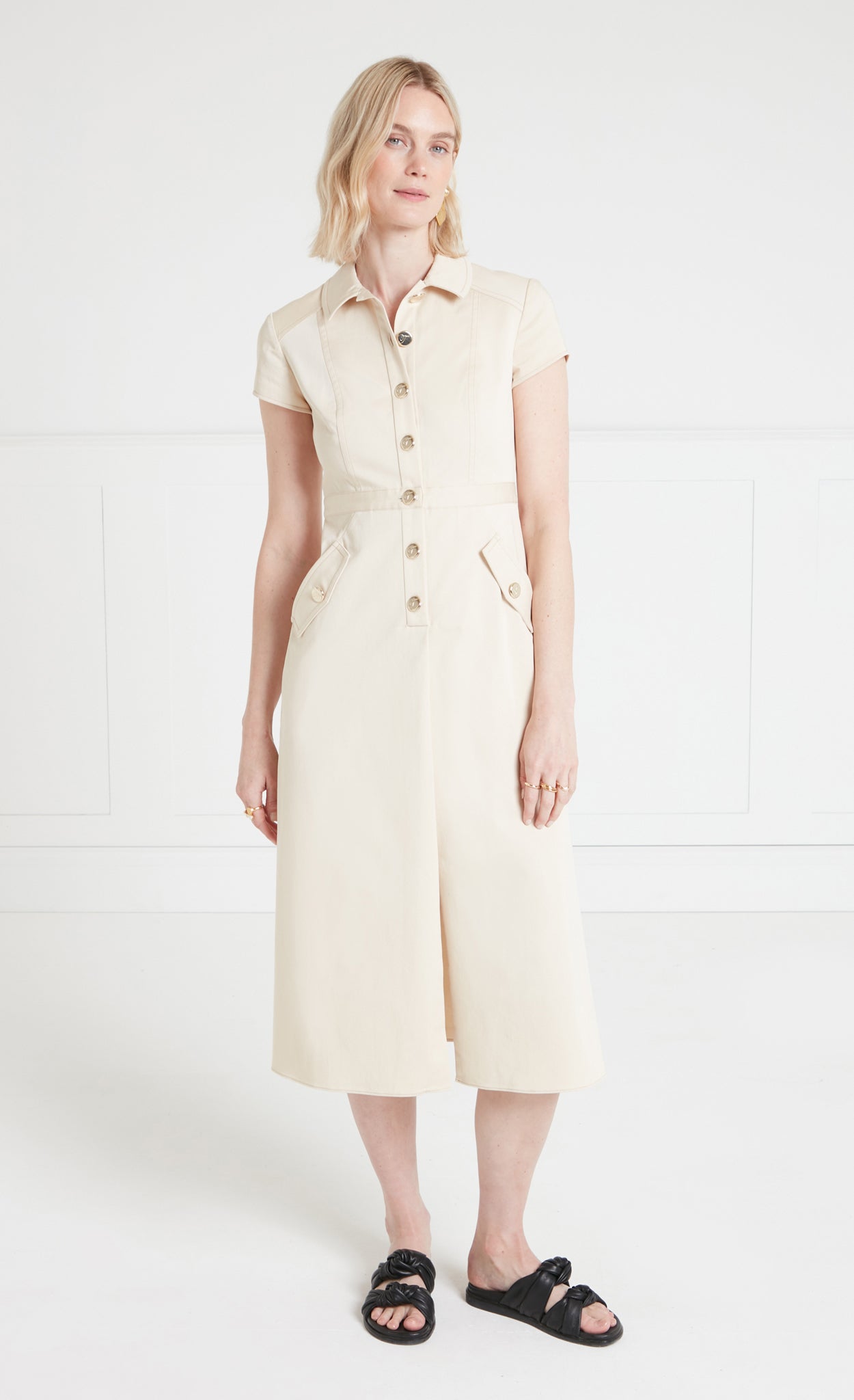 The Castell dress is an elevated workwear option inspired by classic military design. Fully topstitched for maximum durability, it features functional side pockets, short sleeves, a pointed collar, and gold-tone buttons for a refined finish, making it ideal for semi-casual occasions.