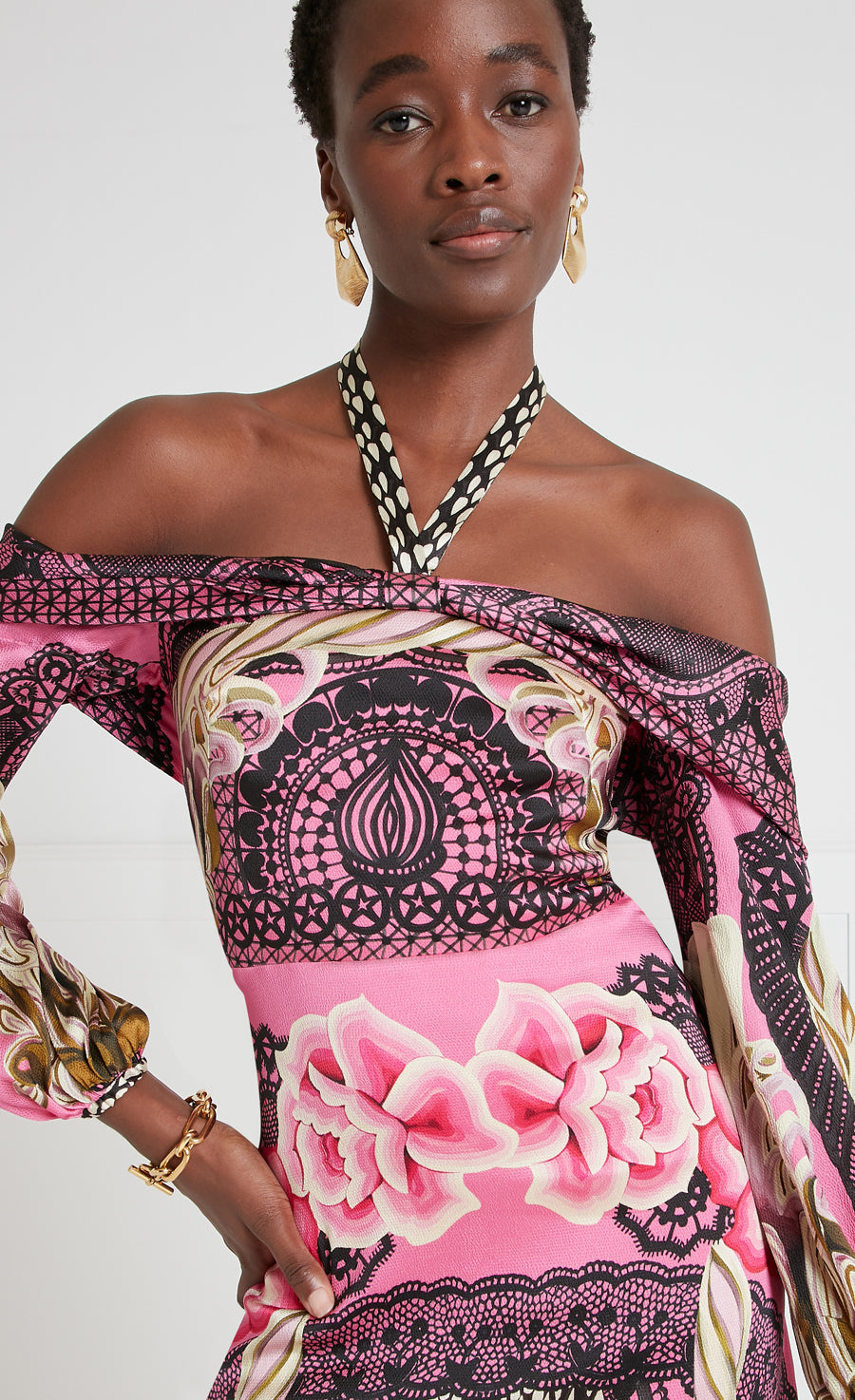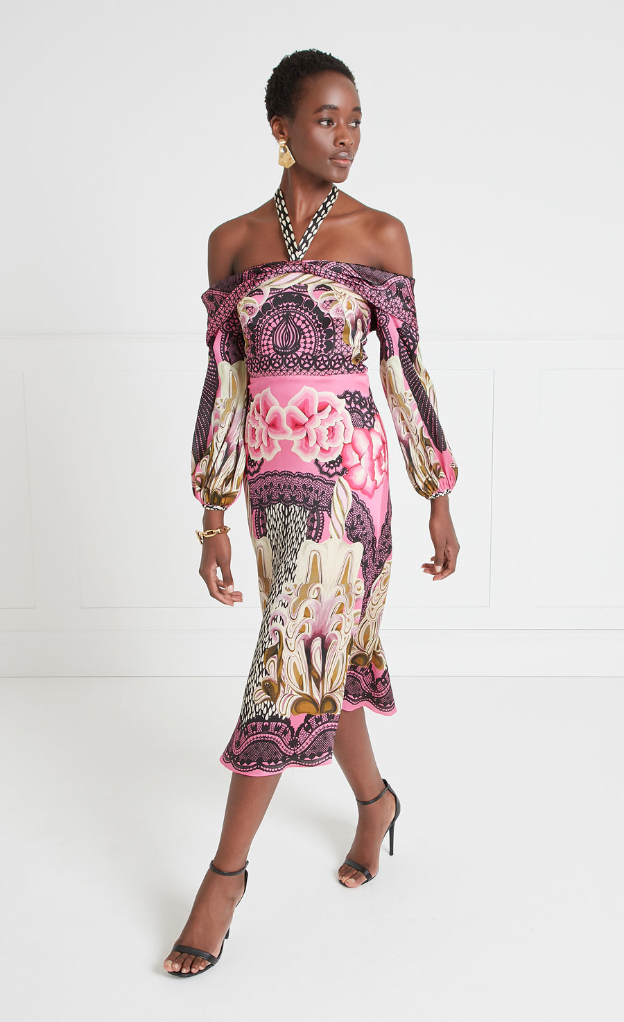 A new silhouette for AW23, the Cici Print Halter Dress is a soft yet statement-making style, with a draped off-the-shoulder neckline, fluid bell sleeves and lustrous bow fastening that cascades down the back, fitted with a waist-cinching bodice for added polish.