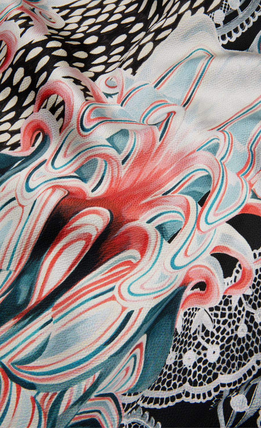 Crafted from hammered stretch silk satin, with a fluid drape and lustrous finish, every element painstakingly hand-painted in-house and placed in specially engineered compositions for perfect print alignment, to fit and flatter the dress silhouette. Printed in Italy and made in Europe.