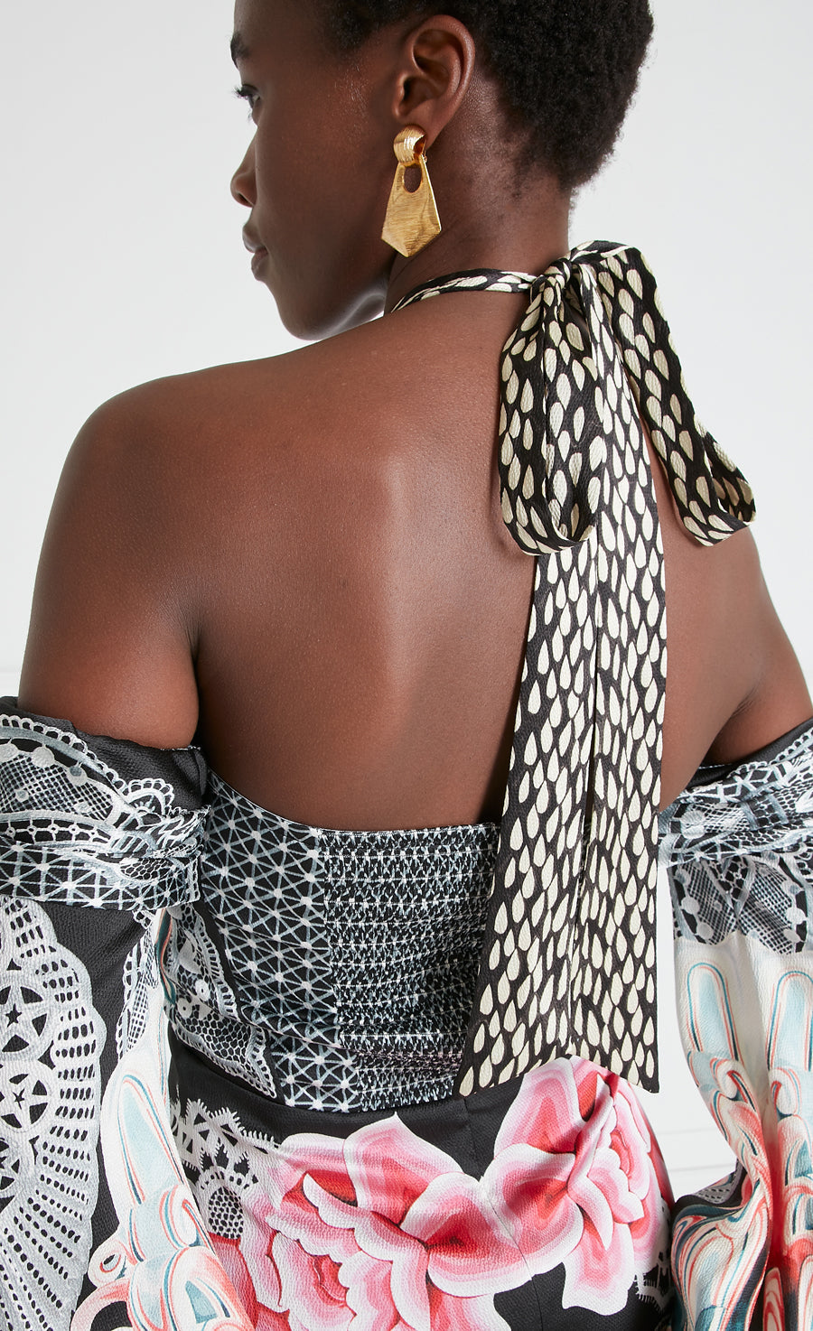 A new silhouette for AW23, the Cici Print Halter Dress is a soft yet statement-making style, with a draped off-the-shoulder neckline, fluid bell sleeves and lustrous bow fastening that cascades down the back, fitted with a waist-cinching bodice for added polish.