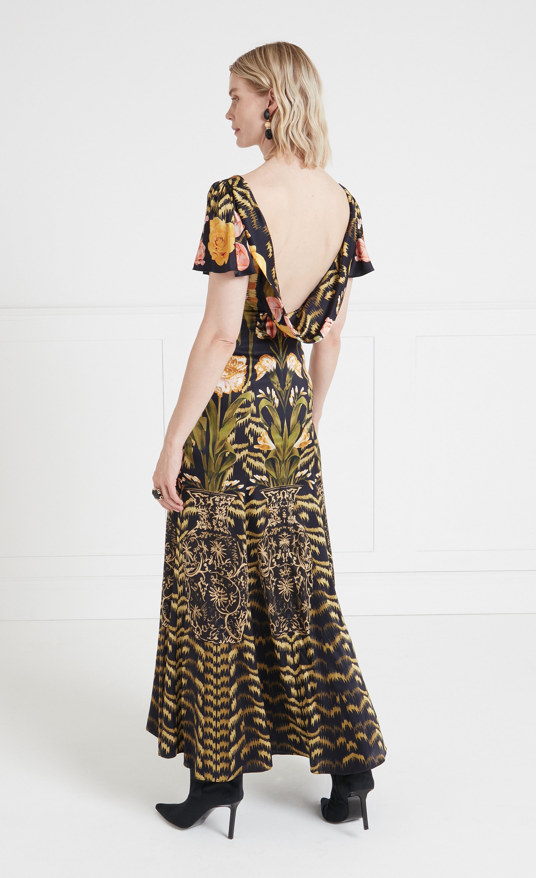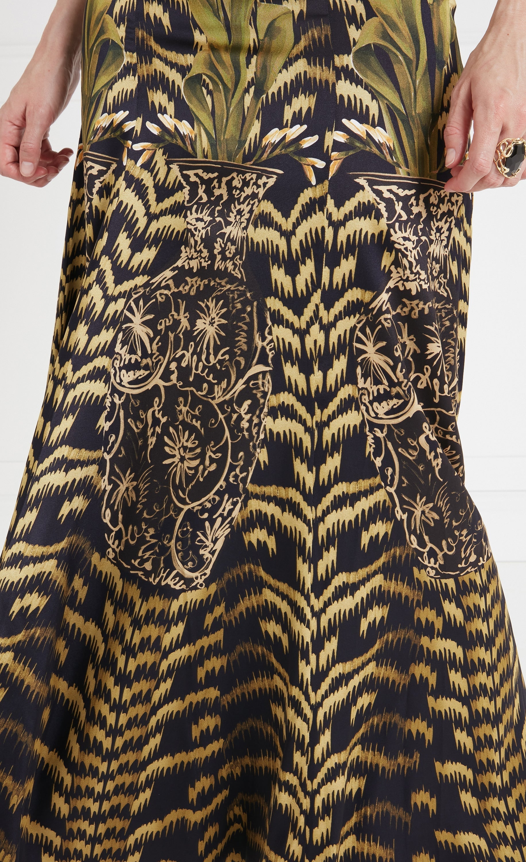 Created bespoke in-house, the complex process of engineered print entails hand-painting each element and individually collaging them onto garment sketches, refining the composition on 3D paper doll maquettes to ensure perfect placement.