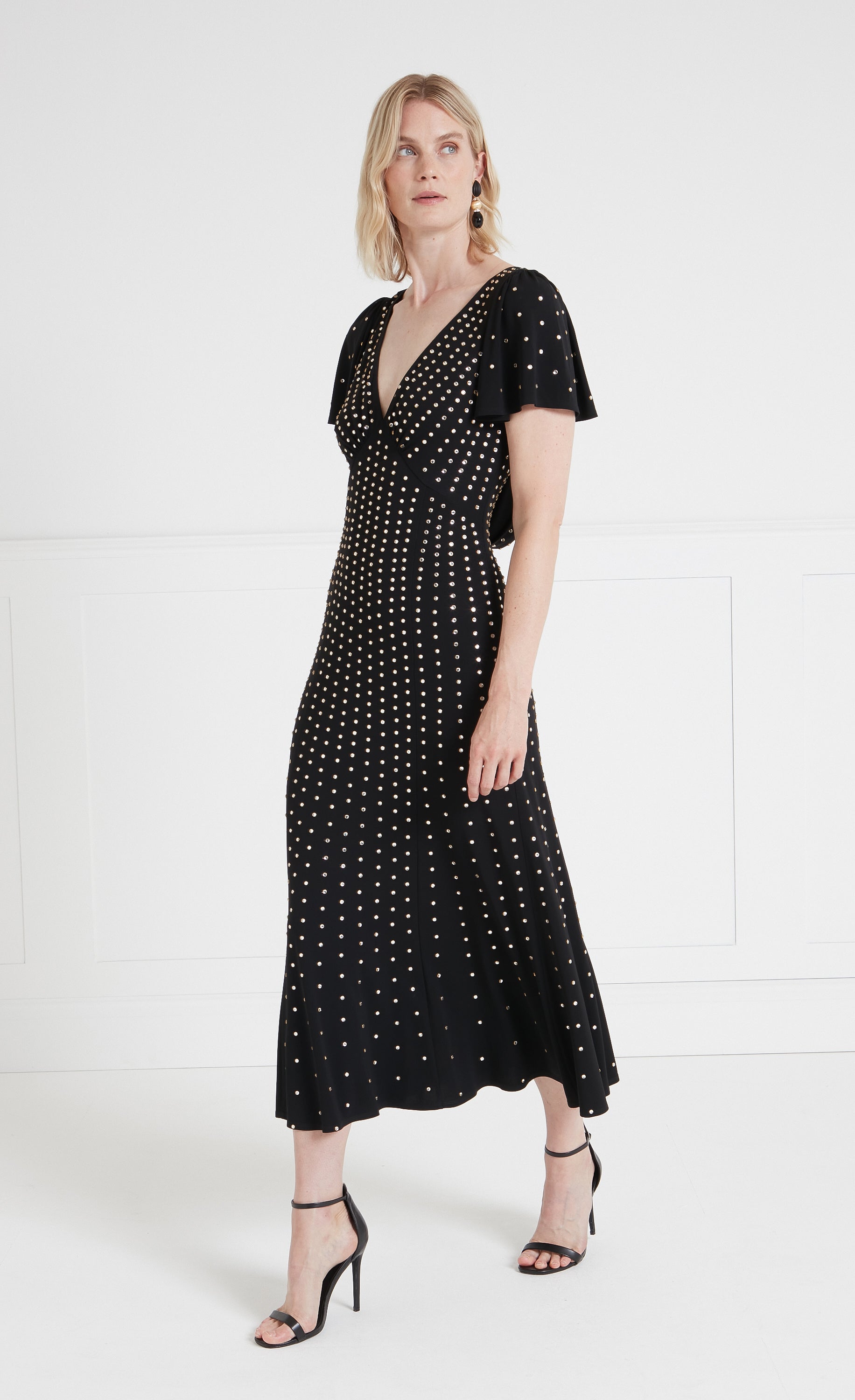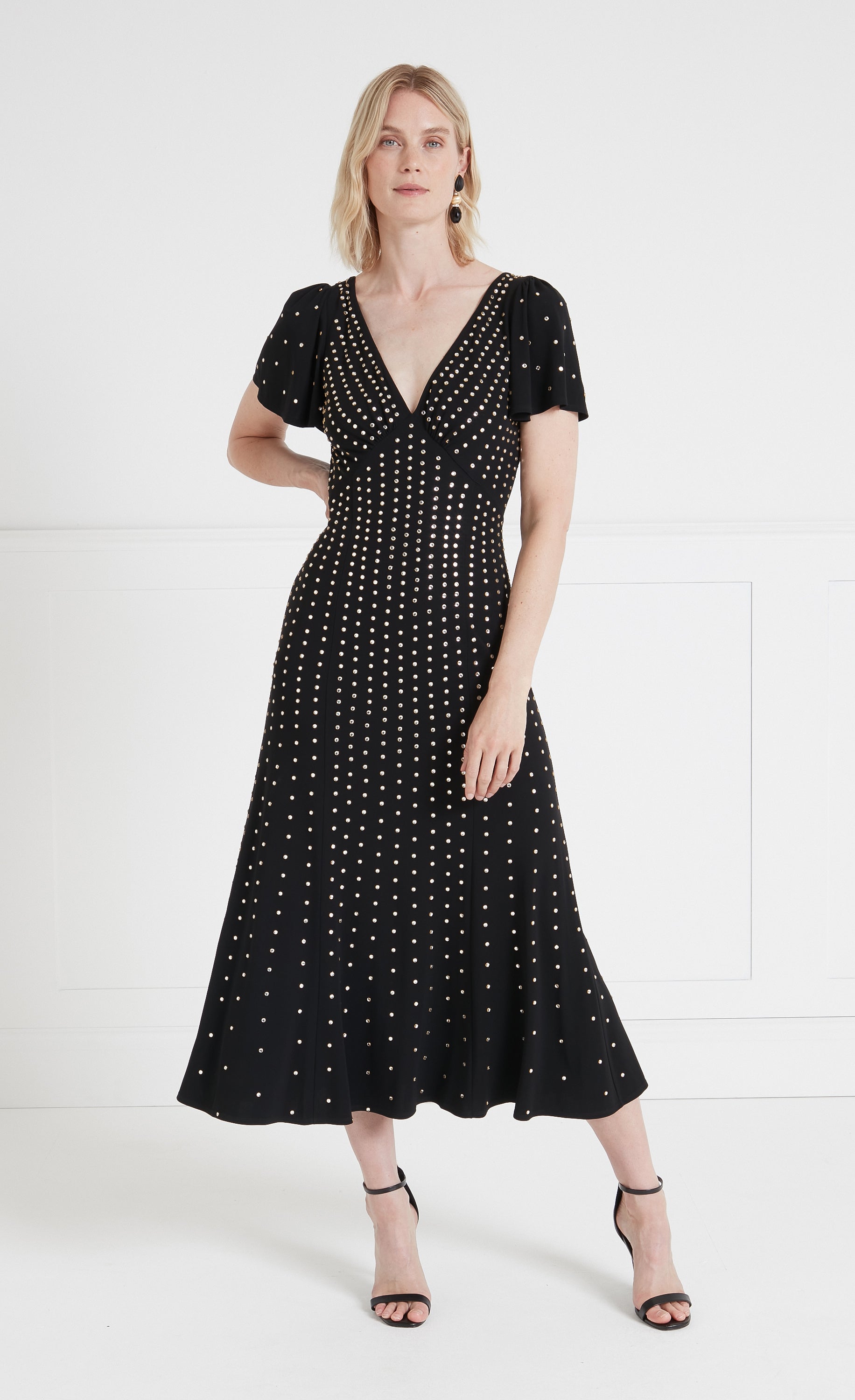 The Comet Cocktail dress is a flared design, embellished with studded crystals, adding a touch of opulence to the look. Featuring a head turning draped cowl back, it makes it the perfect statement piece for any glamorous occasion.