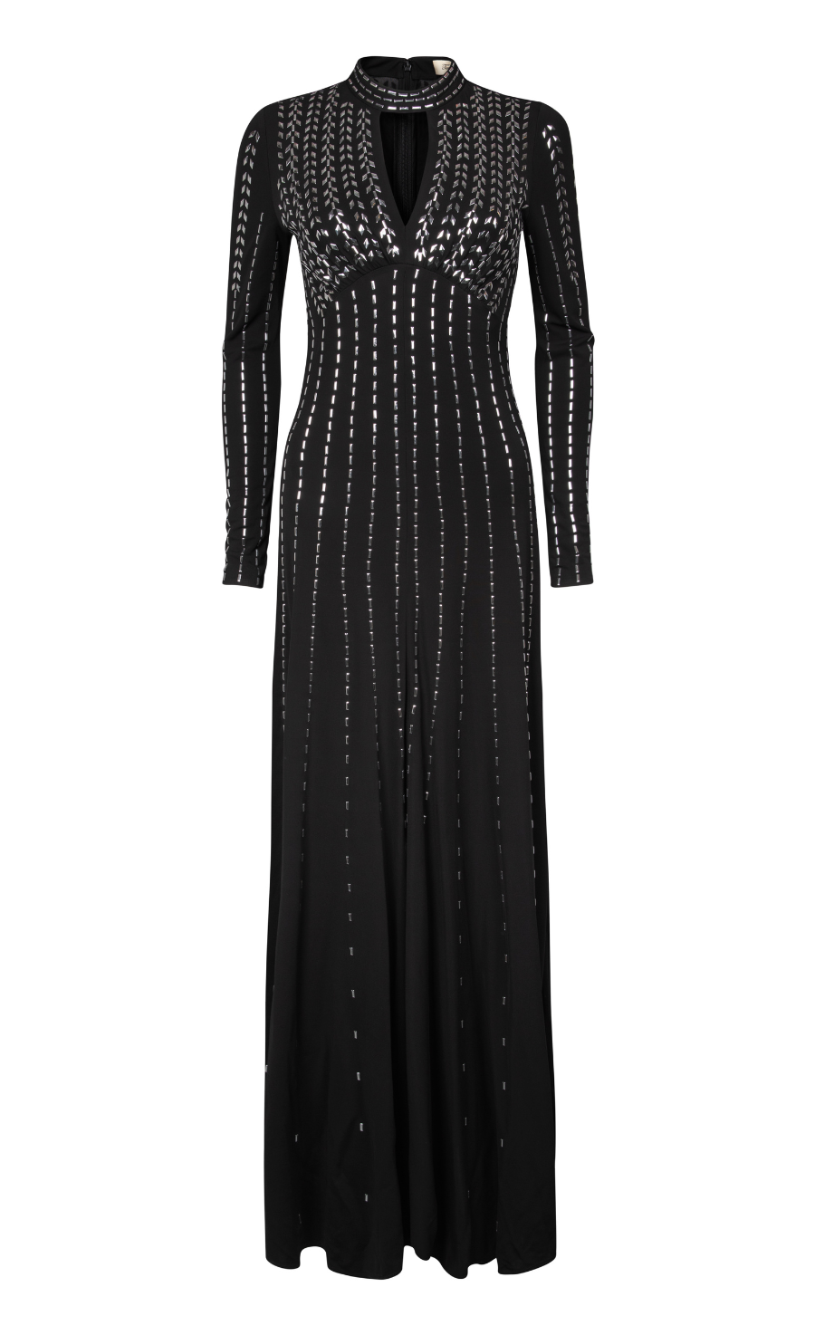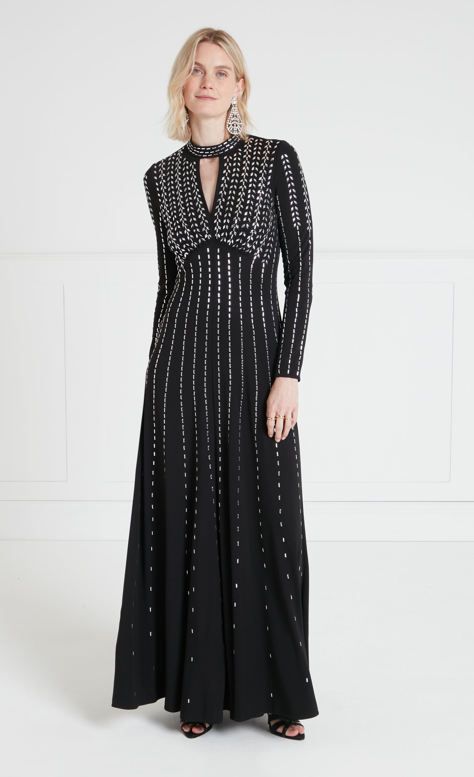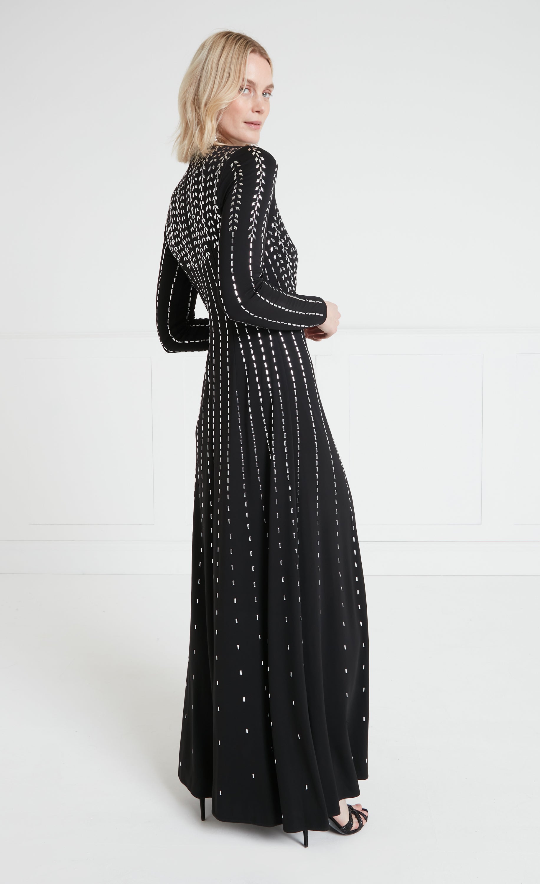 Featuring vertically degrading crystal embellishments in contouring stripes the details of the Comet dressensures that each gown moves beautifully with the wearer, turning heads with every step. This sleek, long-sleeved column dress features a figure-hugging jersey base and gentle flare skirt baseresulting in a streamlined and elegant look.