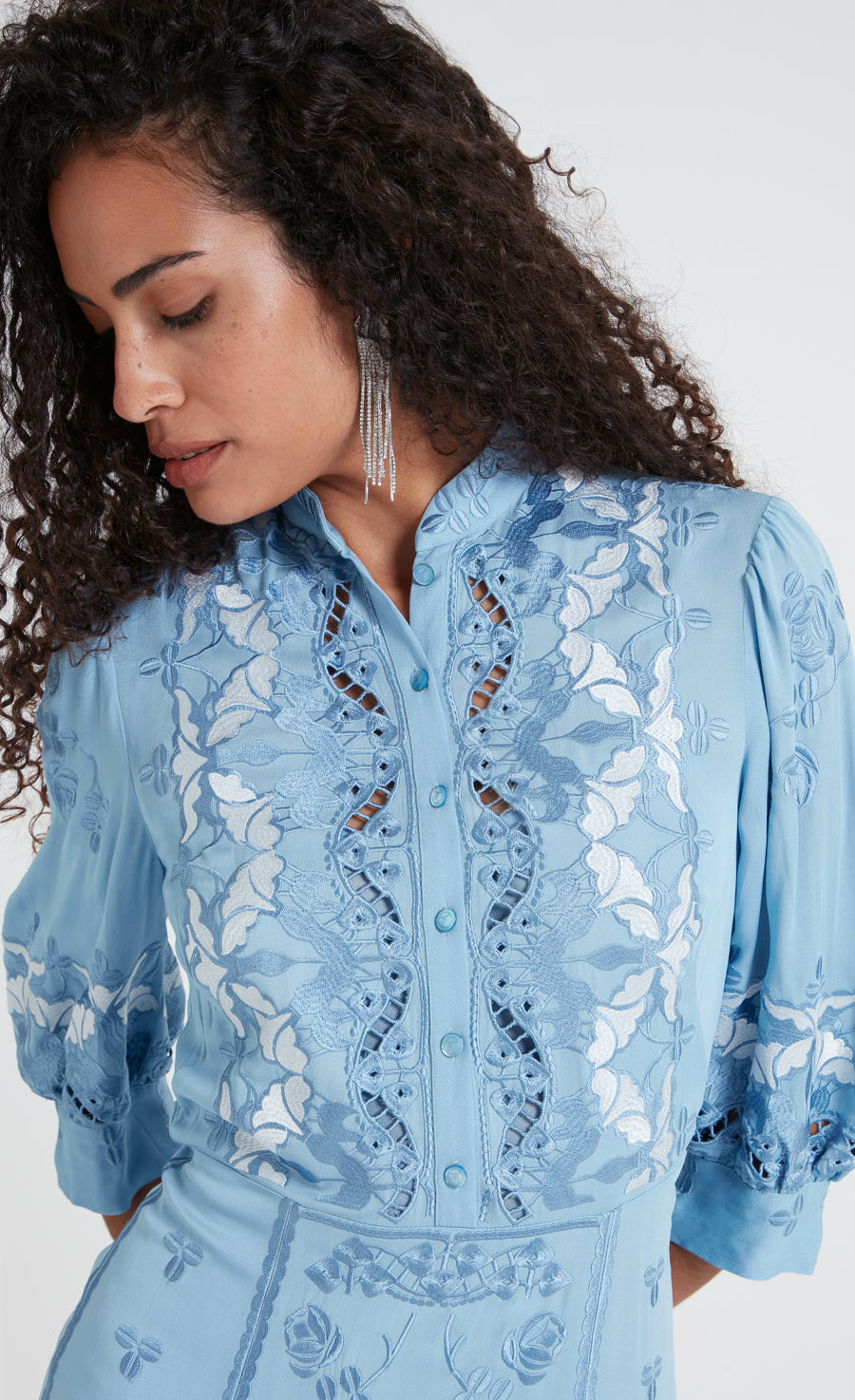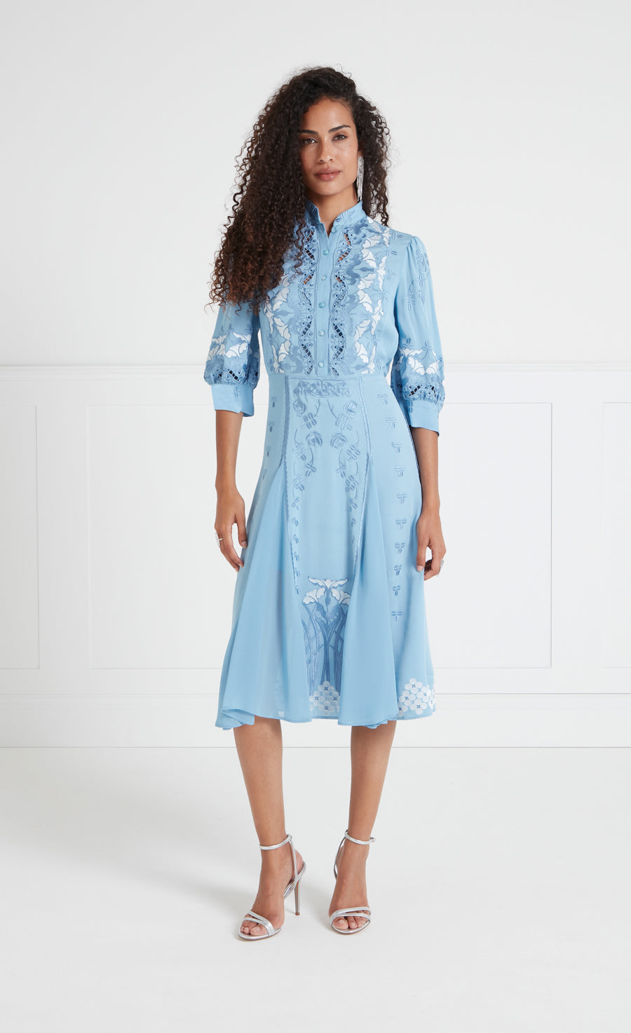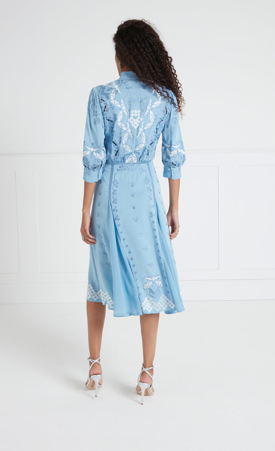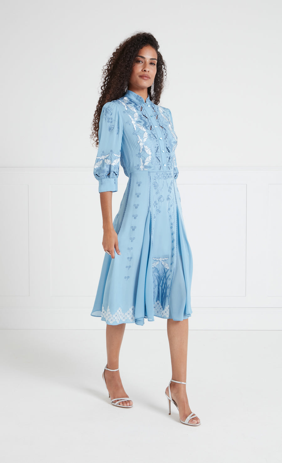 With an airy draping fit and fluid silhouette, the Daphne dress showcases striking Temperley cutwork and embroidered florals, with an open collar, neatly cuffed sleeves and a swishy godet skirt, offering a spirited option for day or cocktail party dressing.