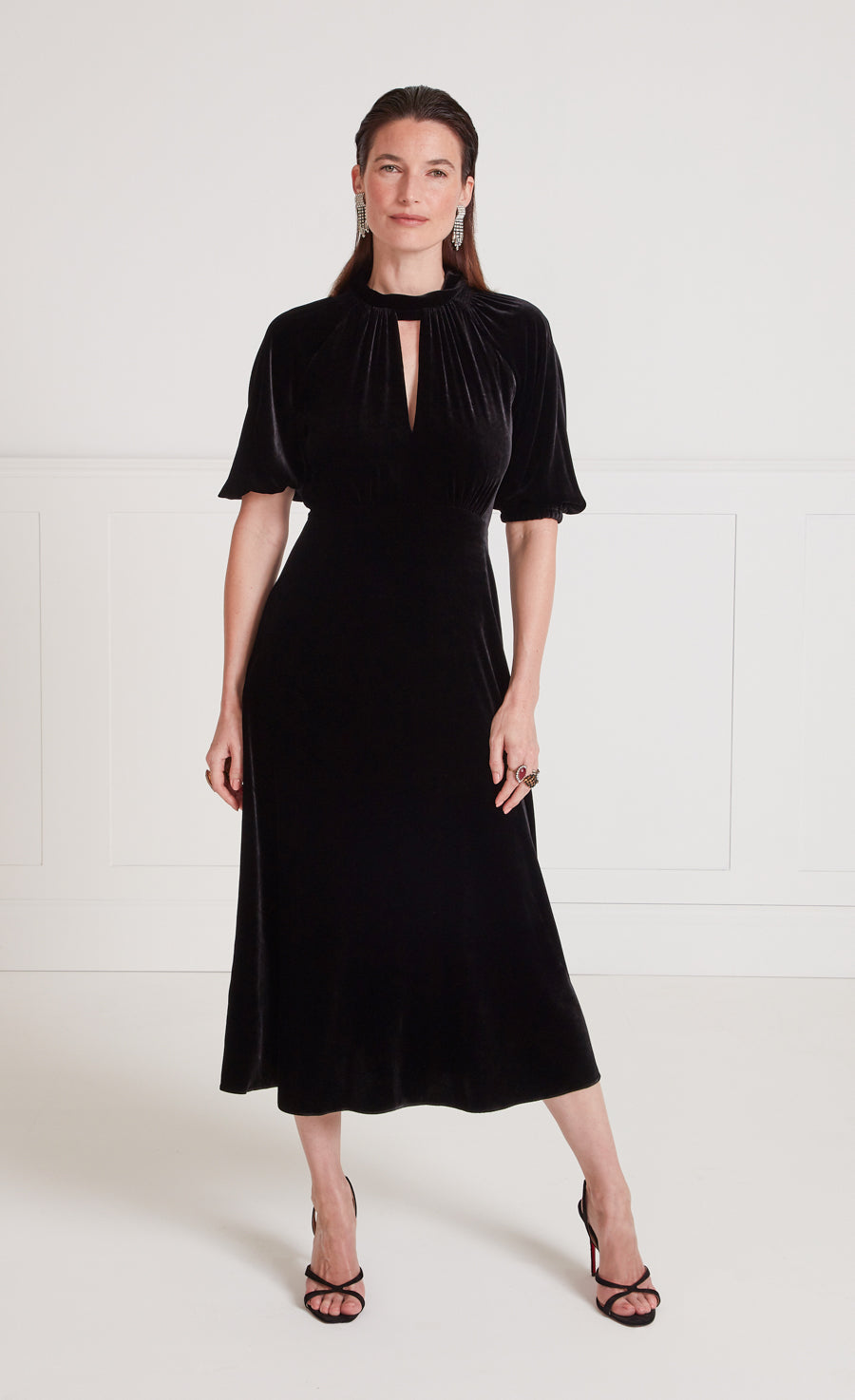 A modern approach to 1930s day dress silhouettes, the Eliana Story is the epitome of timeless elegance. Made from a sumptuous stretch silk and viscose blend velvet, in black, with a luxuriously fluid finish for day to night comfort.