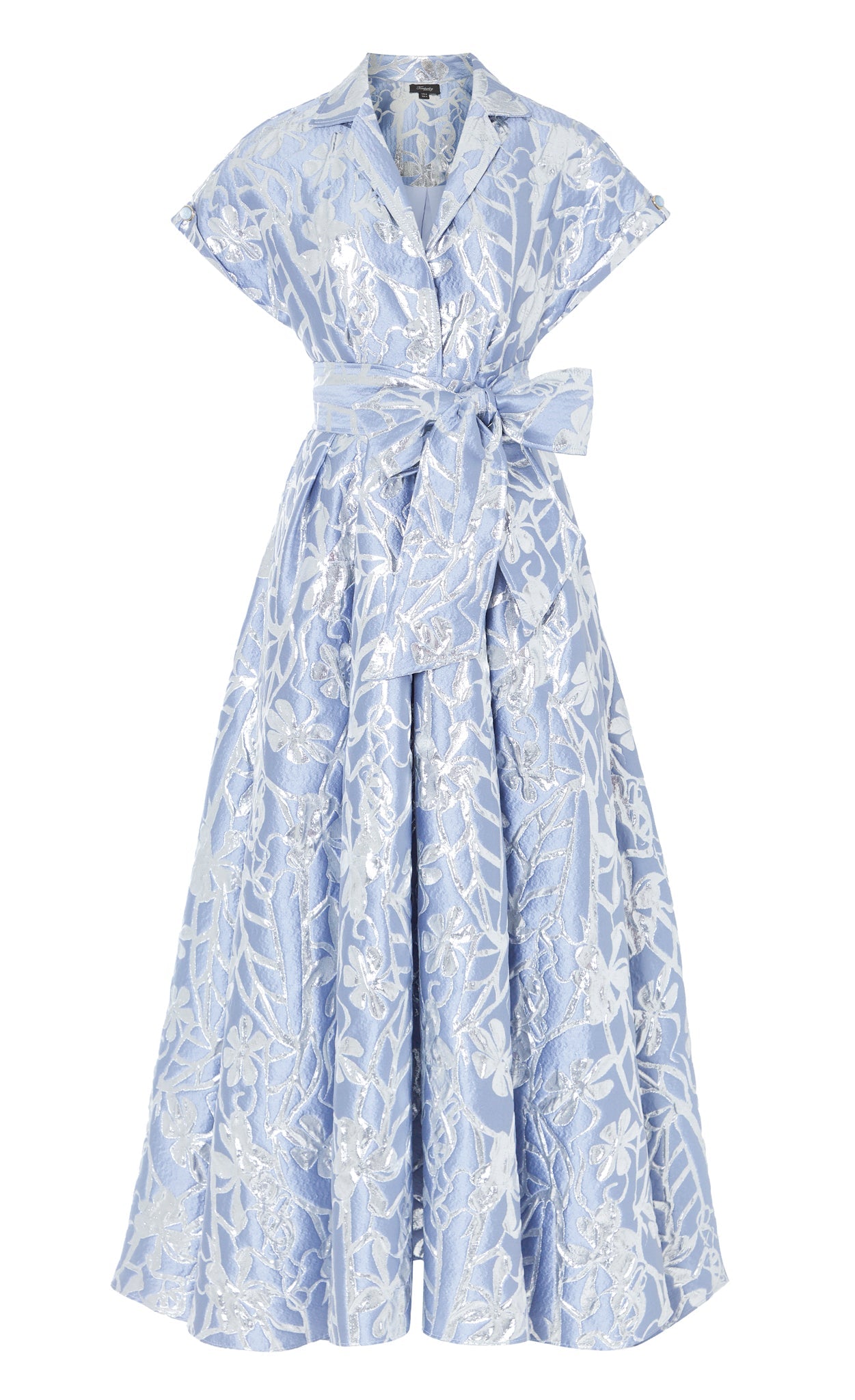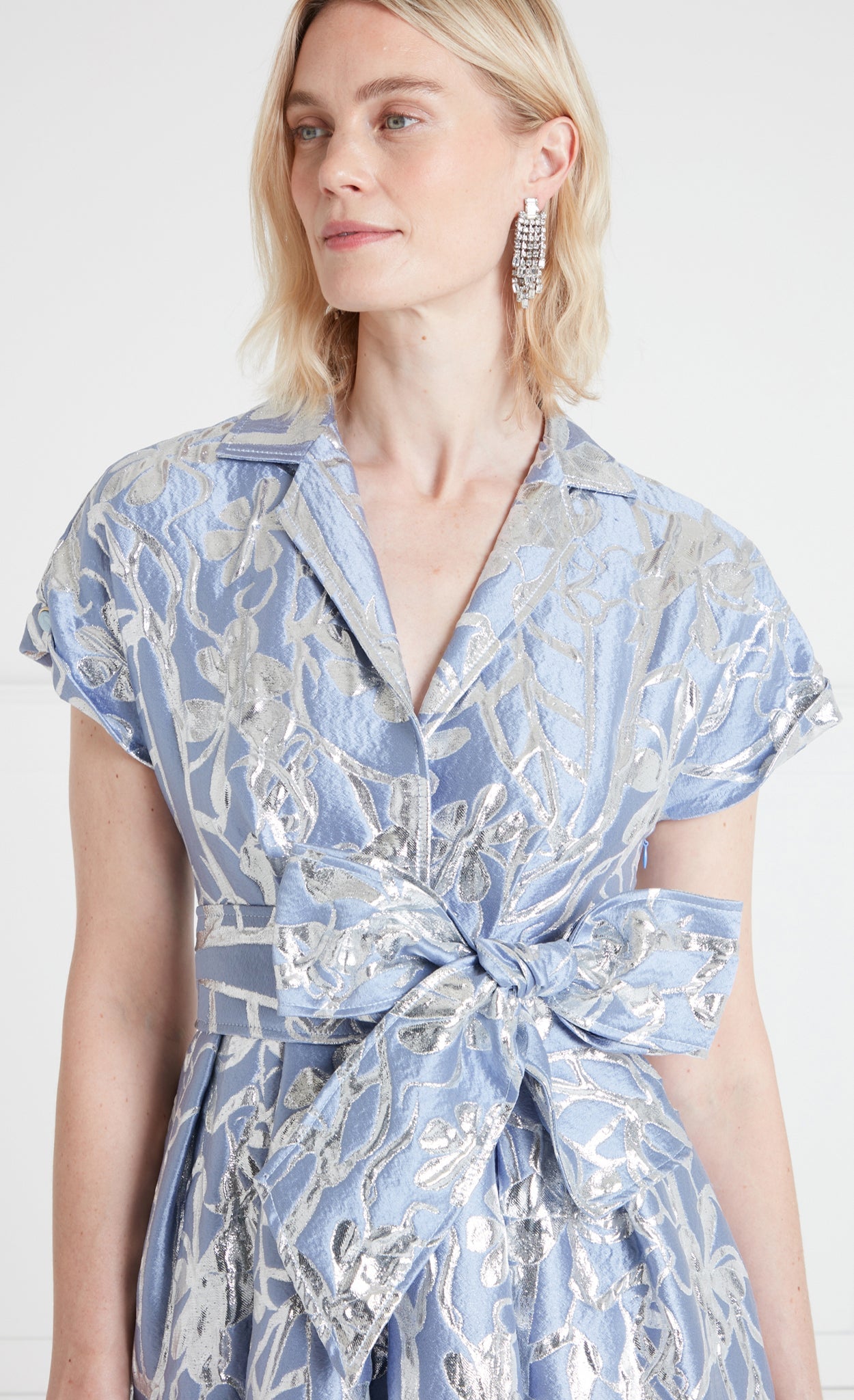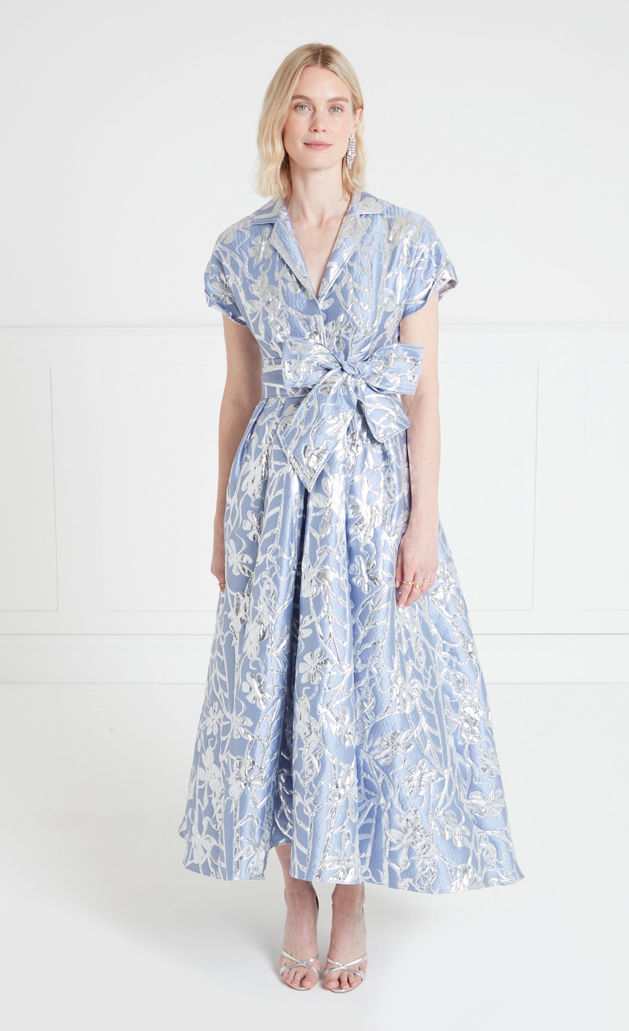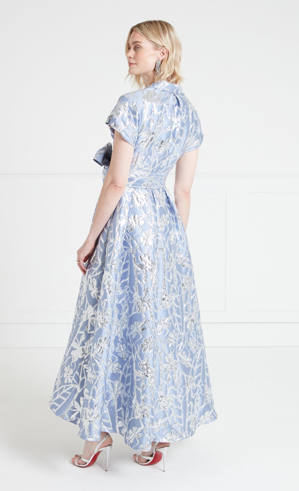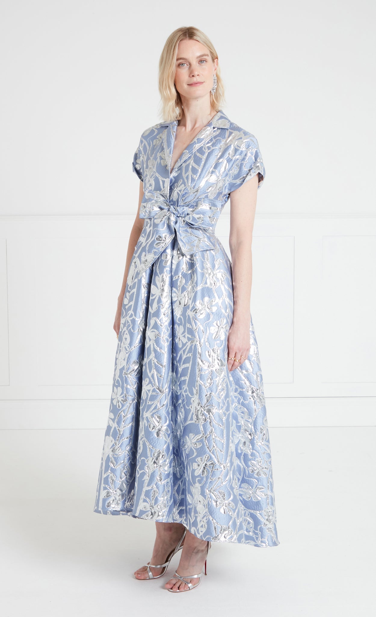 A true statement gown, the Frankel Dress features an opulent gold leaf pattern in a metallic lurex jacquard weave, blending modern glamour with regal sophistication.
