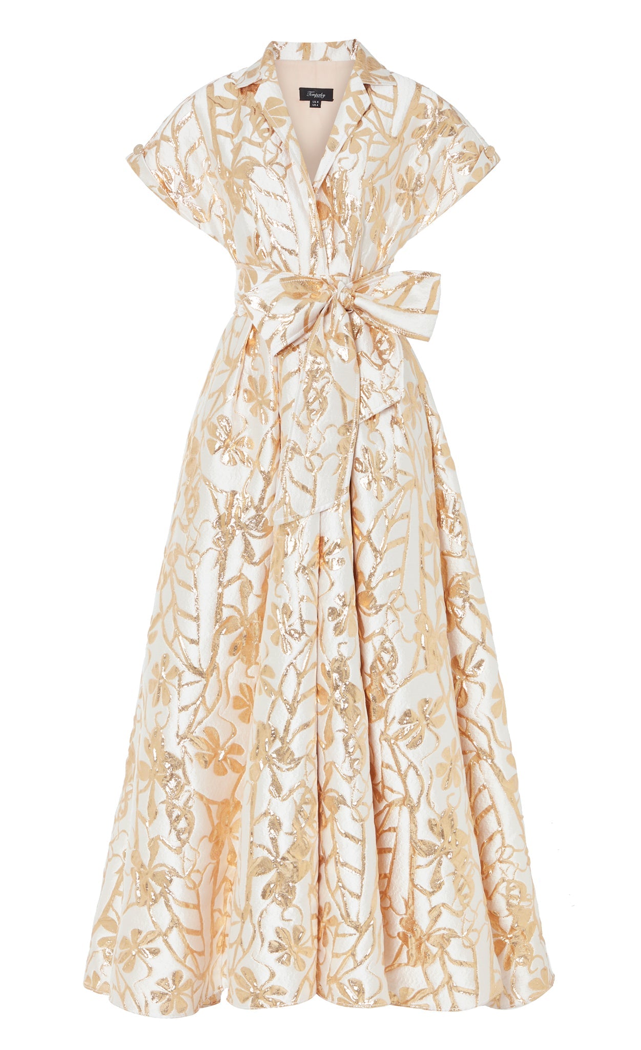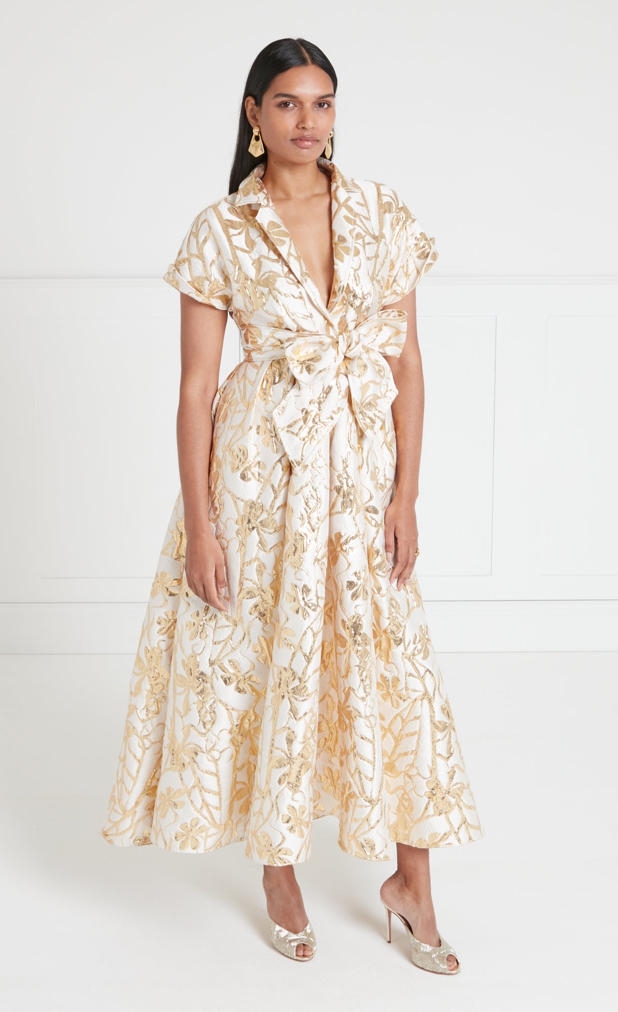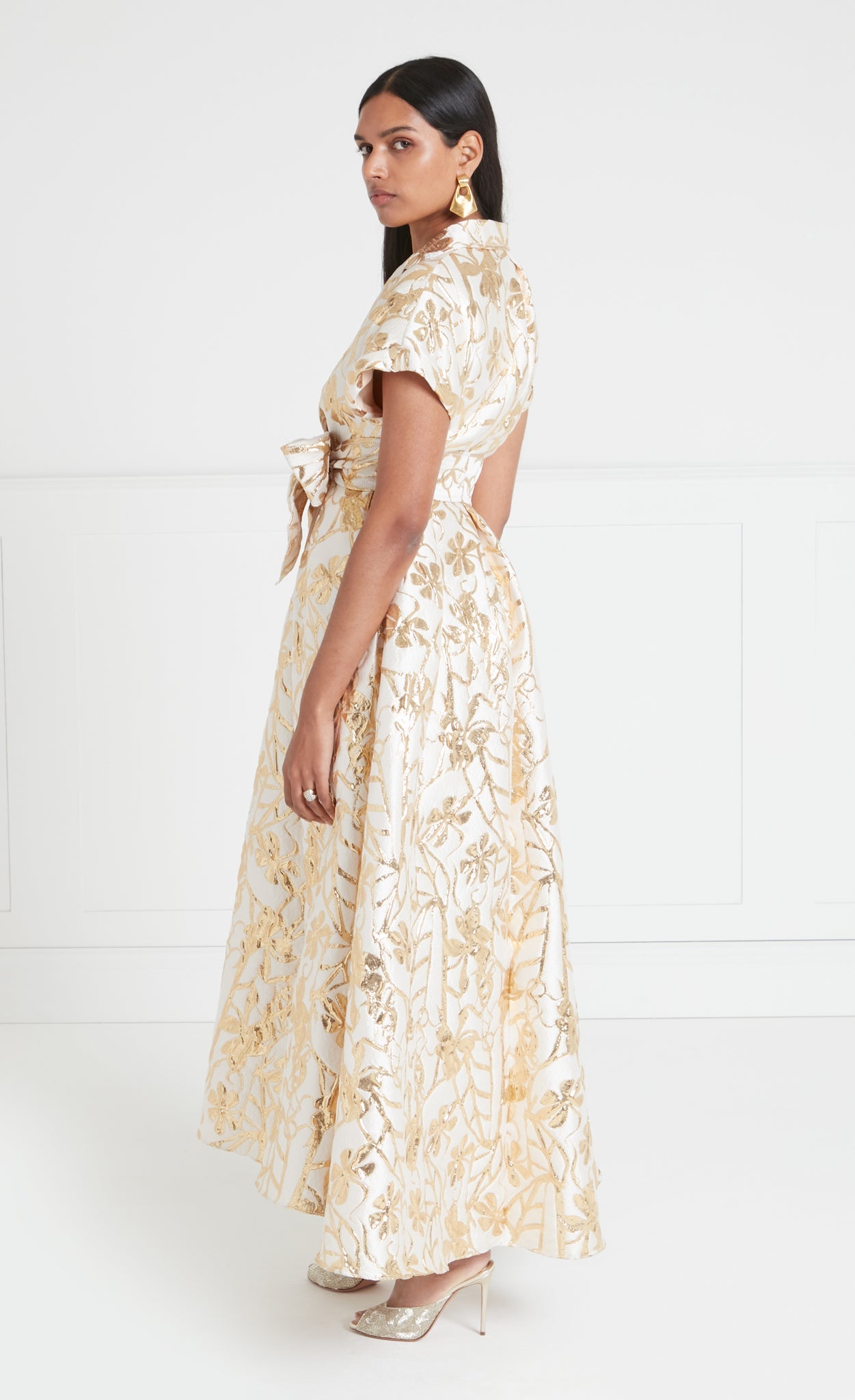 A true statement gown, the Frankel Dress features an opulent gold leaf pattern in a metallic lurex jacquard weave, blending modern glamour with regal sophistication.