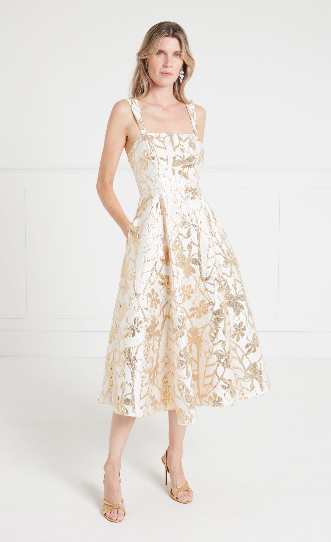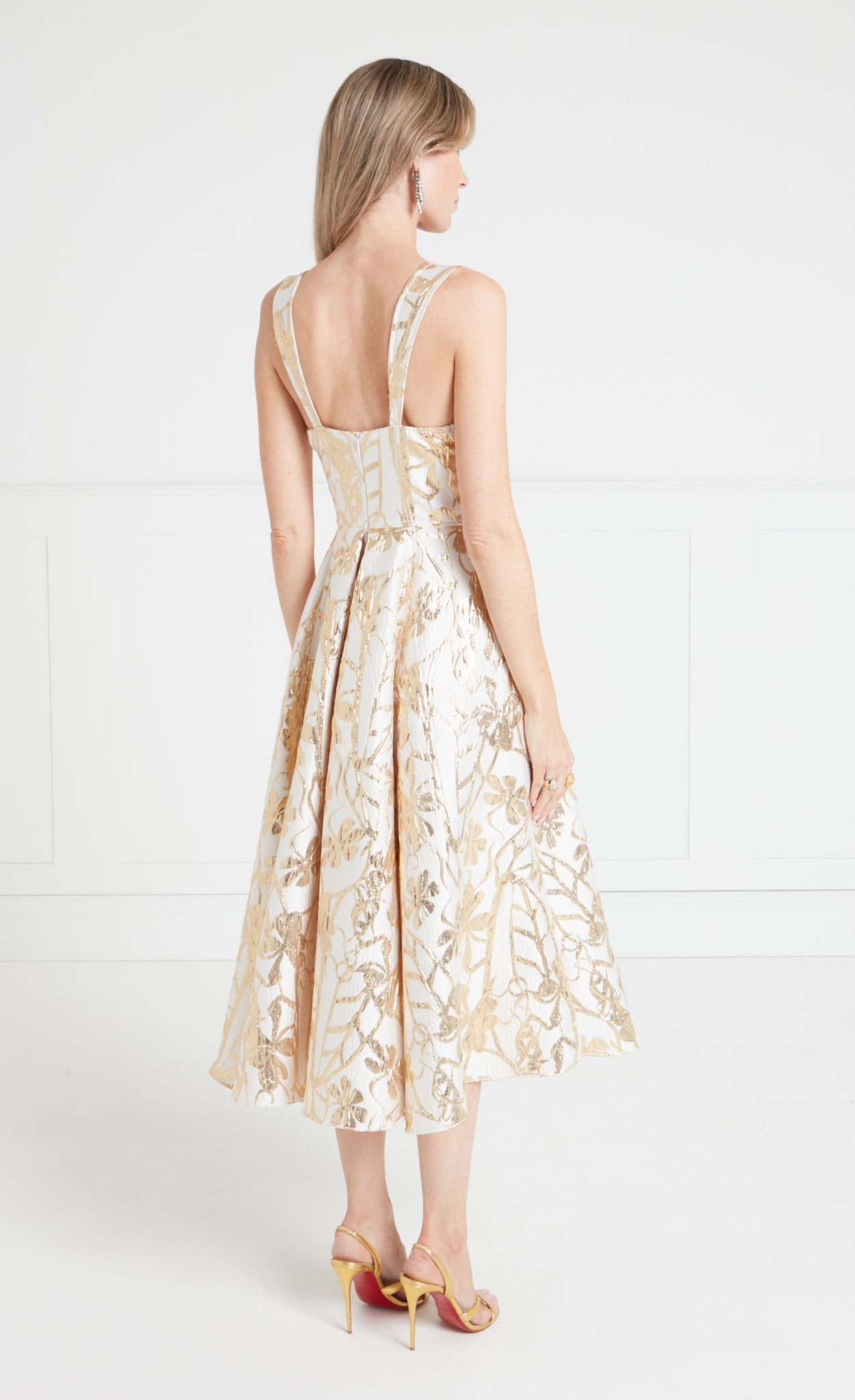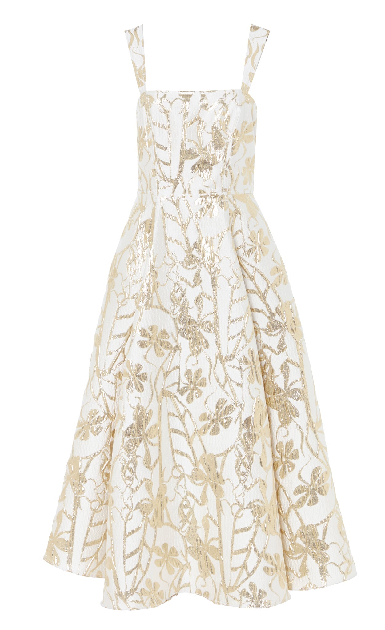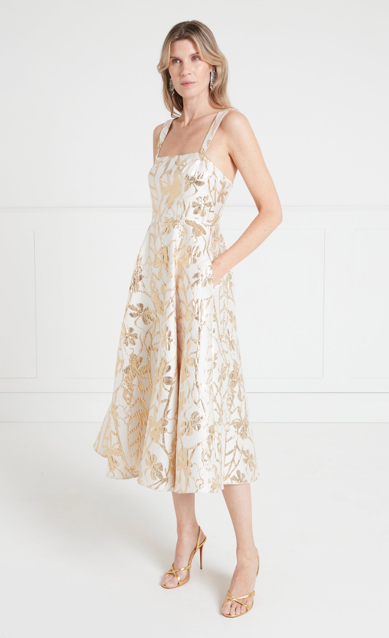 The Frankel Strappy Dress features a gold leaf pattern in a lurex jacquard weave, blending modern glamour and classic femininity.