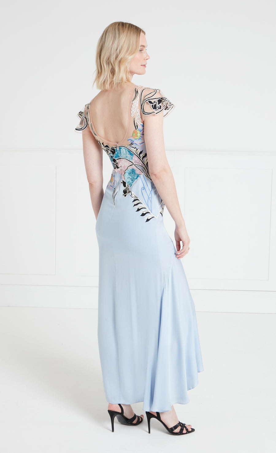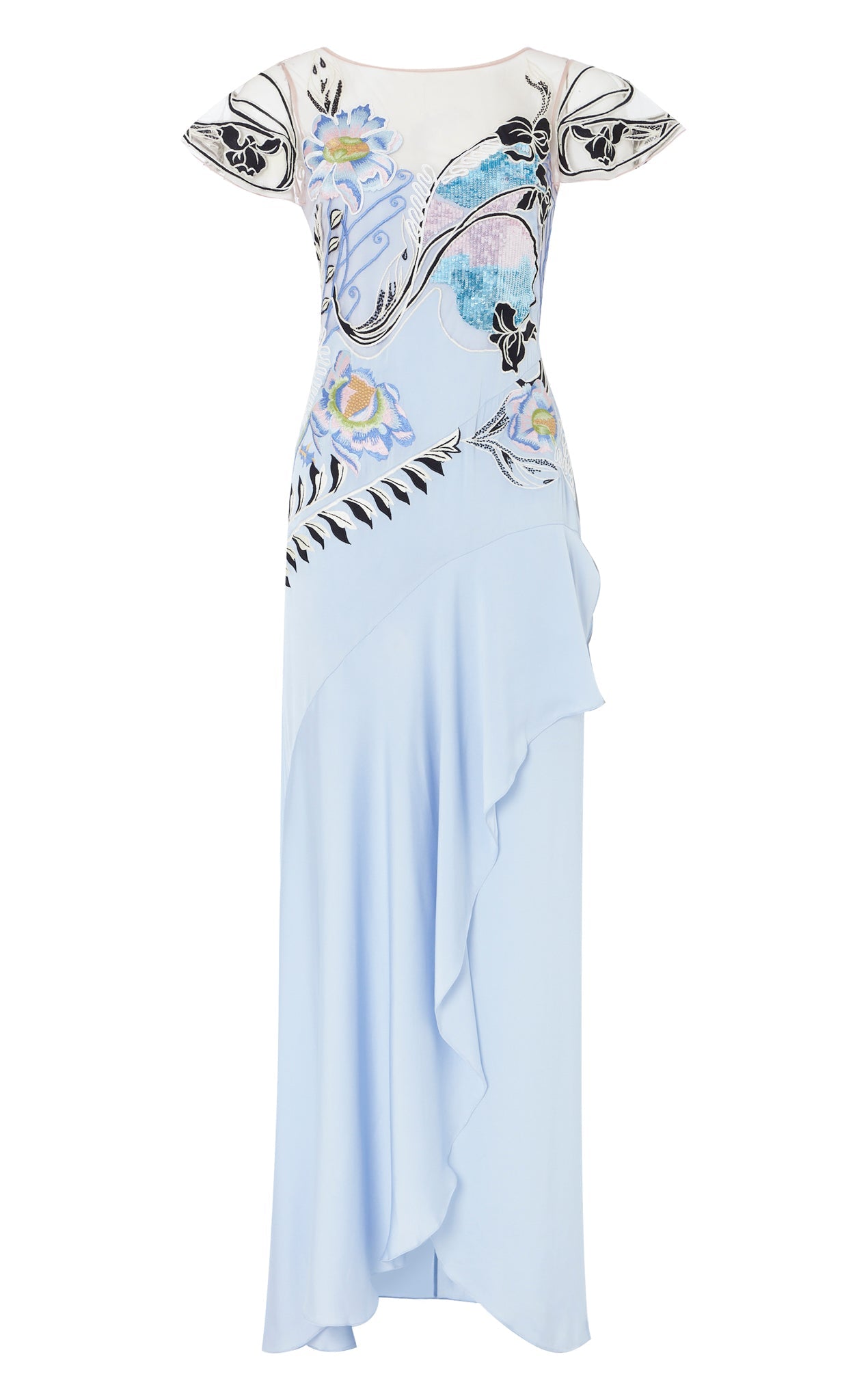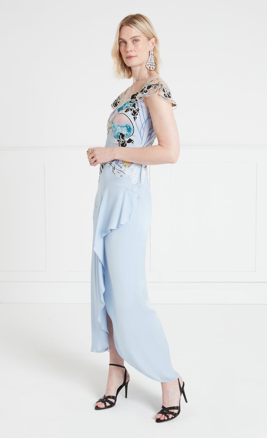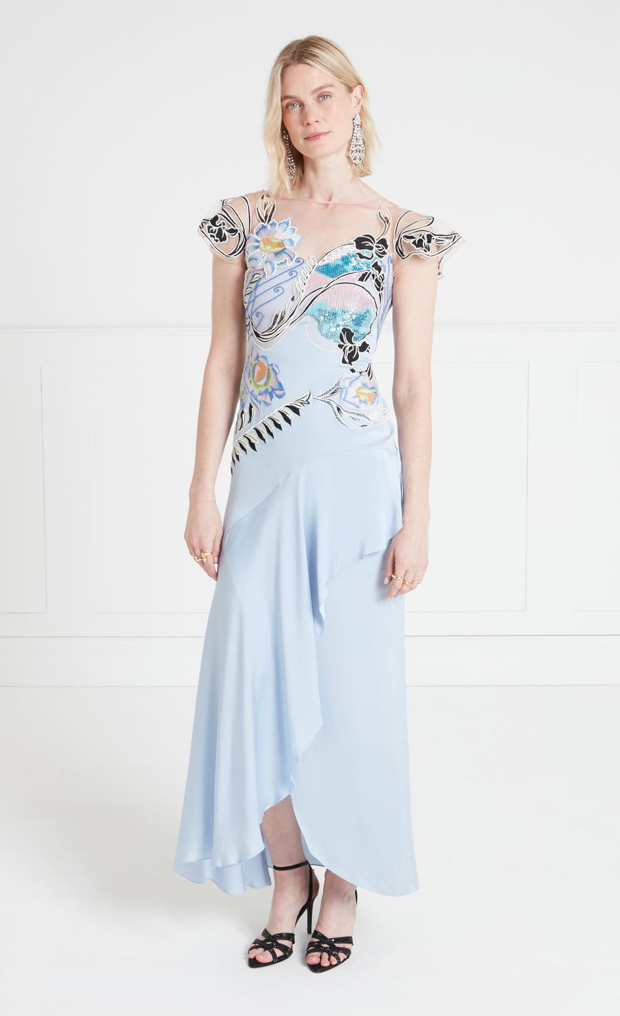 The asymmetric Gracia Ruffle Gown is designed to make an entrance. The bodice is intricately decorated with a blend of stitch and sequin embroidery, featuring large, bold floral motifs that draw inspiration from the decorative and ornate style of Spanish Art Nouveau.