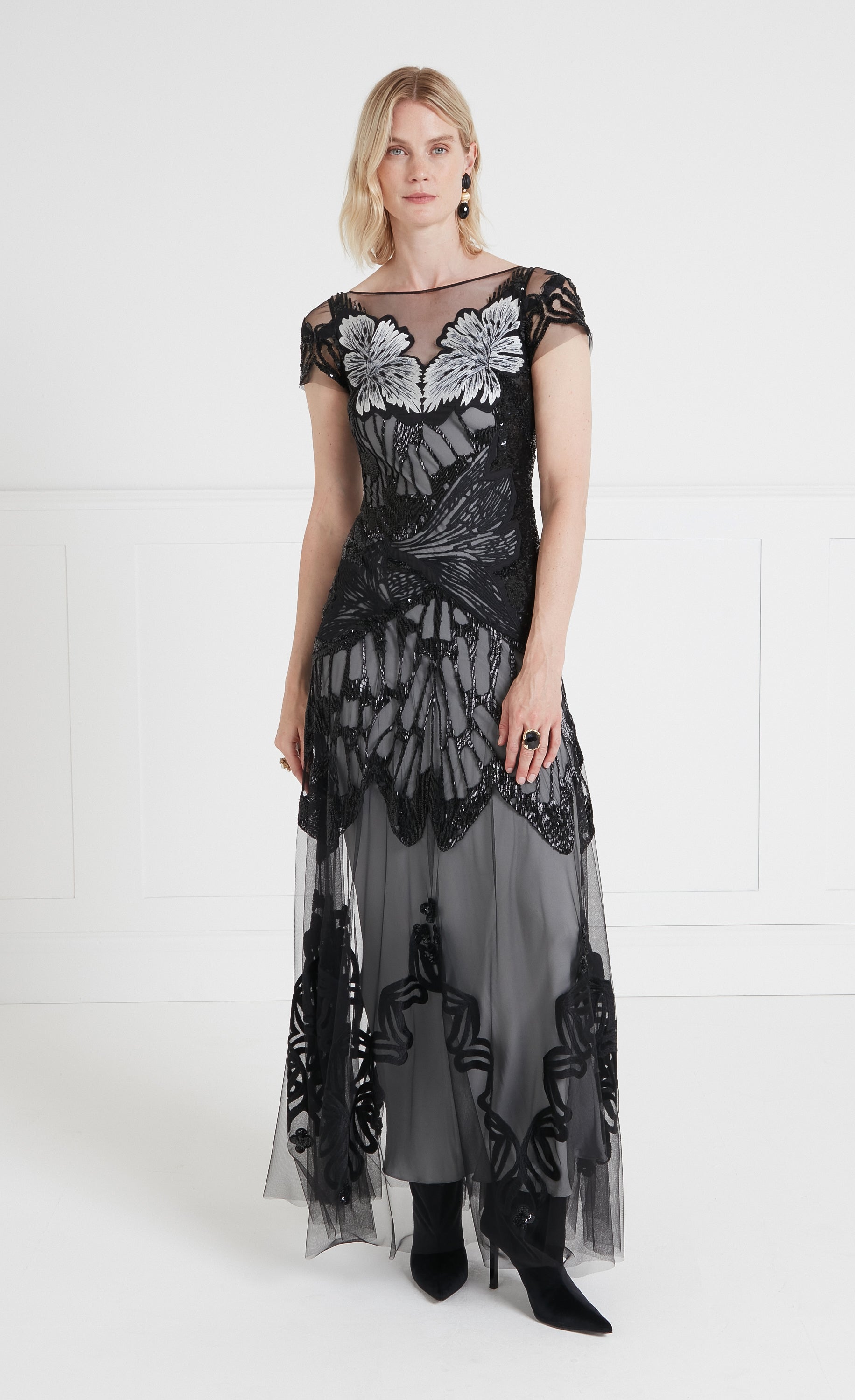 A striking interpretation of the metamorphosis that weaves its way through this collection, the Inez dress expresses the theme through a spectral fusion of florals, entwined at the waist for elegant definition. Enhancing the silhouette, oversized blooms and moth wing embellishments adorn the semi-sheer Italian tulle, overlayed atop a classic column style, rendered in hand-beading and appliqu¨¦ embroidery.