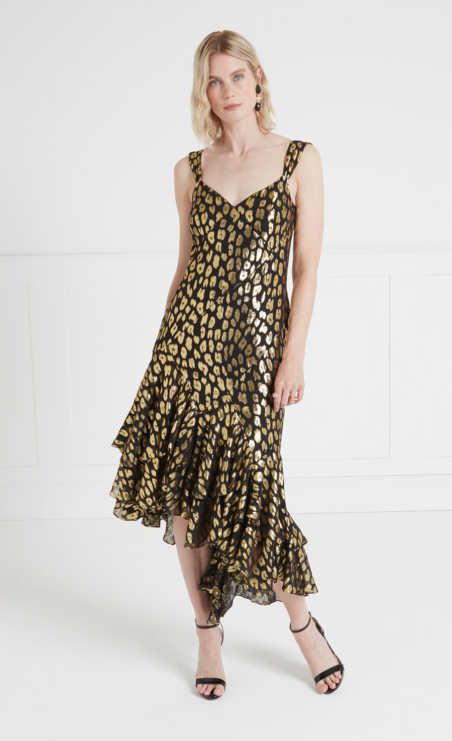 The Kyra Strappy Dress is entirely captivating. Encapsulating the exuberance of a night to remember, perfectly bias-cut to cinch at the waist, with ribbons straps flowing to a soft sweetheart neckline and daring low back, a skimming bias-cut silhouette cascading to tiers of flamboyant asymmetric ruffles.