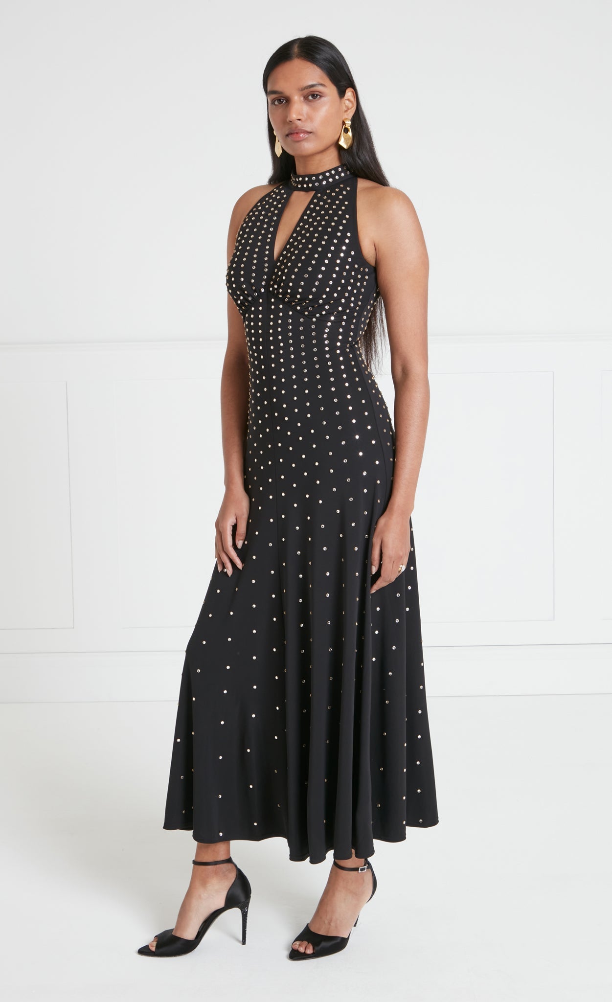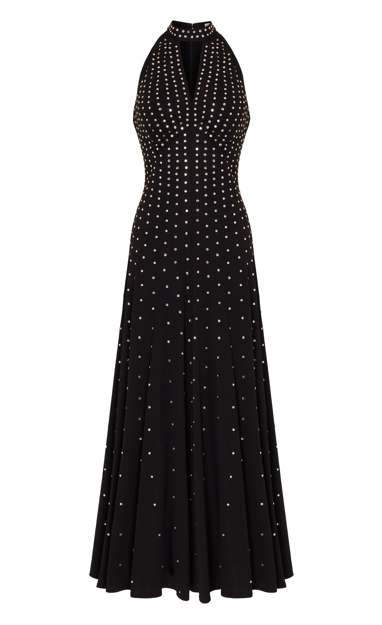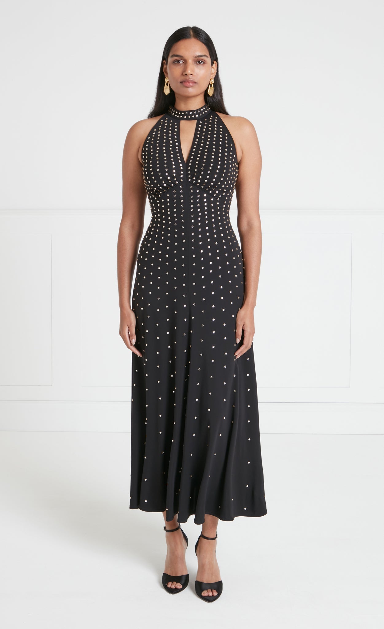 The Loretta halter dress is a glamorous party showpiece with a high neckline to amplify the cascading crystal embellishment.