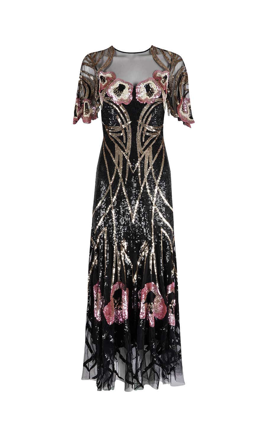 The Natalia Gown is a standout dress with contouring and interlacing lines of sequins, framing the figure beautifully. Bordered with tessellating neck and hemlines of dahlias, it is finished with a hand cut scallop edge to the sleeves. Conveneniently bra friendly as the open back detail ends mid way above the waist.
