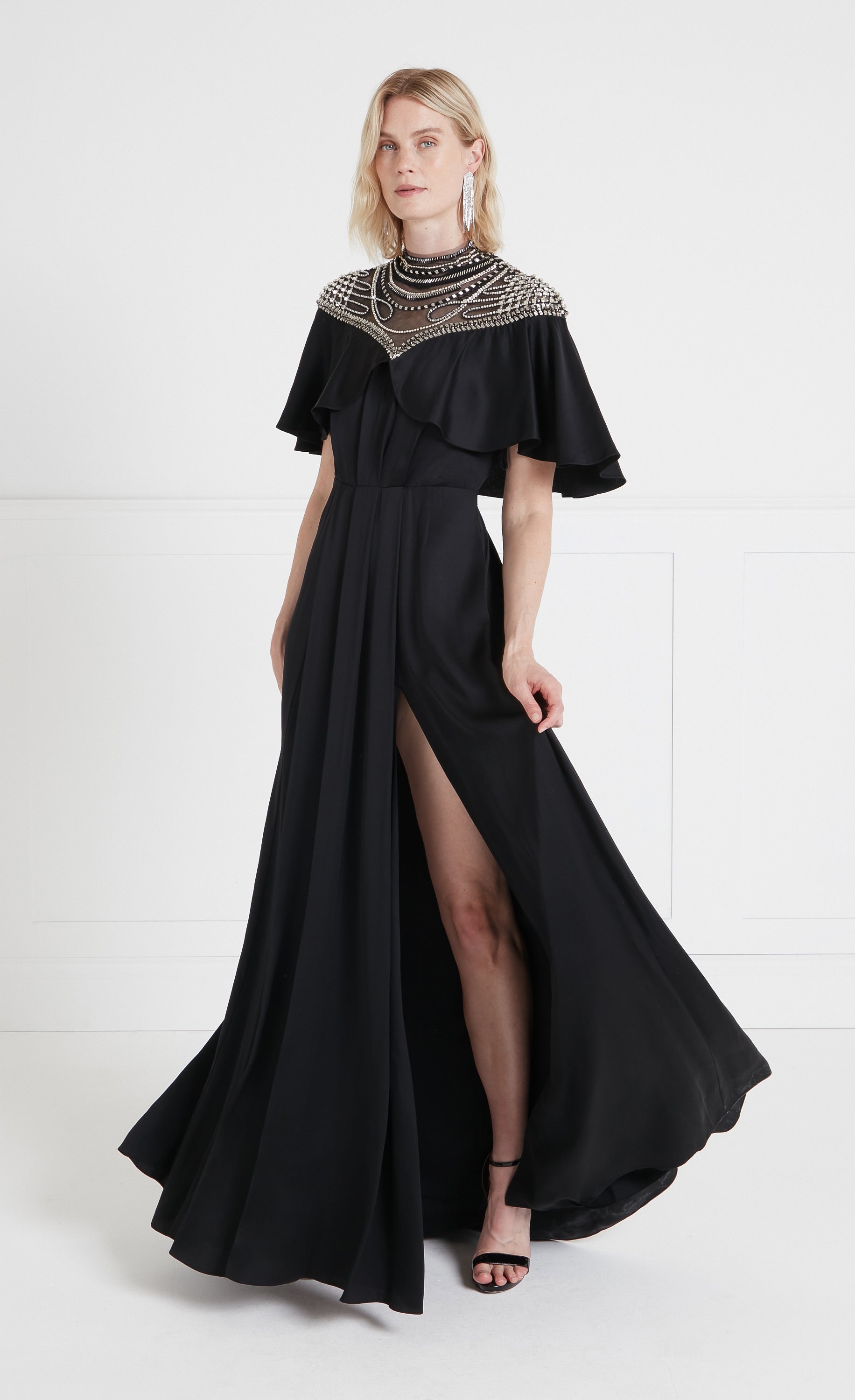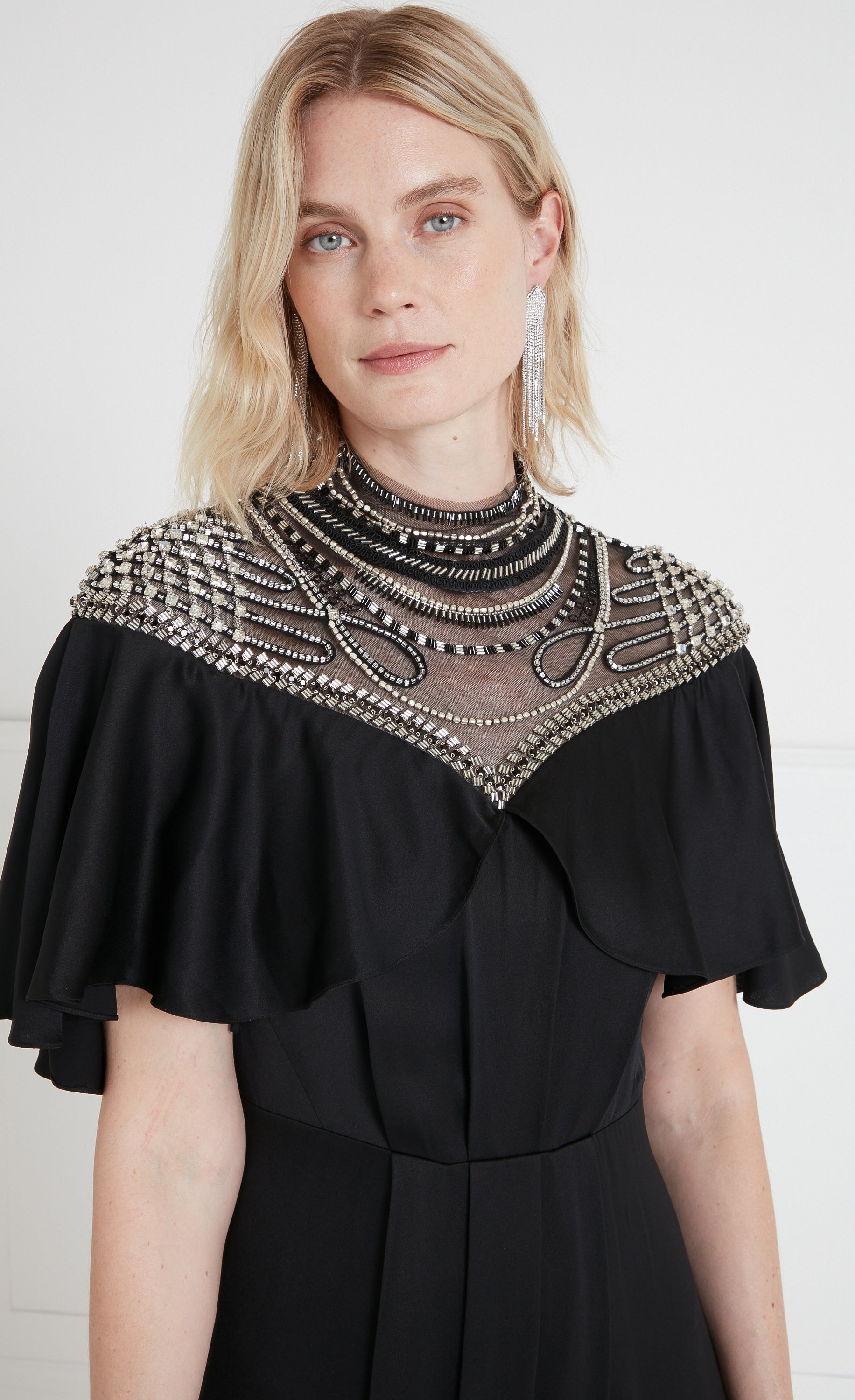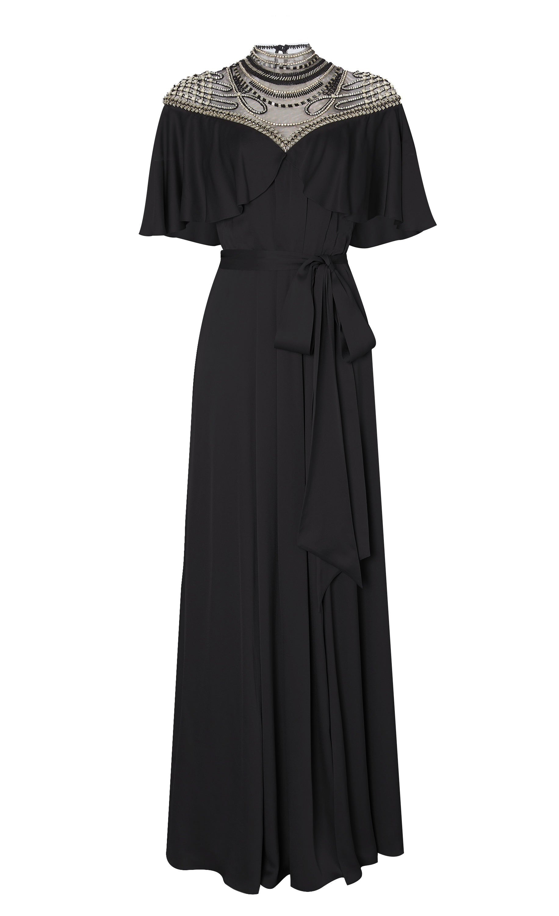 Paying homage to the eveningwear of the escapist era, the focal point of the Nina dress is the exquisite embellished yoke panelling: delicate beadwork on soft Italian illusion tulle contouring the d¨¦colletage, neck and shoulders, fastened with buttons at the spine. Stunning draping, creating a cape-like ruffle from the Bardot neckline, flowing to the floor-length hem, gives it an air of soft elegance.