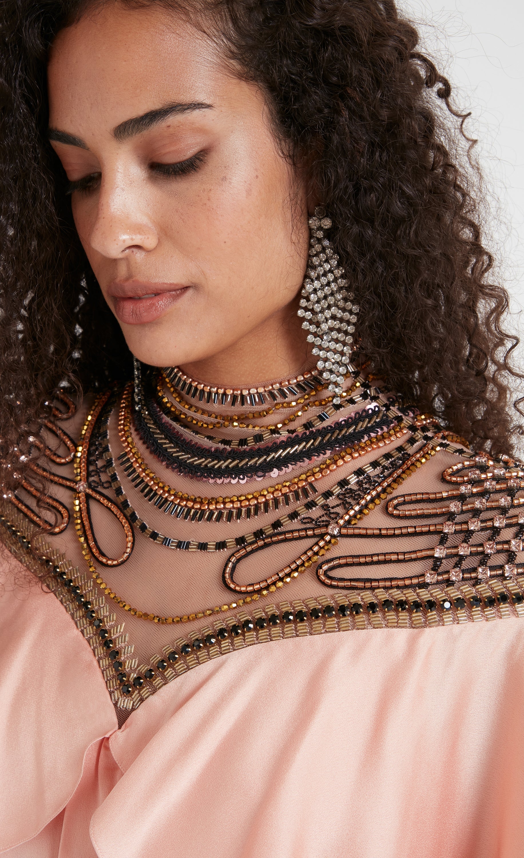 Paying homage to the eveningwear of the escapist era, the focal point of the Nina dress is the exquisite embellished yoke panelling: delicate beadwork on soft Italian illusion tulle contouring the d¨¦colletage, neck and shoulders, fastened with buttons at the spine. Stunning draping, creating a cape-like ruffle from the Bardot neckline, flowing to the floor-length hem, gives it an air of soft elegance.