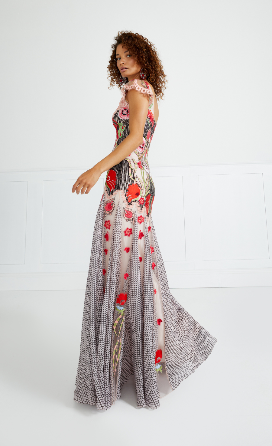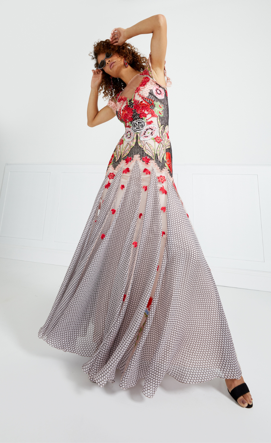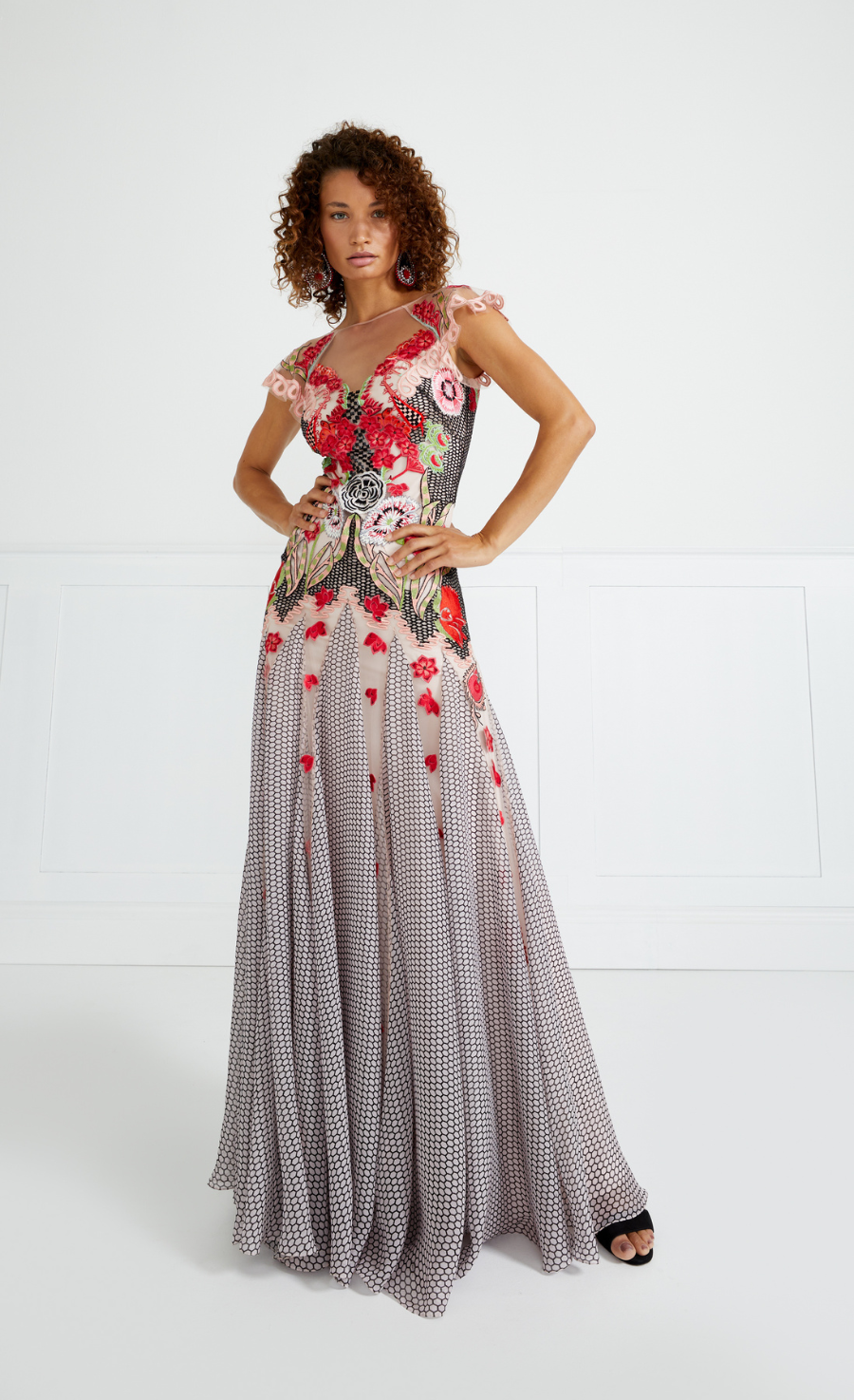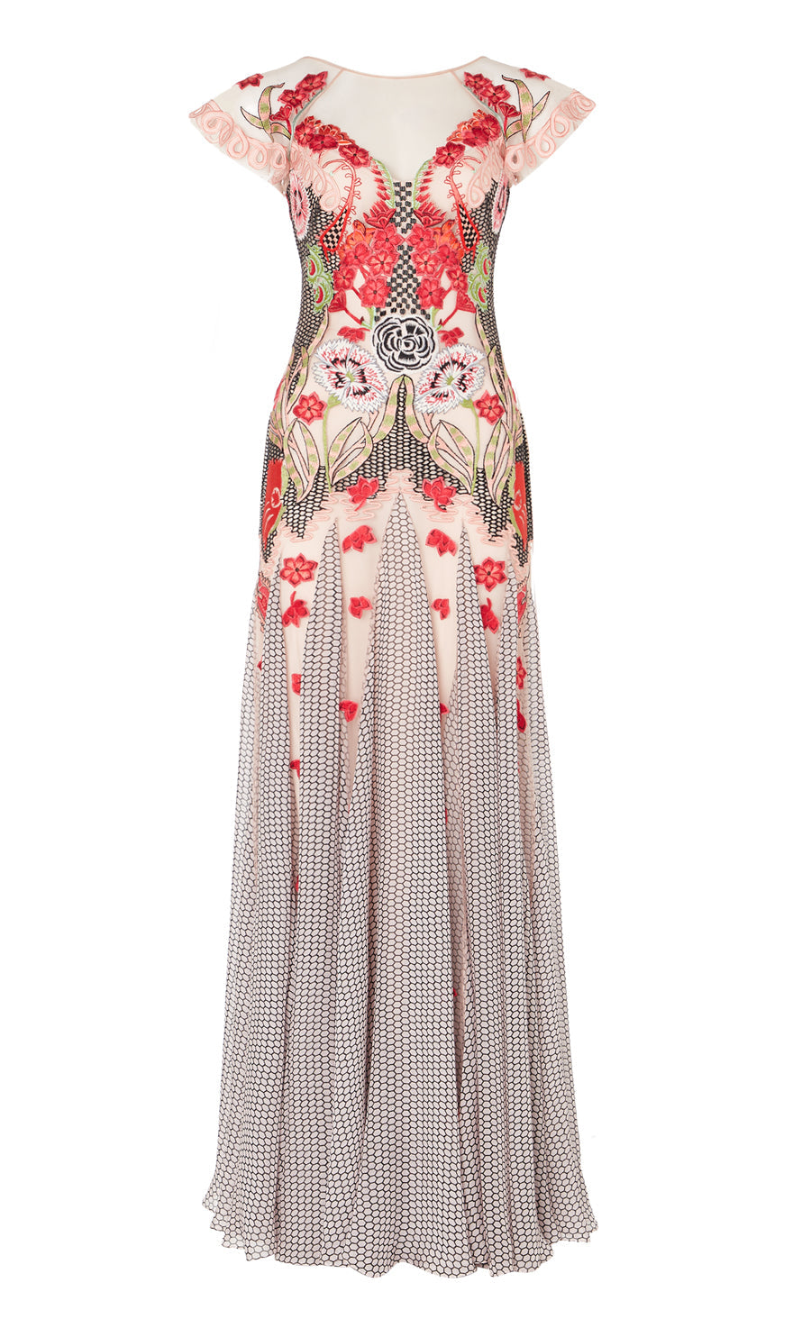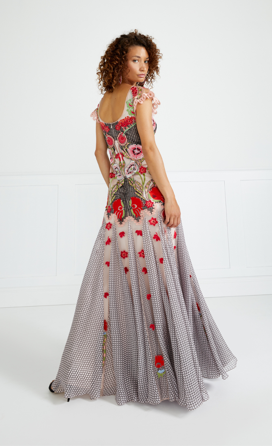 The Remi Dress is embroidered onto a soft Italian tulle with printed silk chiffon godets and with satin straps and appliqu¨¦.