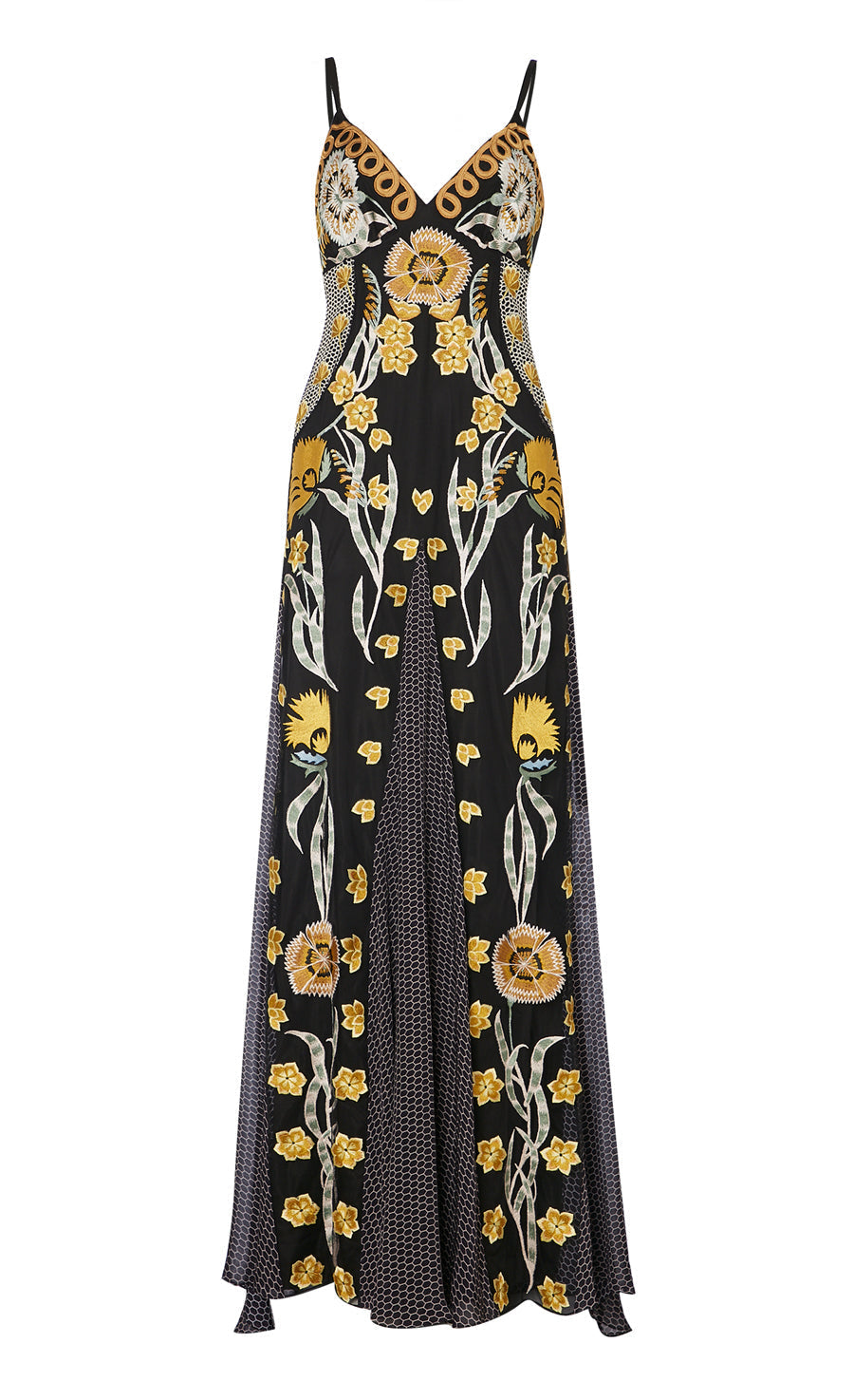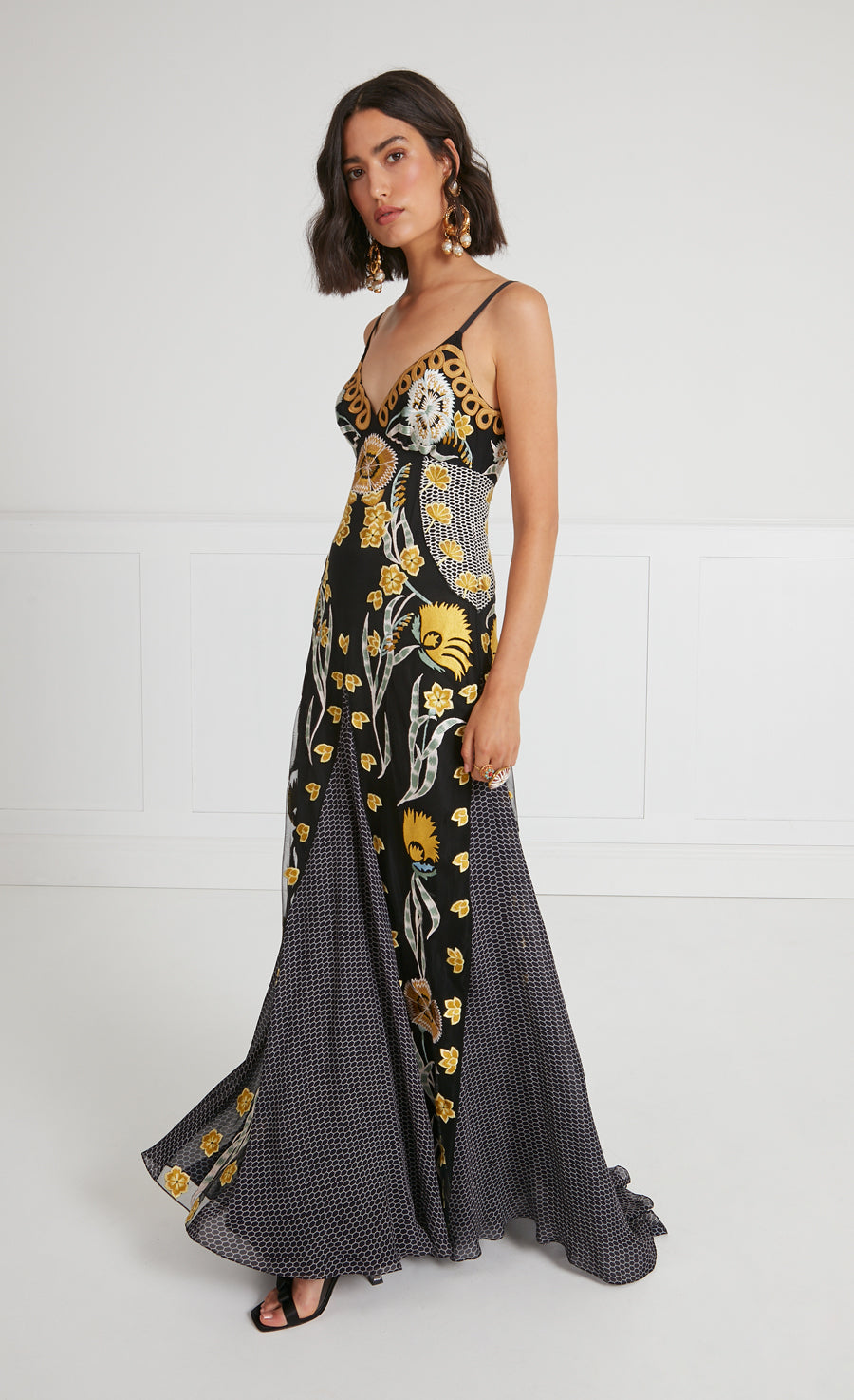 The Remi Strappy Dress lays bust and shoulders bare with satin straps and a low cut front. It is crafted from a soft Italian tulle with printed silk chiffon godets adding flare and movement to the skirt.