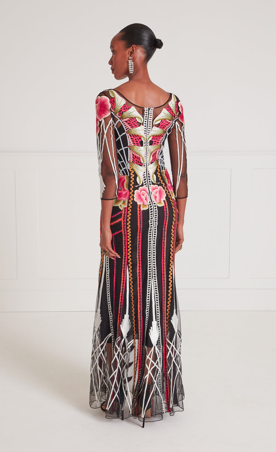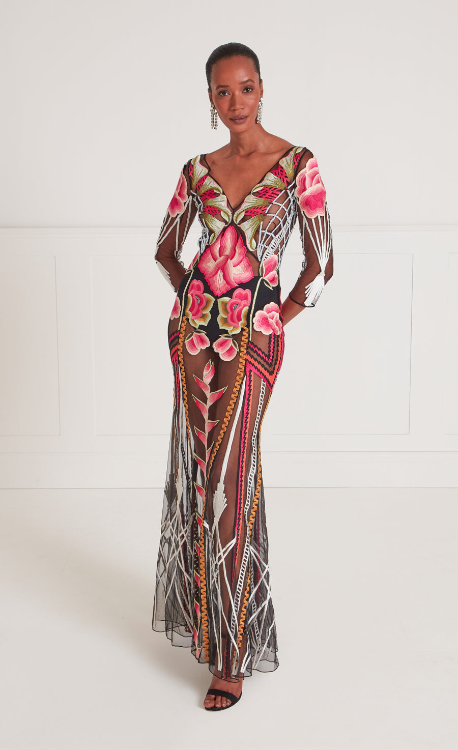 The Romina Story showcases a Temperley signature: exquisite hand-guided stitch embroidery. Composed of Pueblo florals, bouquets of ornate Calla lilies intertwine with trompe l¡¯oeil woven and lace detailing, inspired by ceremonial flowers and graphic Mexican serape blankets.