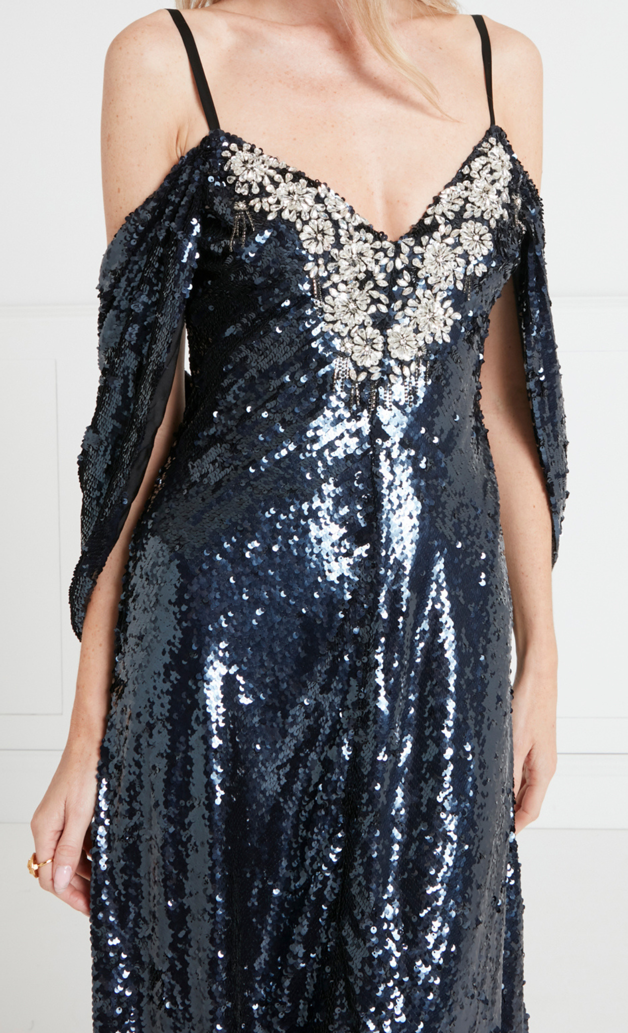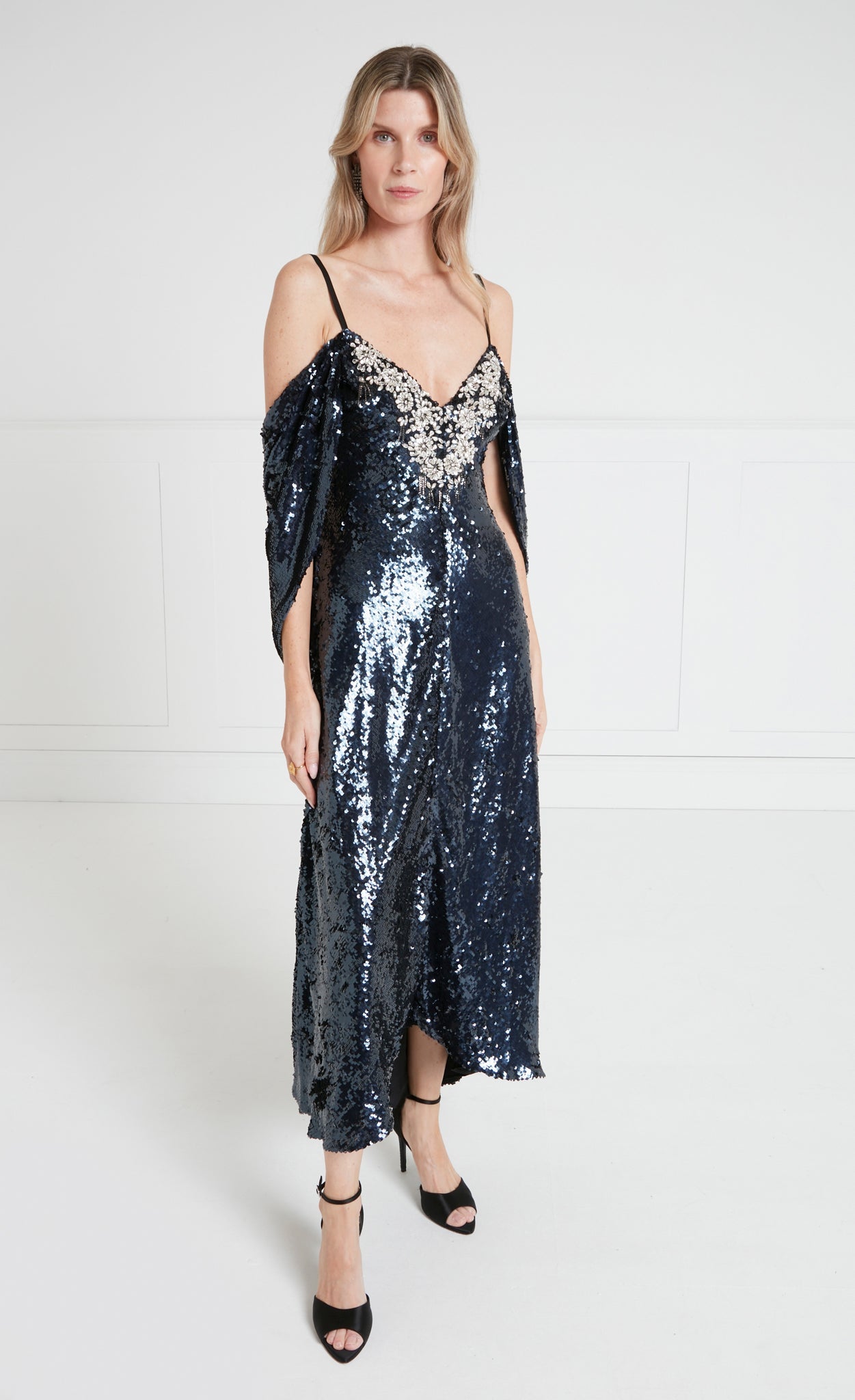 Crafted in an all-over sequinned fabric, the dress shimmers with every step. The front neckline is detailed with a geometric crystal stone design, adding an intricate detail and creating a striking focal point.