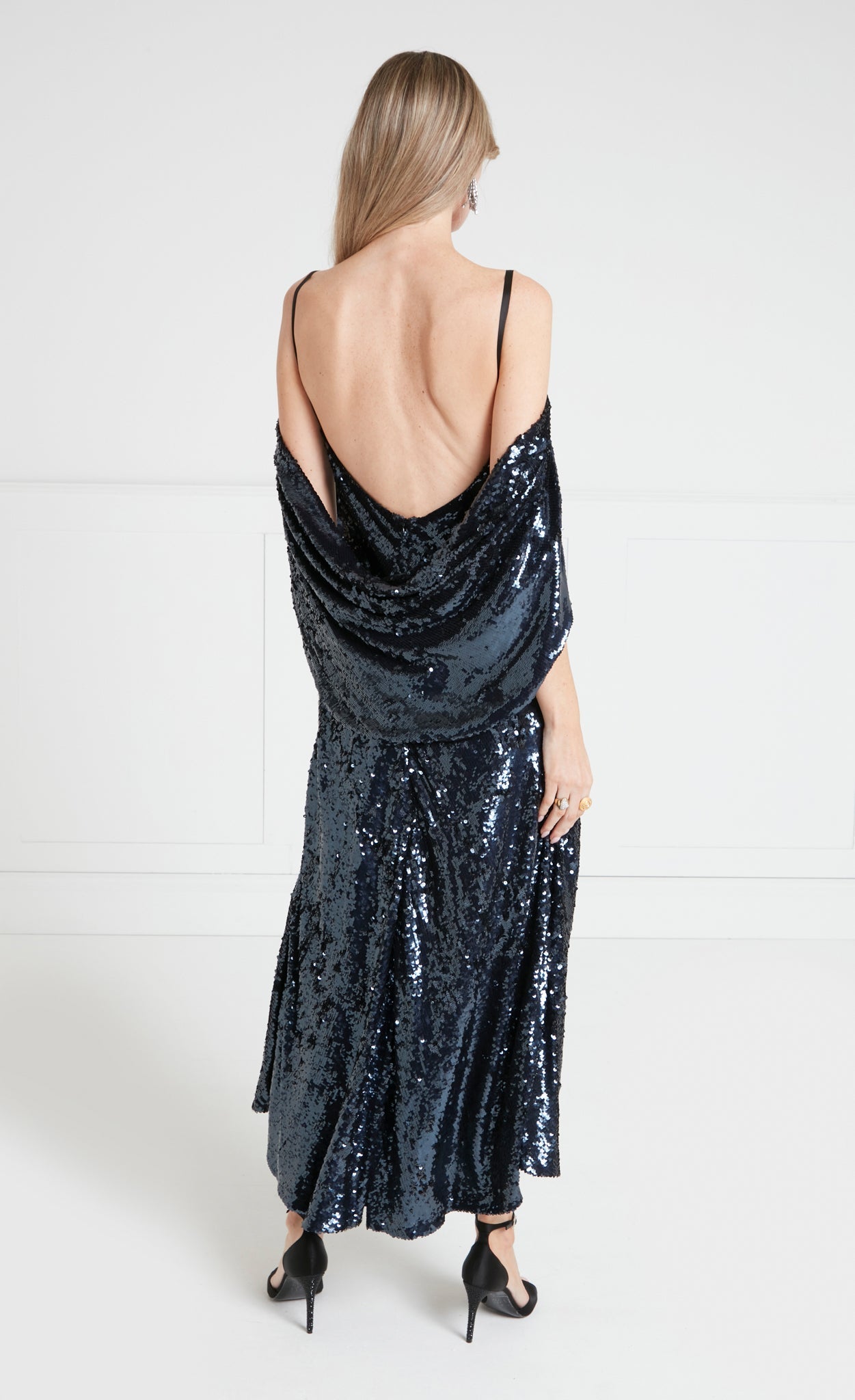 Fully embellished with shimmering sequins, the Salma Strappy Dress is designed with a sleek slip silhouette, elevated by a softly draped cape that cascades over the shoulder. The flattering A-line fit offers graceful movement, making it ideal for formal events and special occasions.