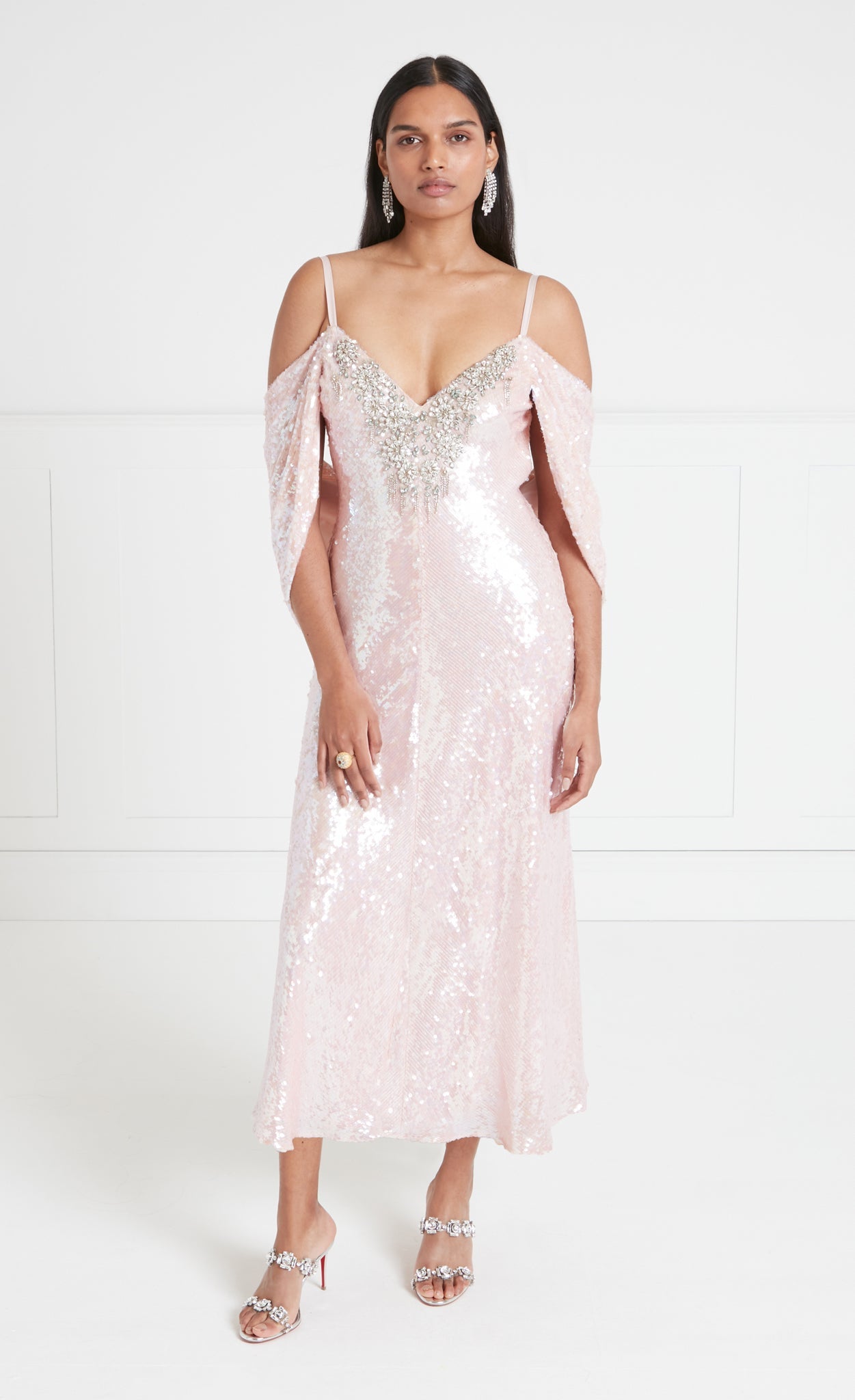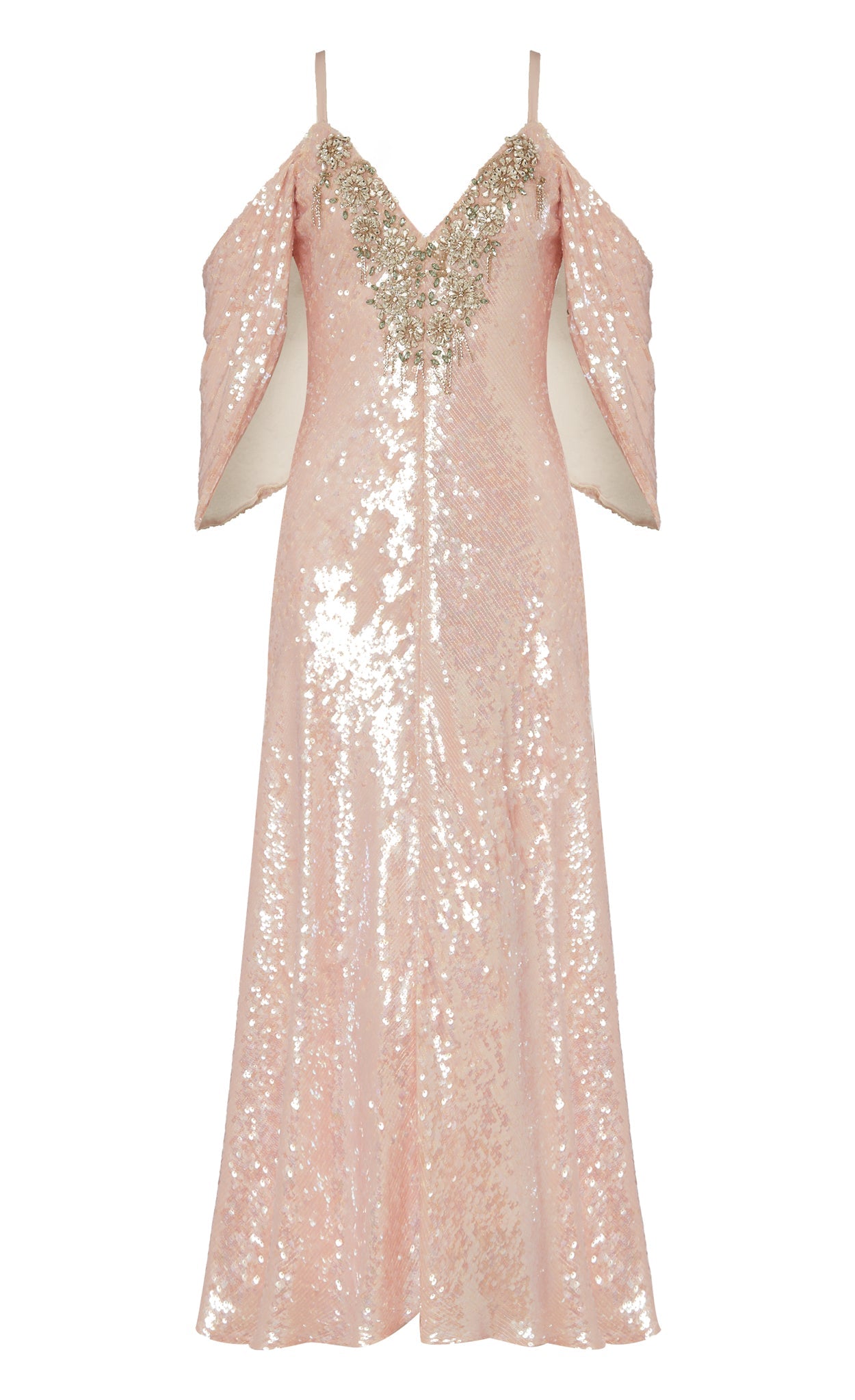 Crafted in an all-over sequinned fabric, the dress shimmers with every step. The front neckline is detailed with a geometric crystal stone design, adding an intricate detail and creating a striking focal point.
