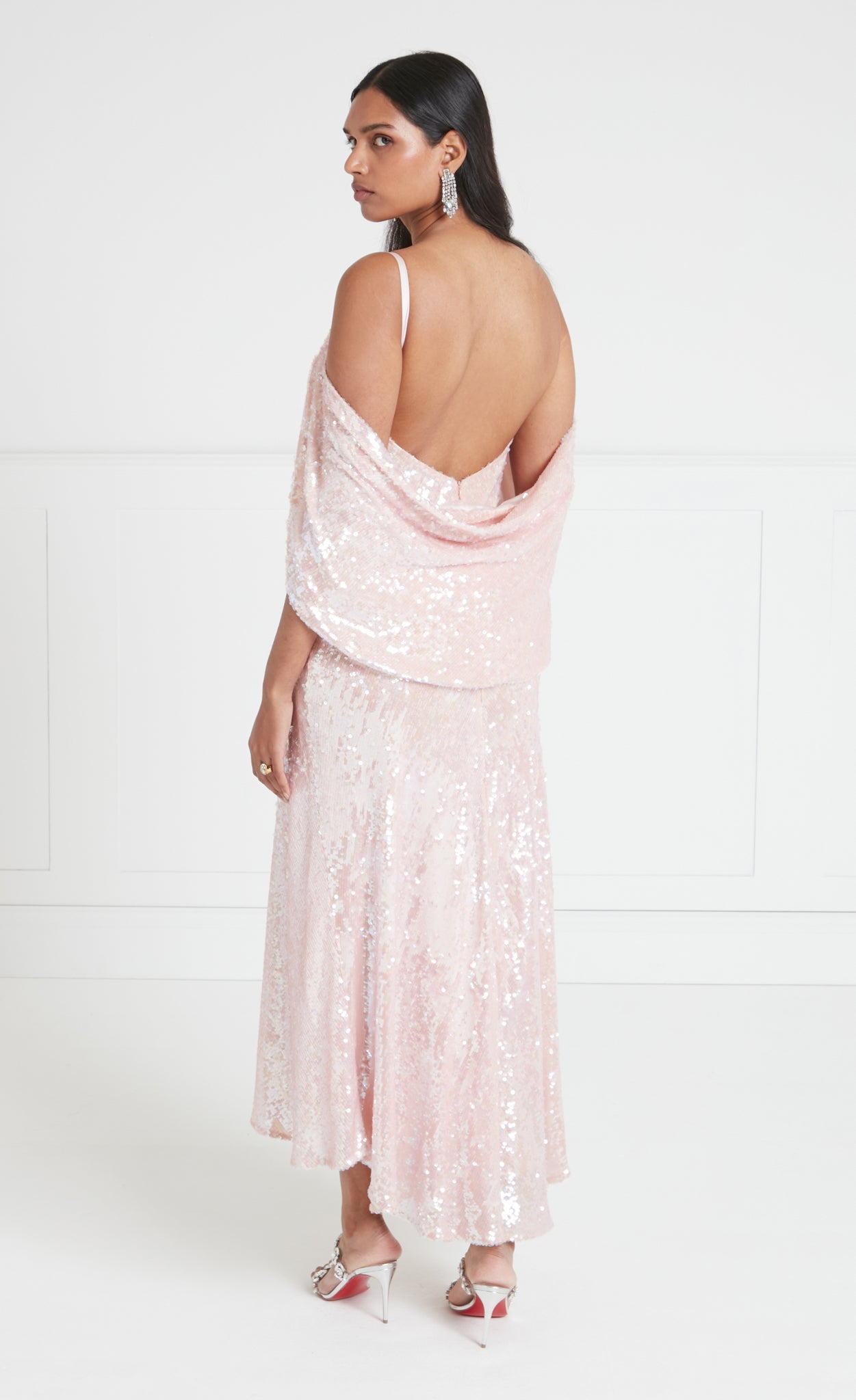 Fully embellished with shimmering sequins, the Salma Strappy Dress is designed with a sleek slip silhouette, elevated by a softly draped cape that cascades over the shoulder. The flattering A-line fit offers graceful movement, making it ideal for formal events and special occasions.