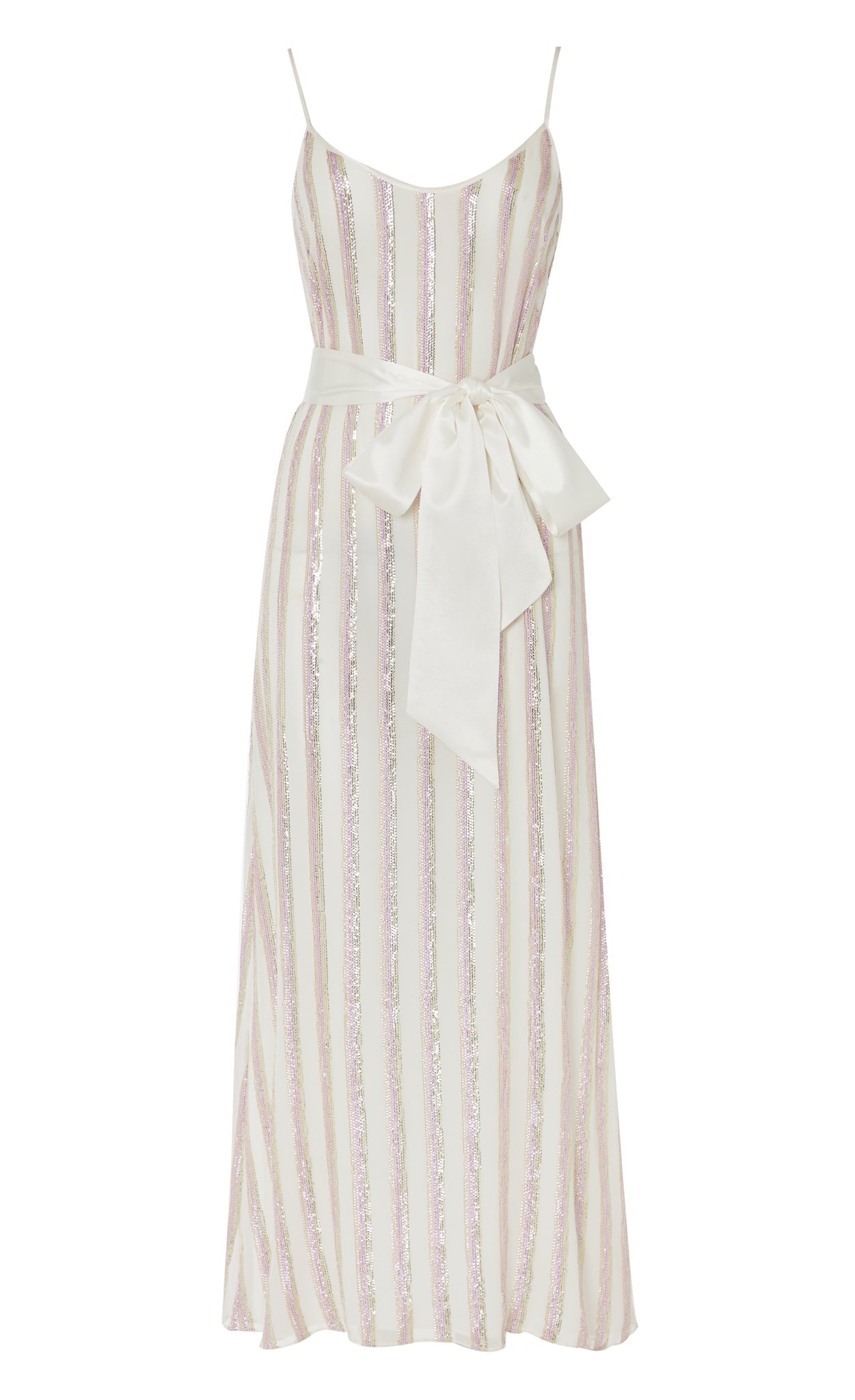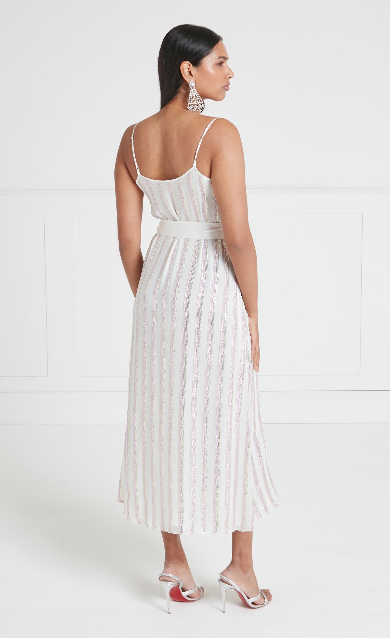 This story showcases dazzling vertical sequin stripes, applied on a lightweight georgette base that offers soft airyness and subtle fluidity. Perfect for lively evening settings or cocktail events, this dress offers effortless party-ready dressing.