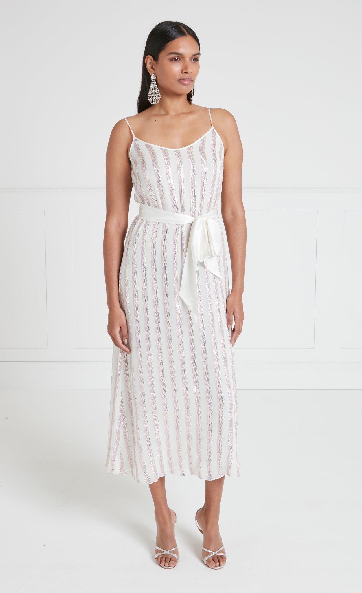 The Selena is a cocktail length slip dress with an optional satin belt to cinch the waist ¨C a simple yet flattering shape with a playful spirit, ideal for summer dressing.