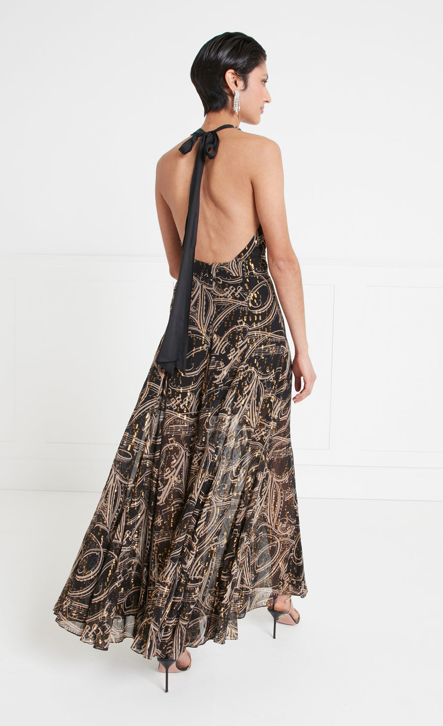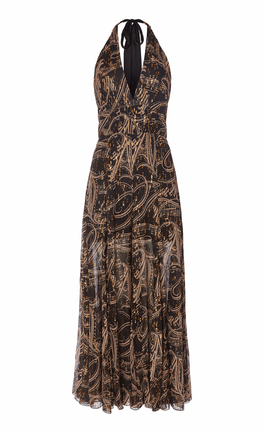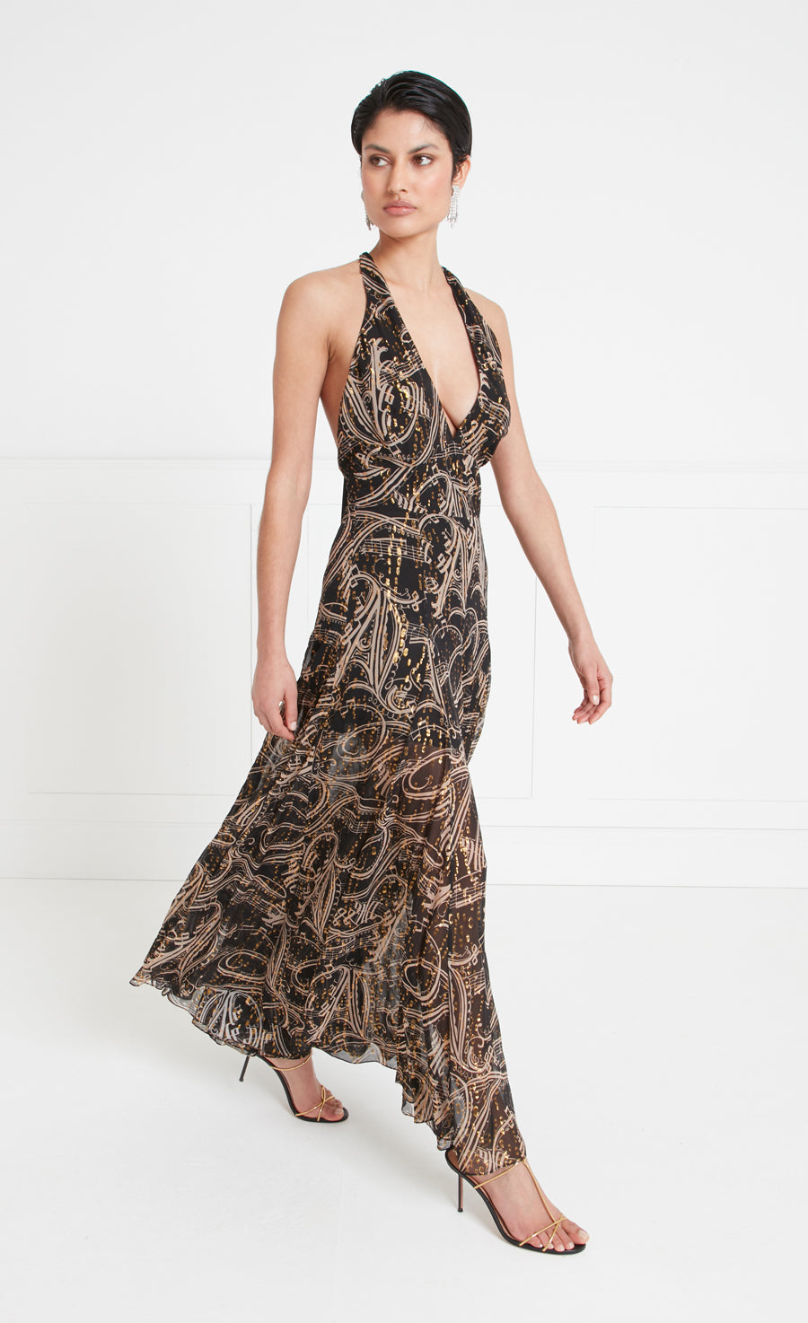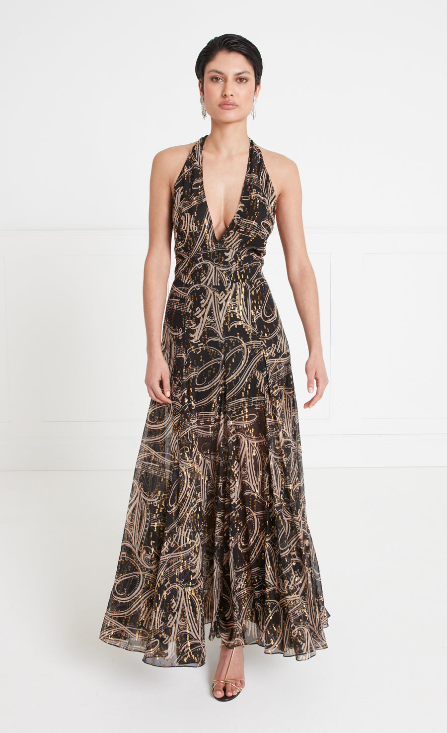 With a classic silhouette, the Silvana halter dress emphases the d¨¦colletage with a deep V-neckline, hugs the waist then flows into a full skirt for captivatingly fluid movement ¡ª just asking to be taken onto the dance floor. From the back, the silky ribbon tie flows between the shoulder blades over the low, curved hem. A picture of timeless yet convivial elegance, encapsulating the Temperley approach to a party.