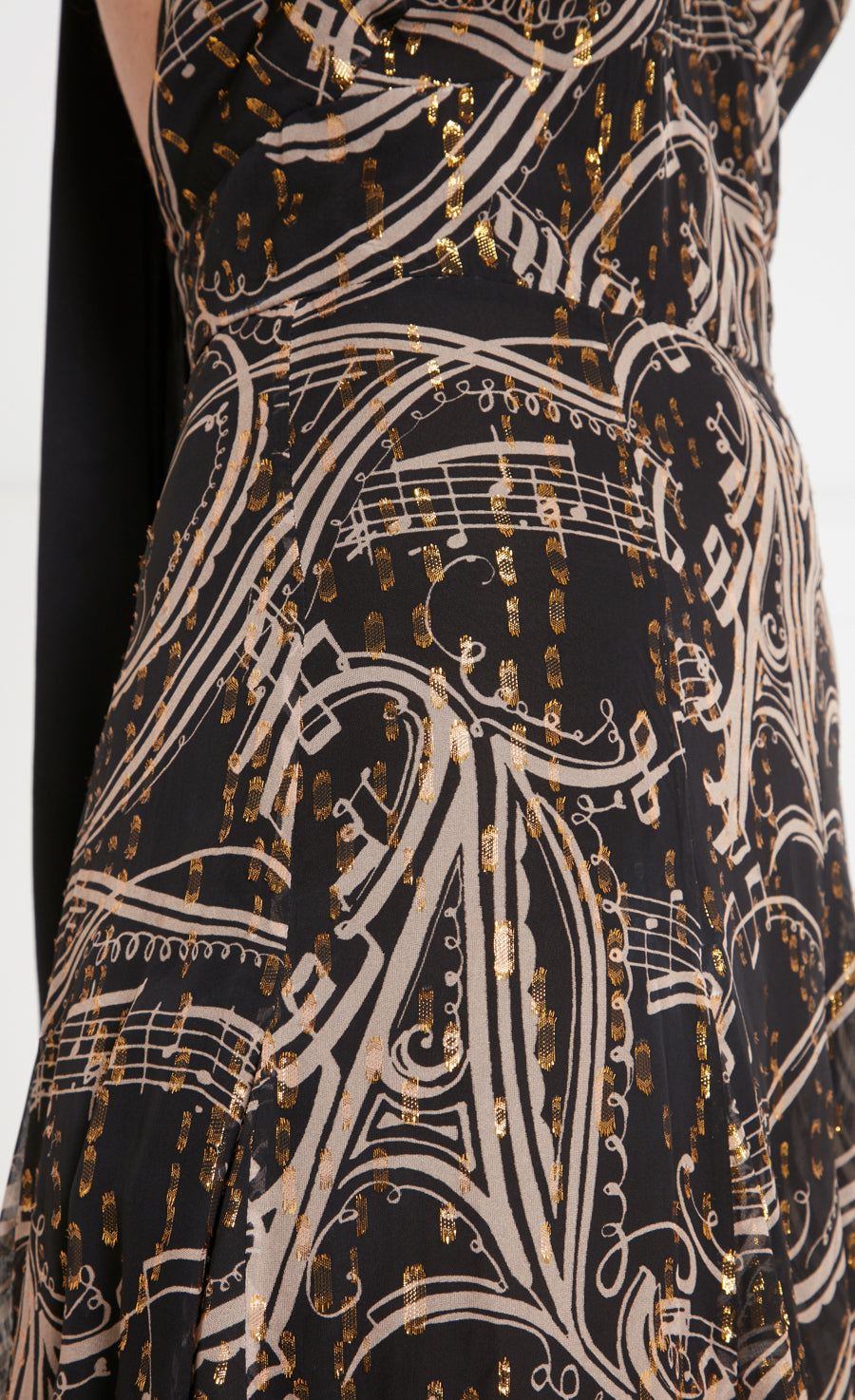 Made for sparkling at a cocktail soir¨¦e, the Silvana story features three beautiful occasionwear dresses. Showcasing a new technique for this season: a print jacquard base overlaid with manuscript-style embellishment. The gold-flecked fil coup¨¦ fabric is printed with calligraphy artwork ¡ª hand-painted ¡®As¡¯ and ¡®Ts¡¯ are interwoven with music scores, finished with sequinned vine-like motifs, inspired by the Tudor Rose.