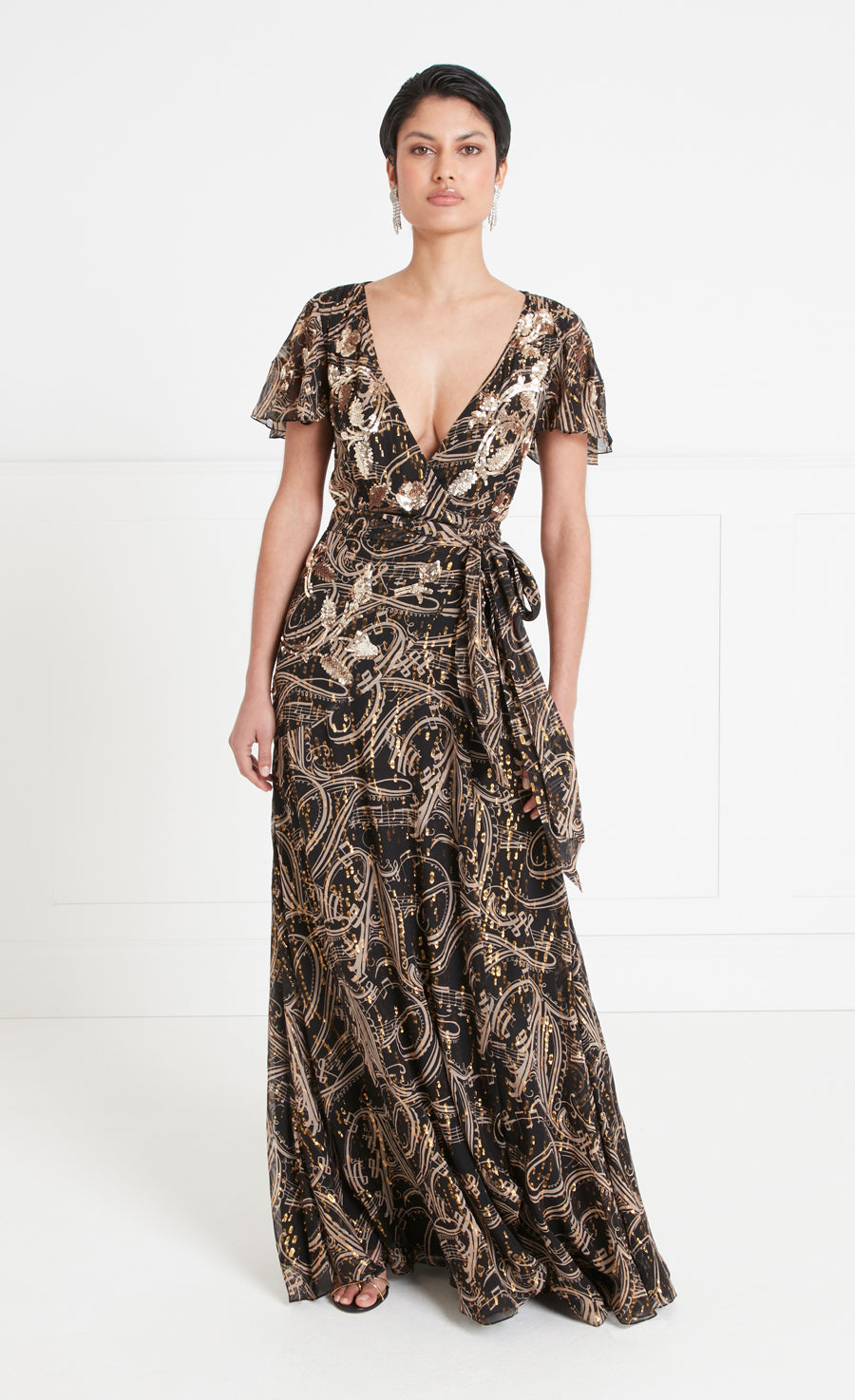 Exuding a potent femininity, the Silvana wrap dress is effortlessly bold and glamorous the classic silhouette emphasising the form, with short semi-sheer sleeves and a perfect V-neckline, cinched at the waist with a bow, flowing into a full skirt for captivatingly fluid movement. A picture of timeless yet convivial elegance, encapsulating the Temperley approach to a party.
